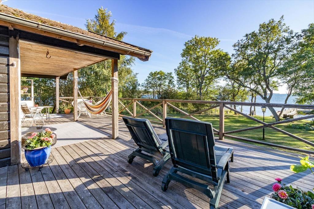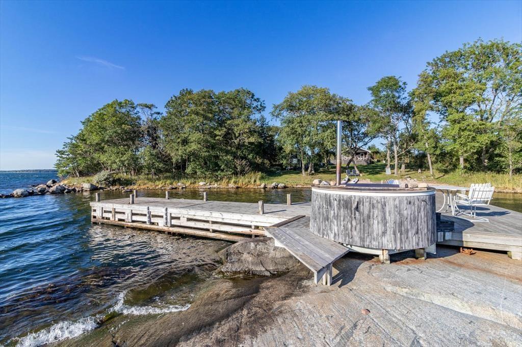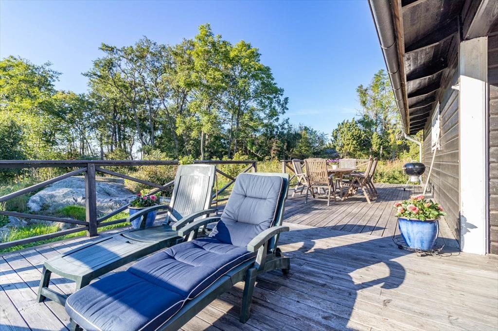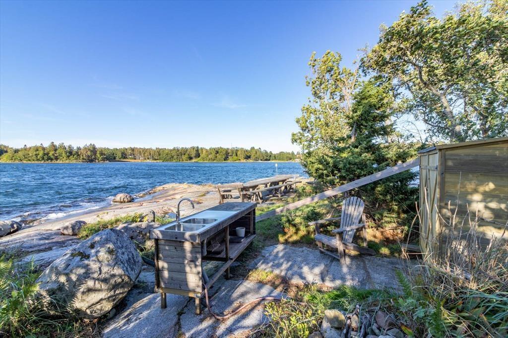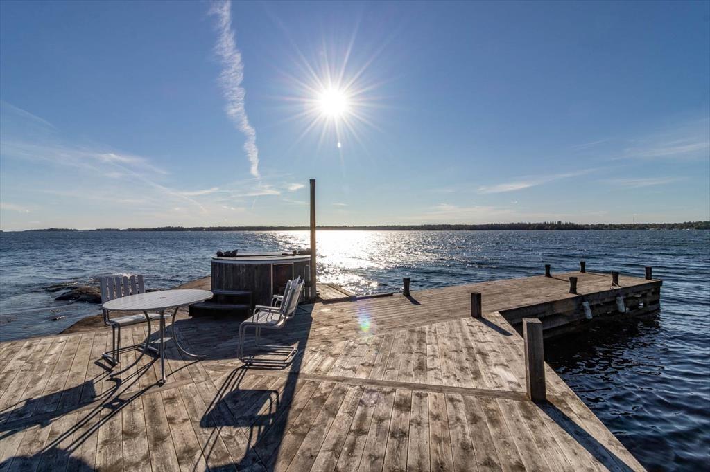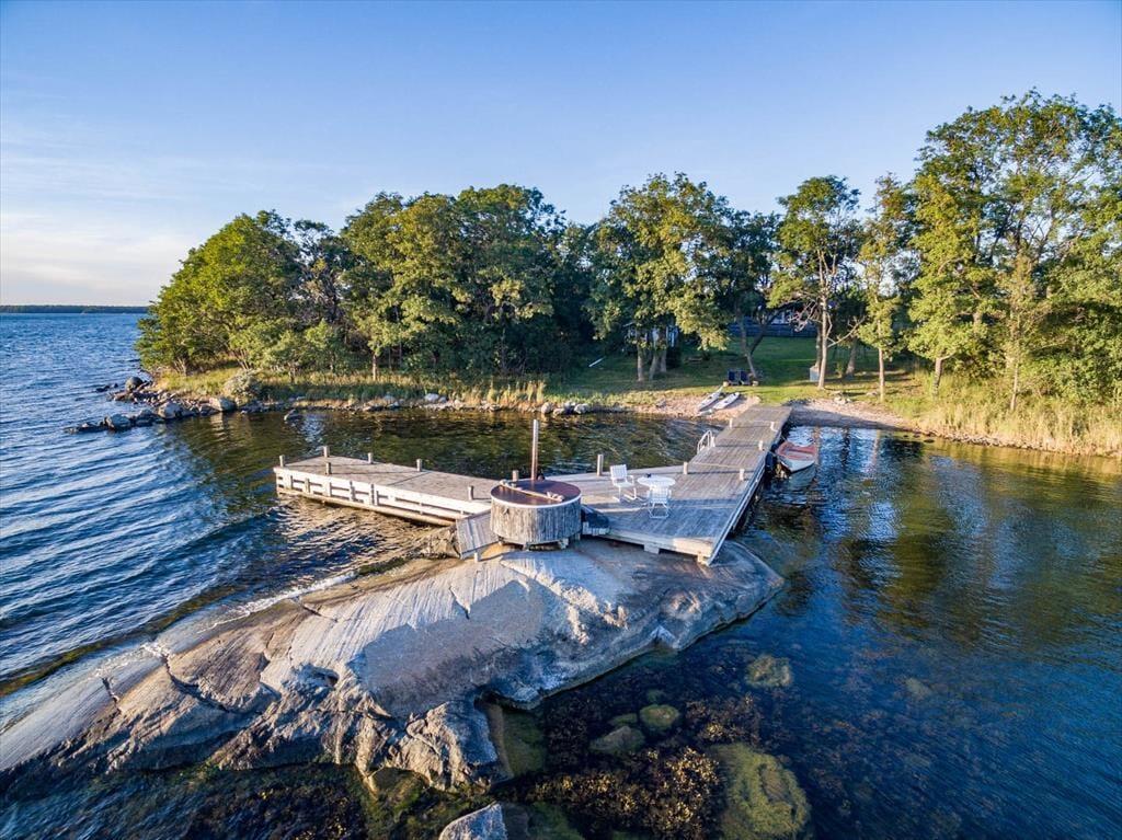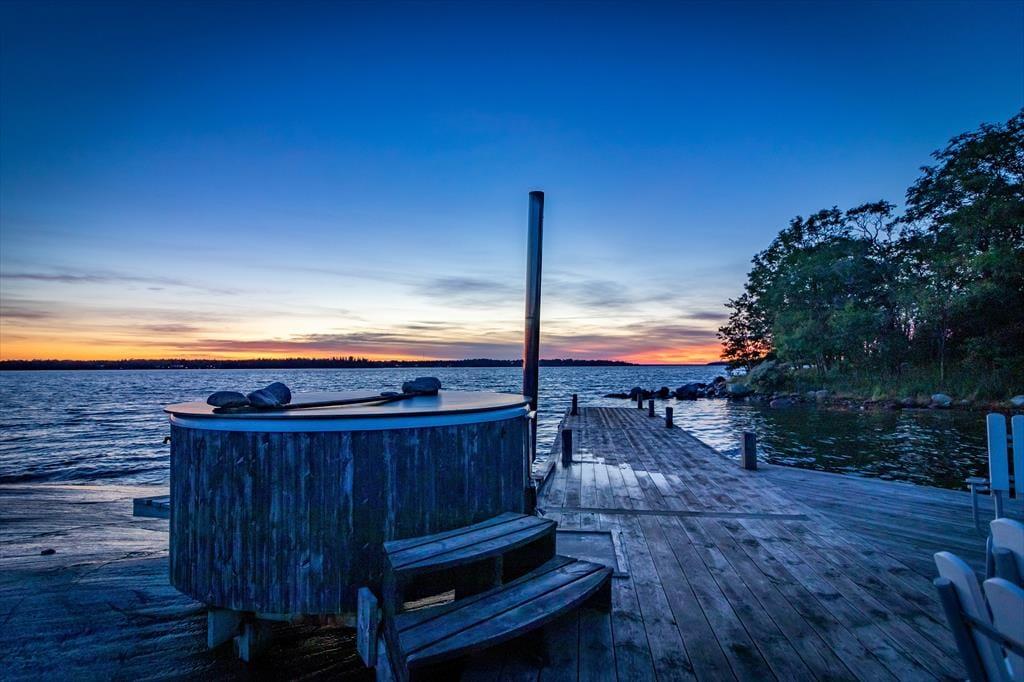 Die Terrasse rund ums Haupthaus ist mit Terrassenmöbeln, Grill und Hängematte ausgestattet. Auf der Insel stehen zwei Nebengebäude zur Verfügung: Das erste bietet auf etwa 12 m² zwei Einzelbetten, im zweiten findest du ein 10 m² großes Schlafzimmer mit Etagenbett sowie eine Sauna mit Blick aufs Wasser. Ebenfalls direkt am Meer kannst du ein beheizbares Badefass nutzen. Außerdem stehen dir ein Ruderboot (mit 4 PS Motor), ein Kajak und ein SUP zur Verfügung, um die Umgebung vom Wasser aus zu erkunden.
