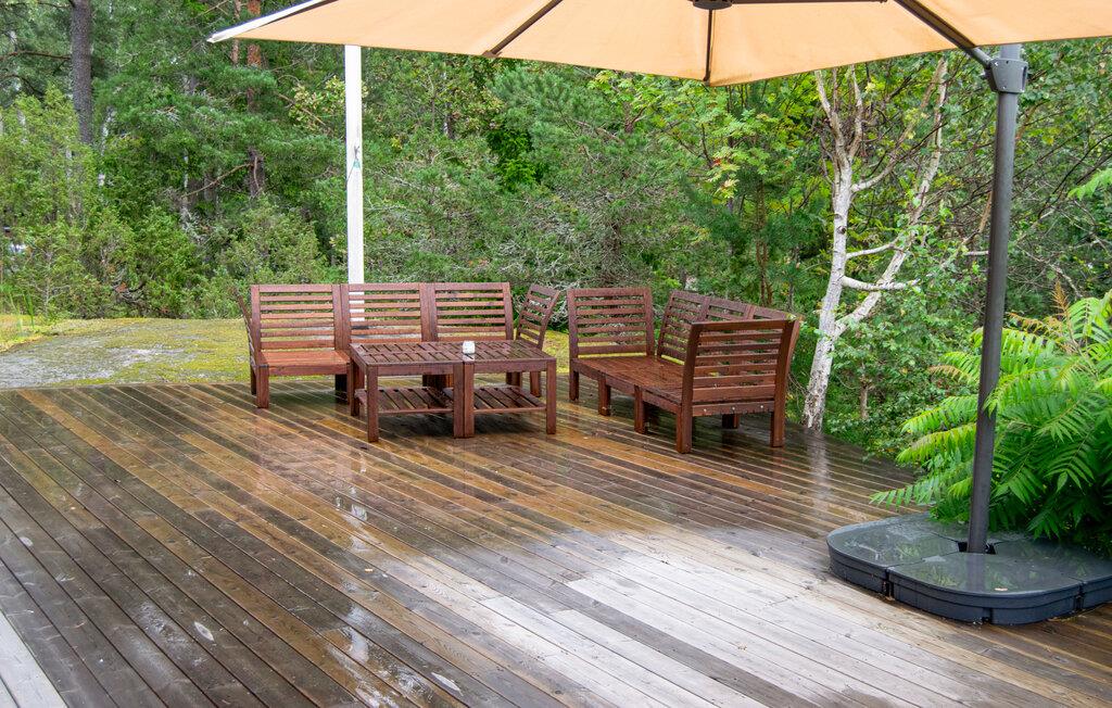 Bewegen Sie sich hinaus auf die weitläufige Holzterrasse und lassen Sie sich von der schönen Umgebung begeistern. Setzen Sie sich in die gemütliche Sitzgruppe unter dem großen Sonnenschirm, um am Morgen frische Luft zu schnappen und den Tag ruhig zu beginnen. Die verschiedenen Terrassenbereiche bieten Ihnen Rückzugsorte für Ruhepausen oder Gespräche im Freien.