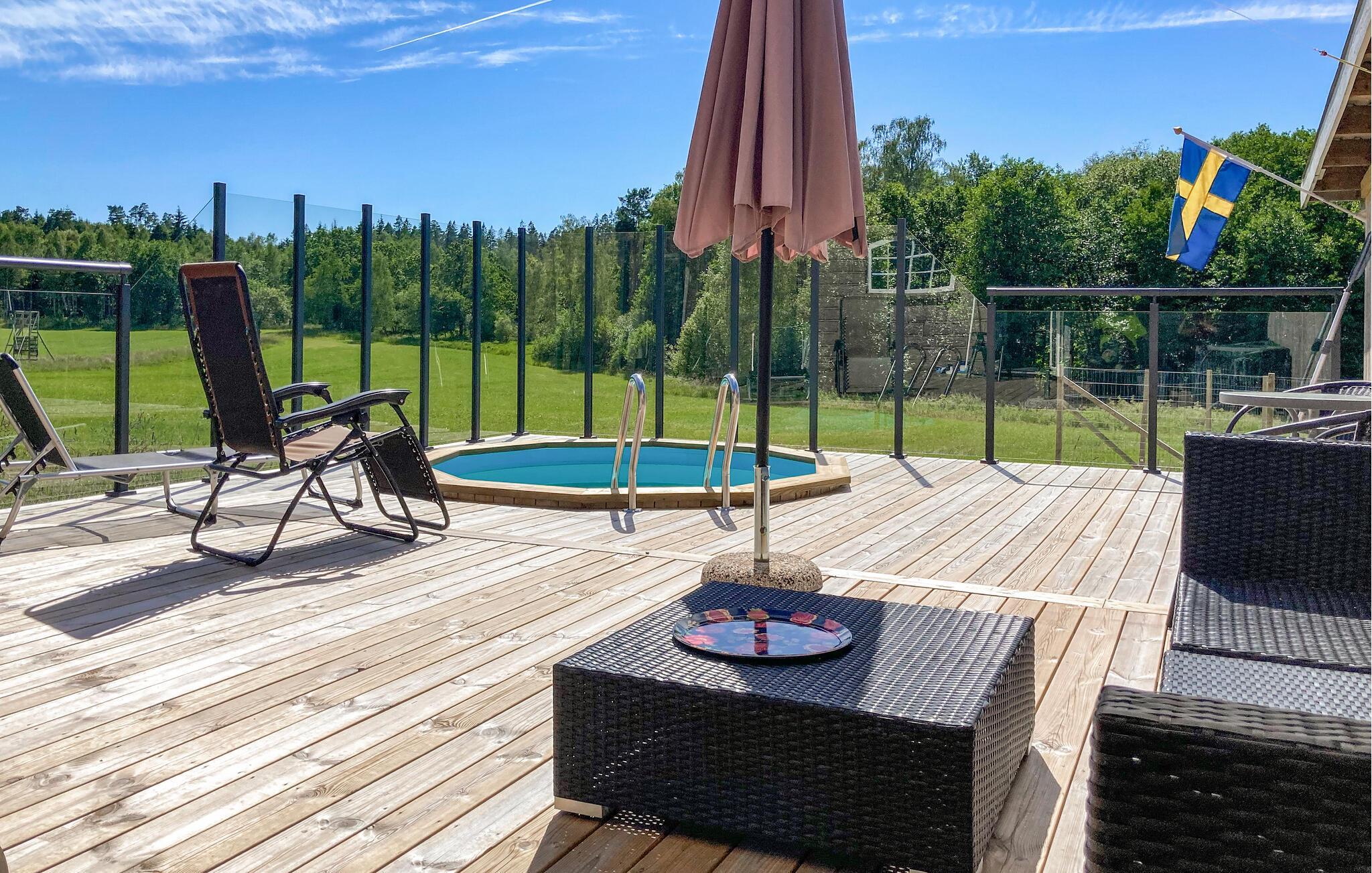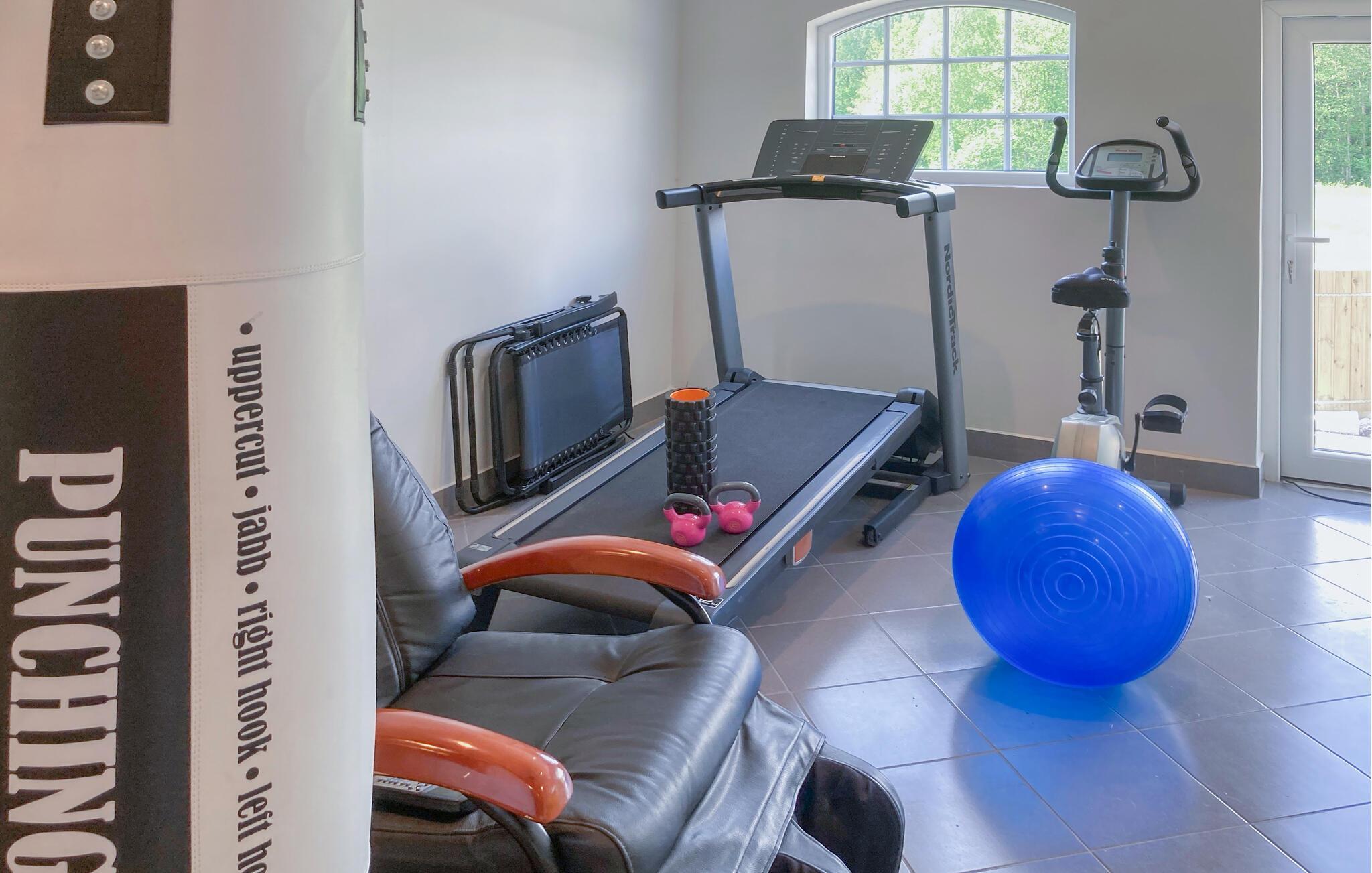 Die offene Terrasse lädt zum Essen im Freien und schönen Momenten in der Abendsonne ein. Ein paar Schritte vom Haus entfernt finden Sie das ehemalige Stallgebäude mit vollausgestatteter Küche und einem Essbereich. Entspannen Sie hier in Sauna und Whirlpool und genießen Sie die Sonne auf der Terrasse, oder trainieren Sie im Fitnessraum mit Laufband, Heimtrainer, Boxsack, Yogamatten und Pilatesball. Genießen Sie die Sonne auf der Terrasse und erfrischen Sie sich im Minipool.