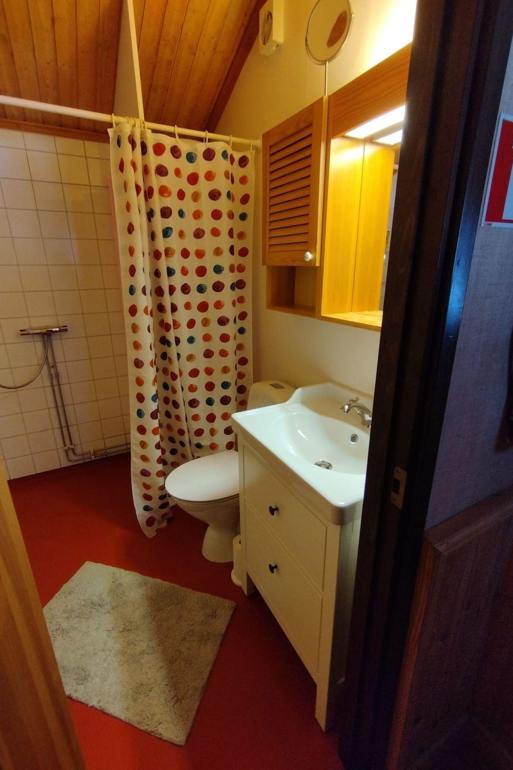 Im Inneren der Hütte finden Sie einen gemütlich eingerichteten Hauptraum, der mit einem Etagenbett, einem Bettsofa und einer Küchenzeile ausgestattet ist. Zudem lädt ein Esstisch zum gemeinsamen Verweilen ein, während ein Fernseher für Unterhaltung sorgt. Separat gelegen sind Dusche und WC, was bedeutet, dass Sie auch in dieser rustikalen Unterkunft nicht auf den gewohnten Komfort verzichten müssen.