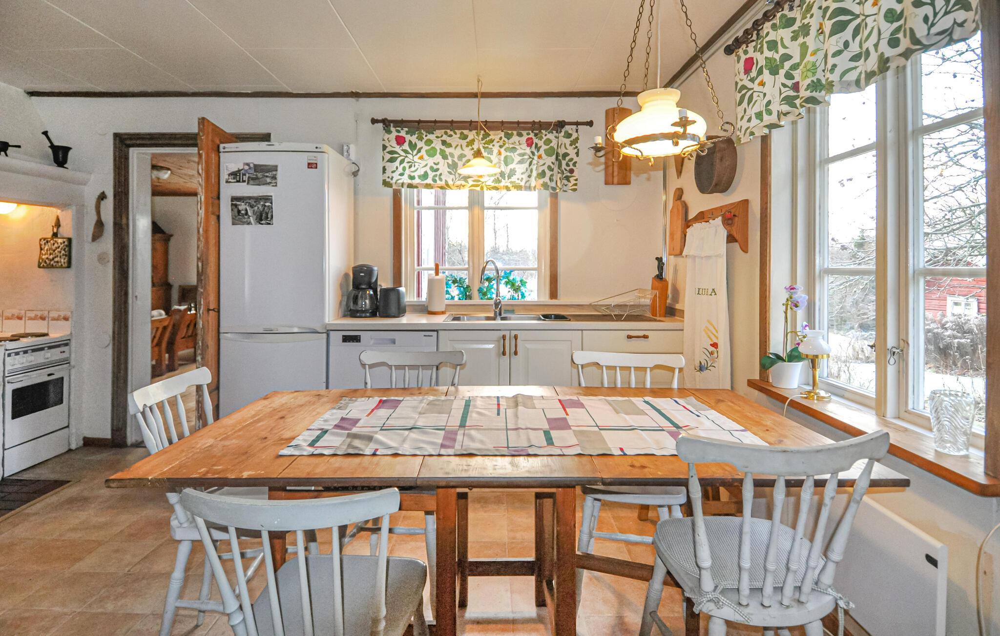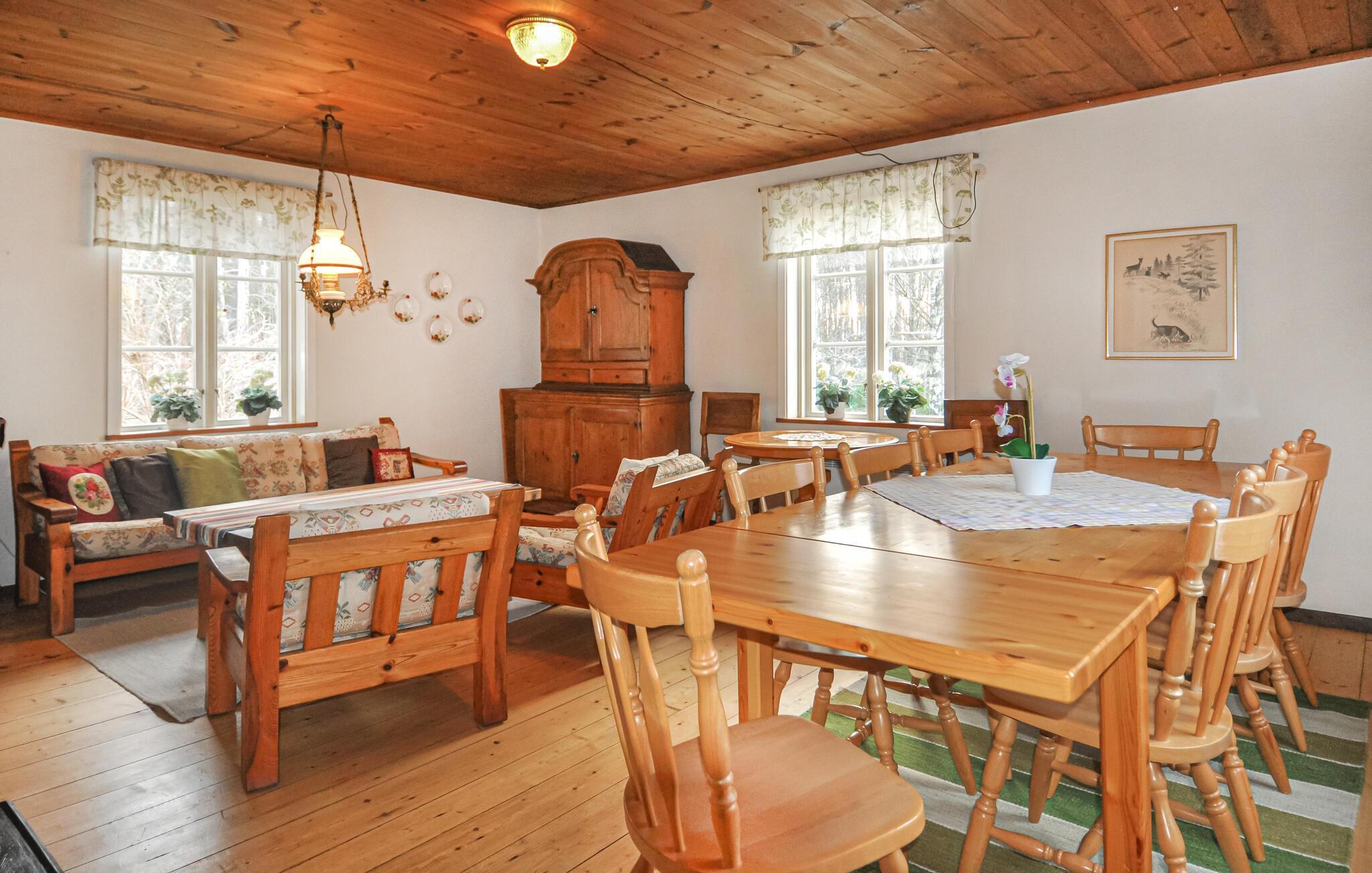 Freuen Sie sich auf einen erholsamen Urlaub in diesem charmanten Schweden-Ferienhaus. Eingebettet in eine malerische ländliche Umgebung bietet dieses Haus eine schöne Mischung aus traditionellem Charme und modernen Annehmlichkeiten. Entspannen Sie sich im geräumigen Wohnzimmer mit seinen zahlreichen gemütlichen Sitzgelegenheiten und dem rustikalen Kaminofen. Die Holzvertäfelung und die warmen Farben schaffen eine einladende Atmosphäre. Nutzen Sie den großzügigen Holzesstisch, um Mahlzeiten zusammen mit der Familie oder mit Freunden zu genießen.