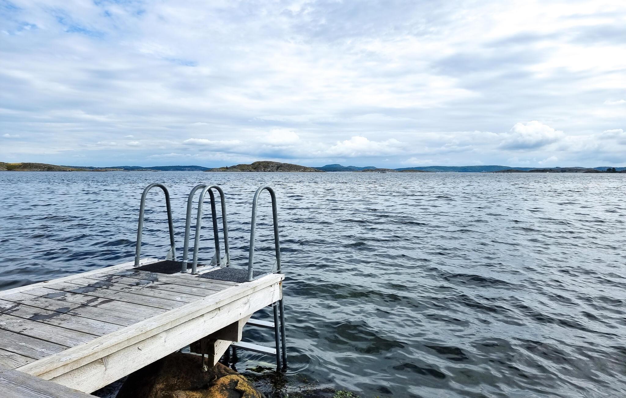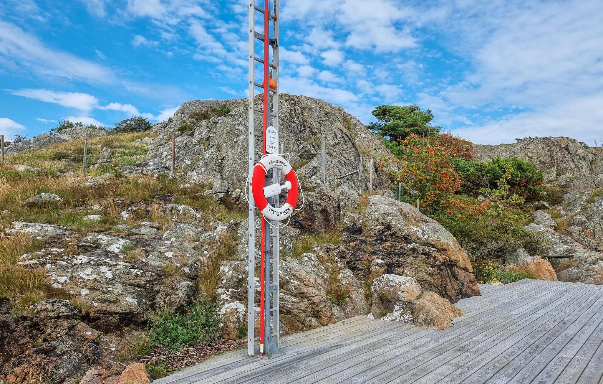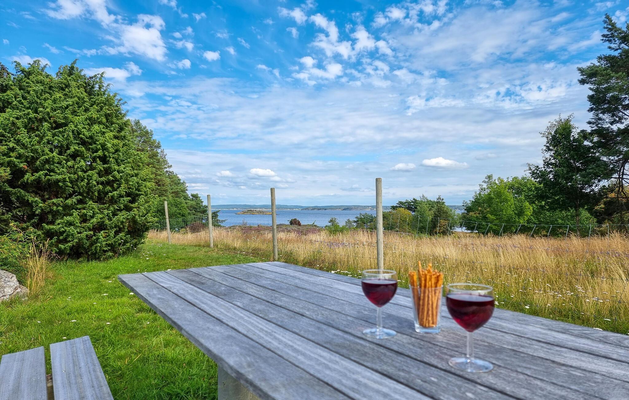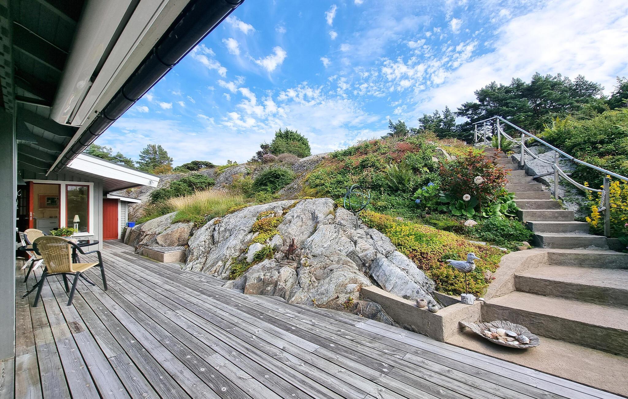 Erleben Sie auch das Ambiente im Freien und verweilen auf den unterschiedlichen Terrassenbereichen, einmal mit Meerblick, einmal geschützt durch Überdachung und die Felsen. Sie können aber auch über eine Treppe auf eine höhere Ebene gelangen, von der Sie einen tollen Ausblick auf das Wasser und die Schären haben. Grillen Sie und genießen Snacks im Freien.