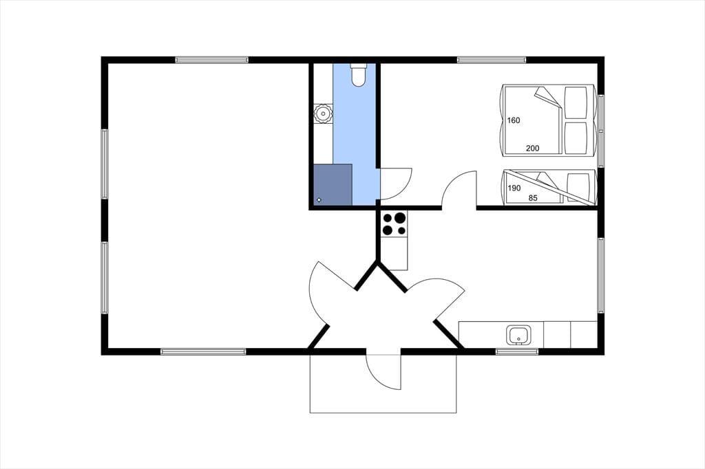 Das etwa 68 m² große Ferienhaus verfügt über ein Schlafzimmer, das mit einem 160 cm breiten Doppelbett und einem Etagenbett ausgestattet ist. Eine weitere Schlafgelegenheit bietet sich im Wohnzimmer mit einem Doppelbettsofa, ebenfalls 160 cm breit; die Belegung des Hauses ist jedoch auf vier Personen begrenzt. Im Wohnzimmer stehen den Gästen außerdem ein Flat-TV mit deutschen Programmen sowie DVD und Radio zur Verfügung. Die Küche ist mit einem Elektroherd mit Backofen, Kühlschrank mit 20 l Gefrierfach, Mikrowelle, Kaffeemaschine und Wasserkocher ausgestattet. Darüber hinaus gibt es ein Duschbad mit WC und Handwaschbecken. Das Haus kann elektrisch beheizt werden. Ein Ruderboot zur Mitbenutzung, Gartenmöbel und Holzkohlegrill sowie bei Bedarf ein Kinderbett und ein Hochstuhl stehen ebenfalls zur Verfügung.