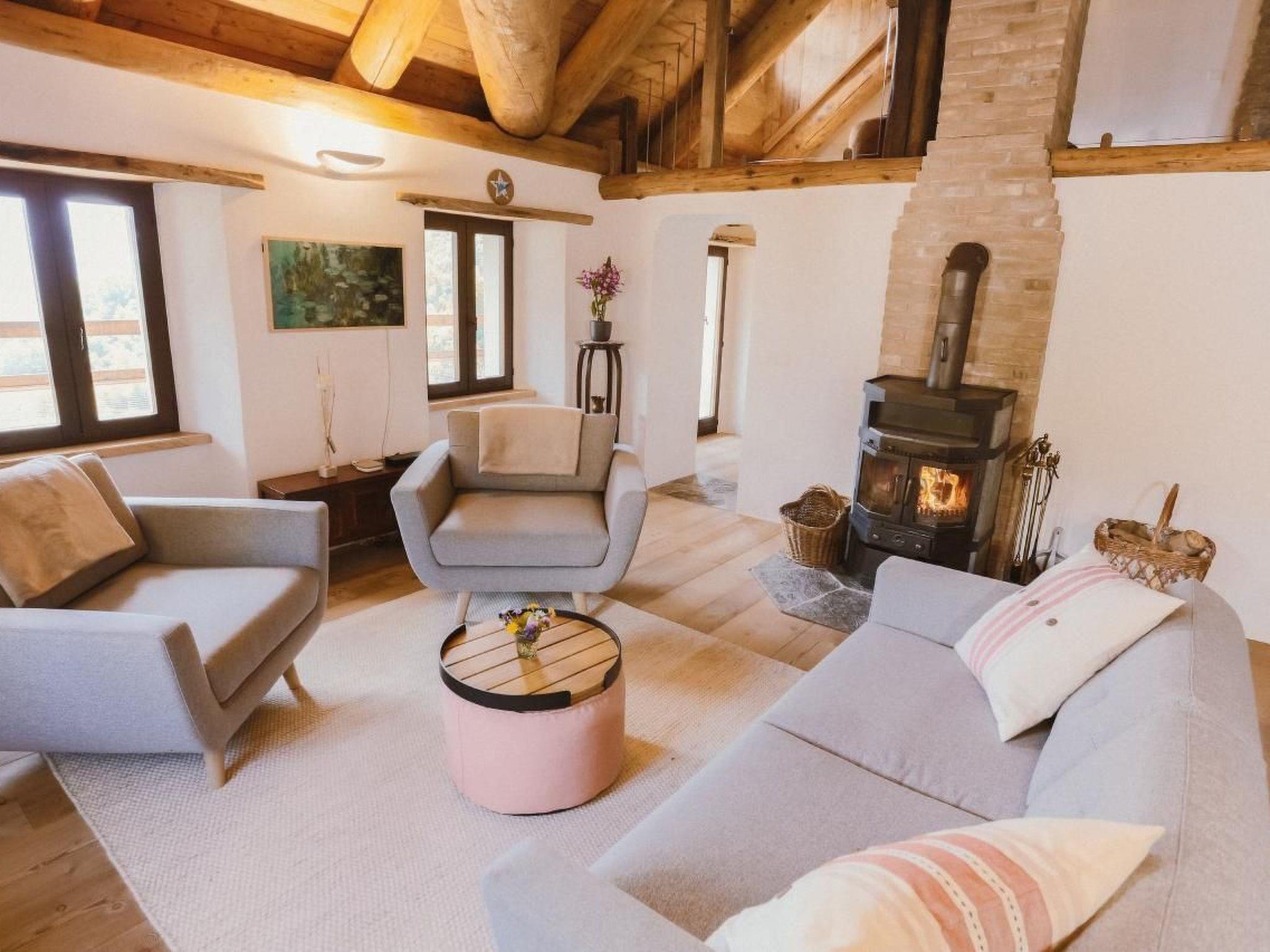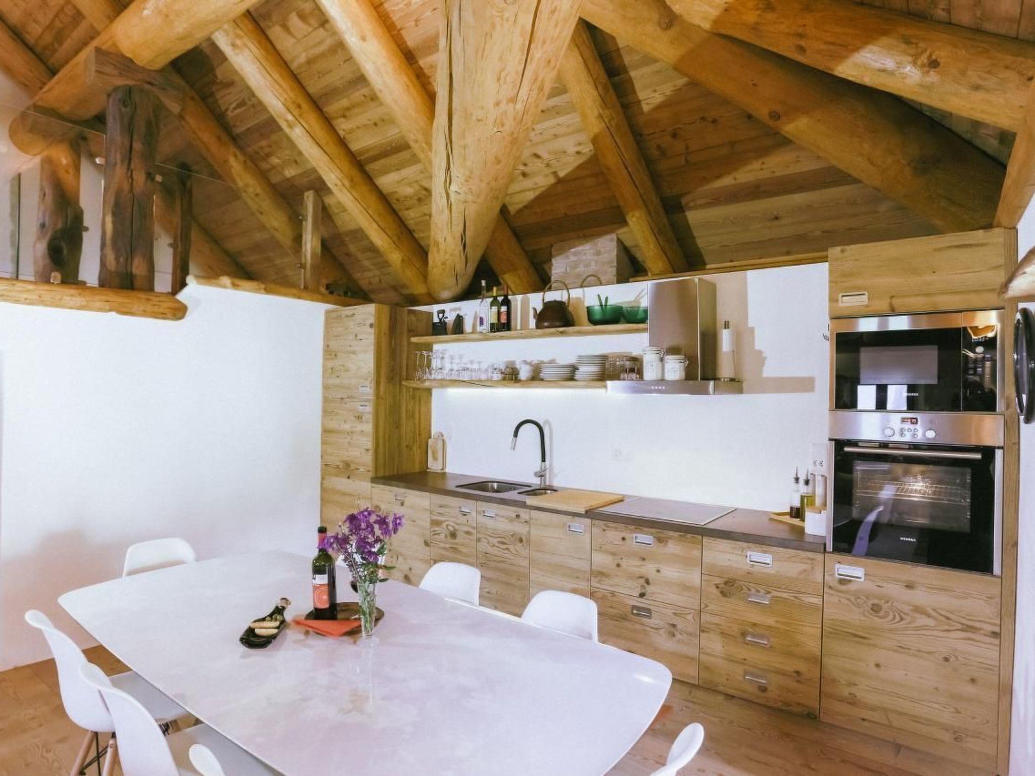 Der Grundriss ist auf zwei Ebenen strukturiert, mit einem großen, offenen Loft in der Mitte, das durch eine antike Granittreppe verbunden ist. Auf der ersten Ebene befinden sich die Massivholzküche, das geräumige Wohnzimmer, das Hauptschlafzimmer und das Badezimmer mit einem separaten zusätzlichen WC. Die zweite Ebene beherbergt einen großen Dachboden, der als Lesezimmer genutzt wird, und ein besonderes Dachzimmer mit einem runden Bett, einem dritten Zusatzbett und einem Blick auf den Sternenhimmel dank zweier besonderer Deckenfenster. Die Wohnung verfügt außerdem über einen Außenbalkon (eine typische Terrasse aus der Zeit), der exklusiv genutzt werden kann und einen herrlichen Blick auf das Panorama und die umliegenden Berge bietet. Die alten Gewölbekeller des Gebäudes sind ebenfalls zugänglich und bieten die Möglichkeit, einige lokale Köstlichkeiten (Käse, Wein usw.) zu servieren. Von hier aus kann man den gemeinsamen Garten des Hauses erreichen und genießen.