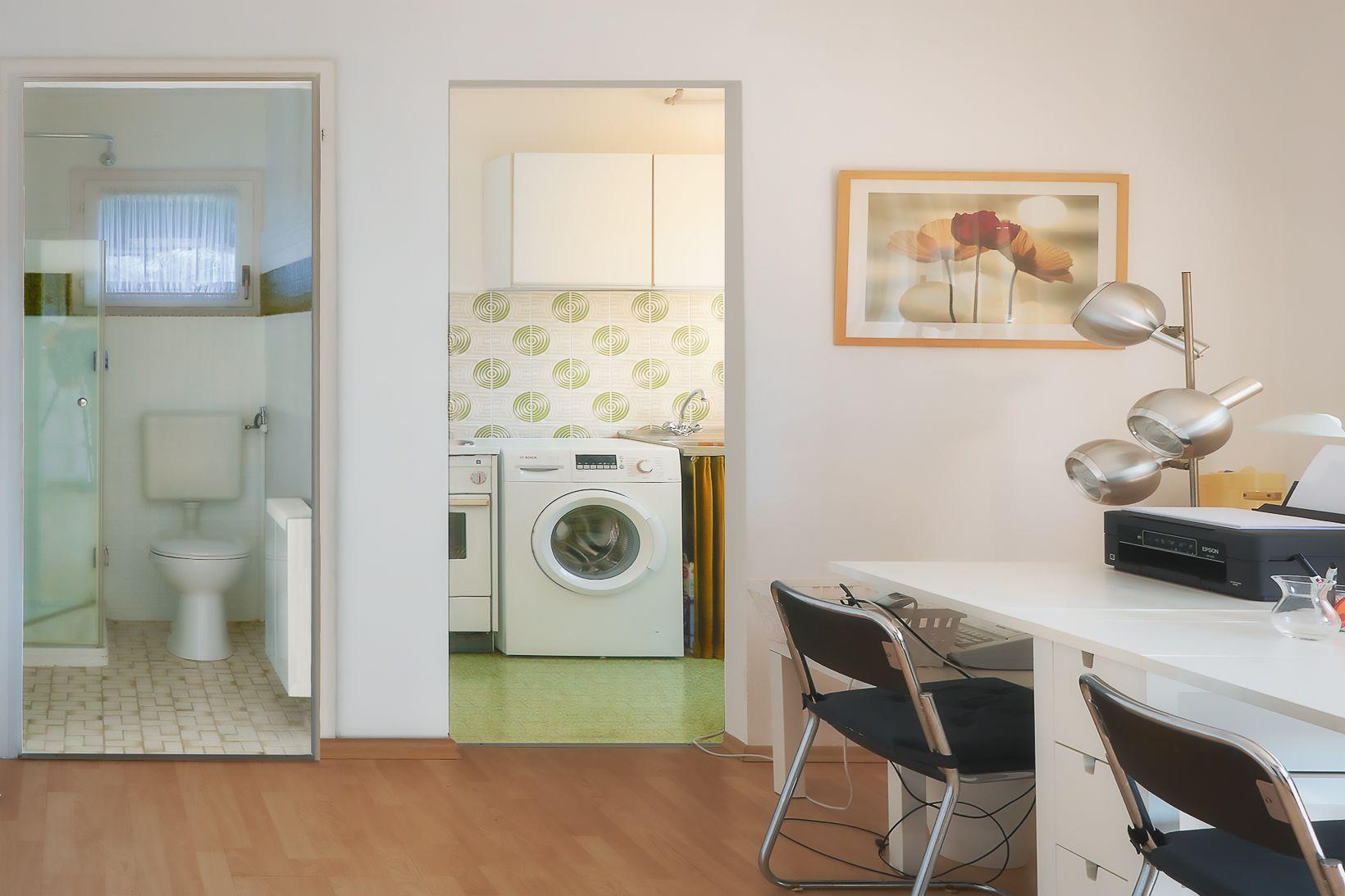 Das Erdgeschoss ist eine eigenständige Wohneinheit, die mit einem Esstisch, einem weiteren Badezimmer mit Dusche und einer kleinen Küche ausgestattet ist. Hier steht auch eine Waschmaschine zur Verfügung, um den Aufenthalt noch angenehmer zu gestalten.