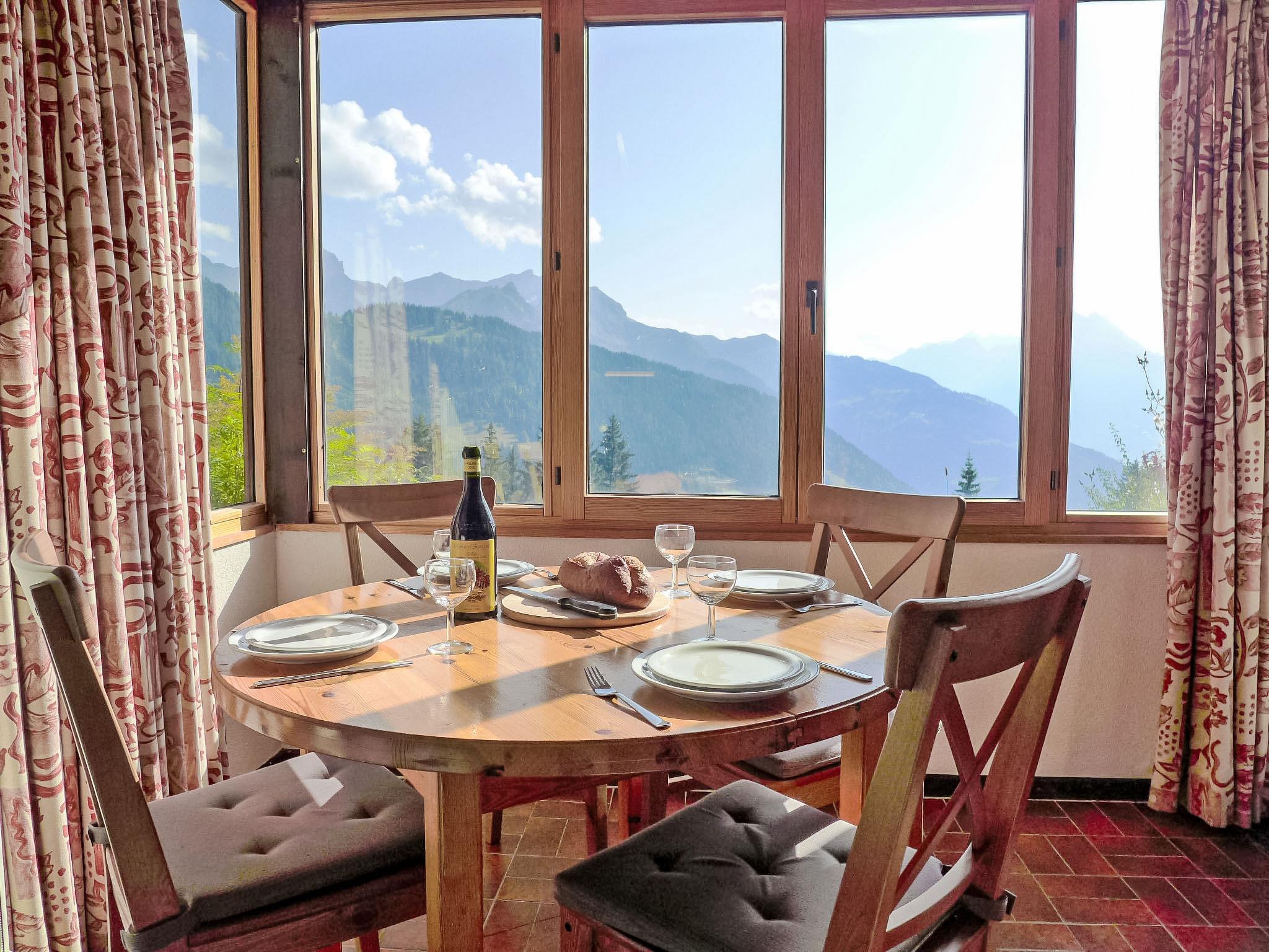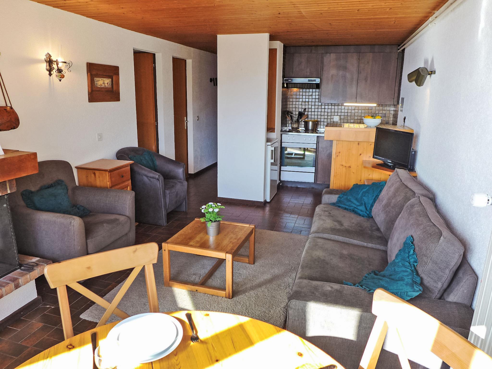 "La Vire D'Aufalle 14 Inférieur", 3-Zimmer-Wohnung 45 m2, im Erdgeschoss. Zweckmässig eingerichtet: Wohn-/Esszimmer mit offenem Kamin und TV (Flachbildschirm), DVD. Ausgang zur Terrasse. 2 Zimmer, jedes Zimmer mit 2 Betten. Kleine, offene Küche (3 Kochplatten, Backofen, Toaster, Wasserkocher, elektrische Kaffeemaschine, Racletteofen, Fondue Set (Käse)). Bad/WC. Terrasse, Südlage. Terrassenmöbel. Sicht auf die Berge und die Landschaft. Zur Verfügung: Internet (Wireless LAN, gratis). Parkplatz Nr. 14I (überdacht) in 100 m, Höhe 200 cm, Breite 237 cm.