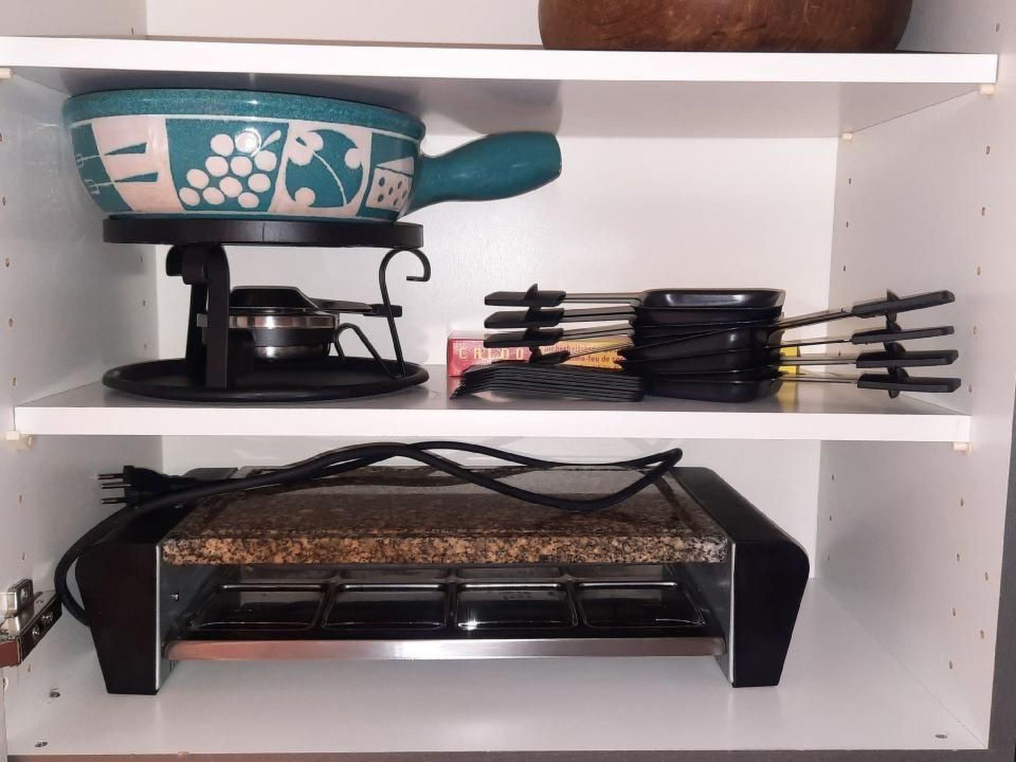 Sonstige Kücheneinrichtung (Küche1): Fondue und Raclette Set, Gratis Kaffeekapseln Delizio, Gemahlener Kaffee, Zucker, Salz, Pfeffer, Essig, Öl, Wok Pfanne, alles was ein Haushalt braucht.