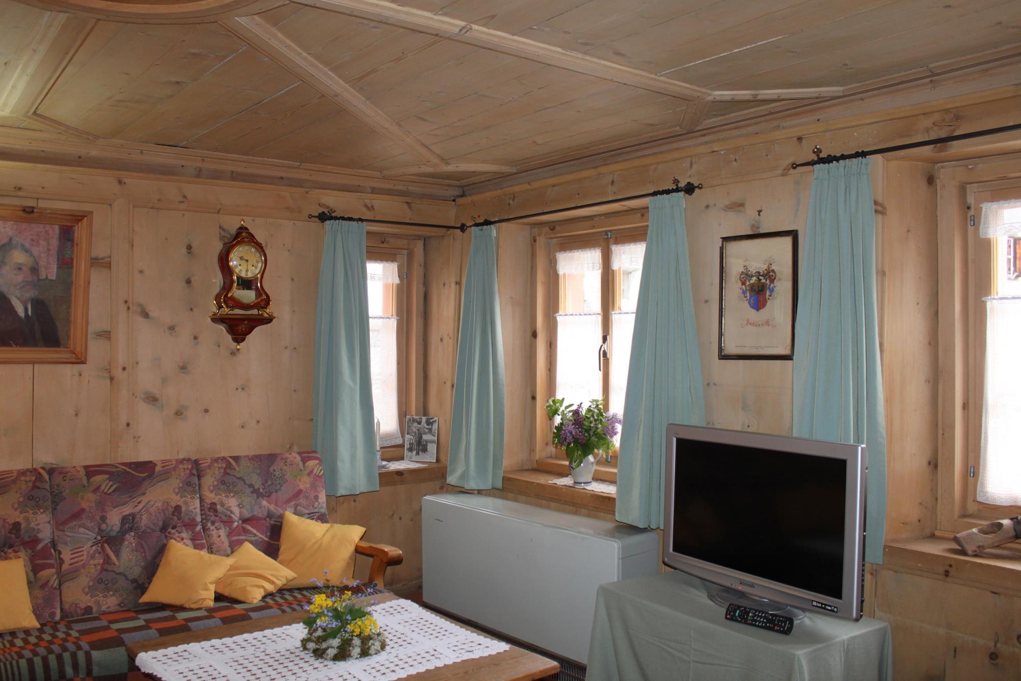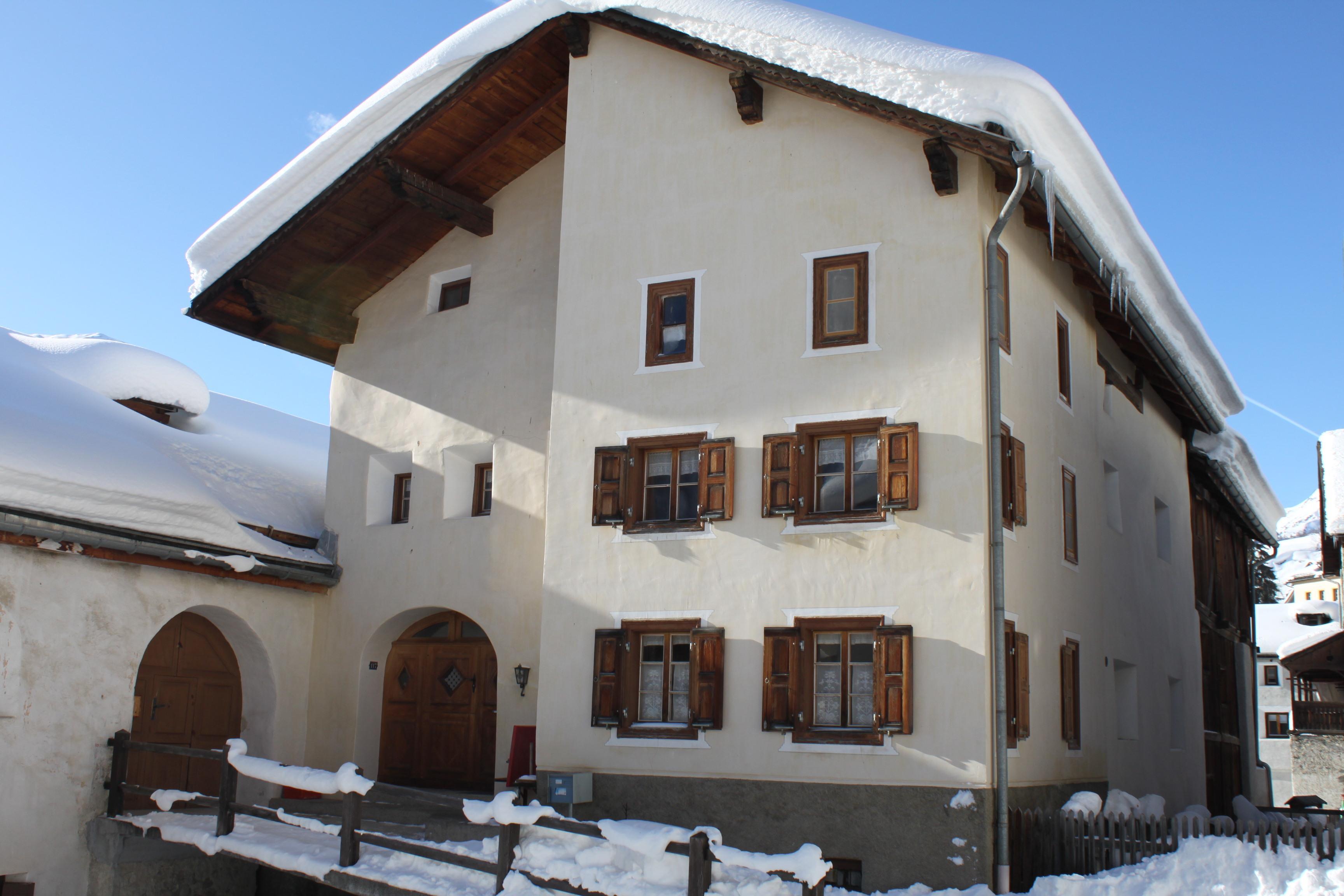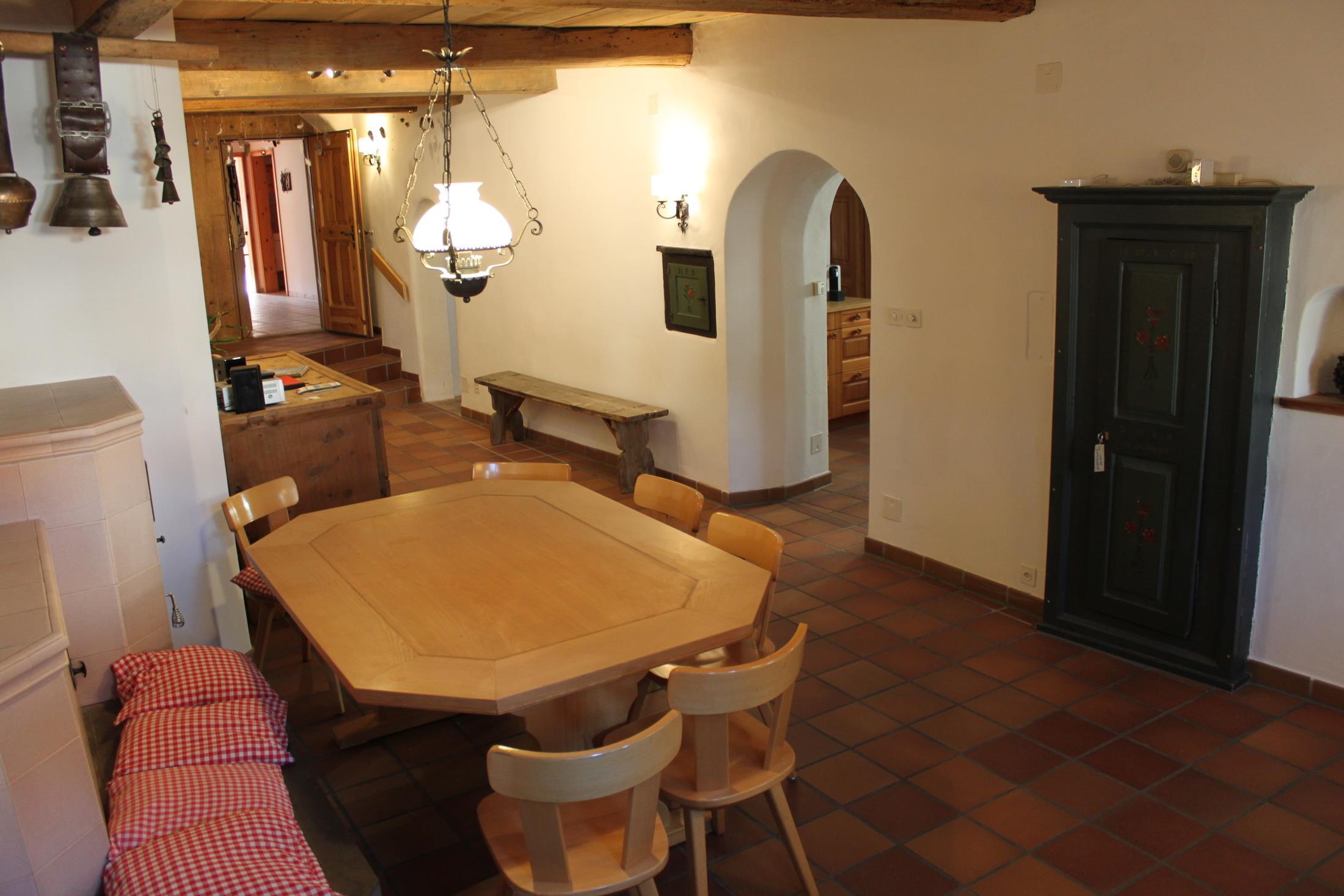 EG: Engadiner Arvenstube, Eingangshalle mit Essplatz und Bodenheizung sowie Kachelofen zusätzlicher Sitzplatz gegen Dorfbrunnen vor dem Haus, separater Eingang.