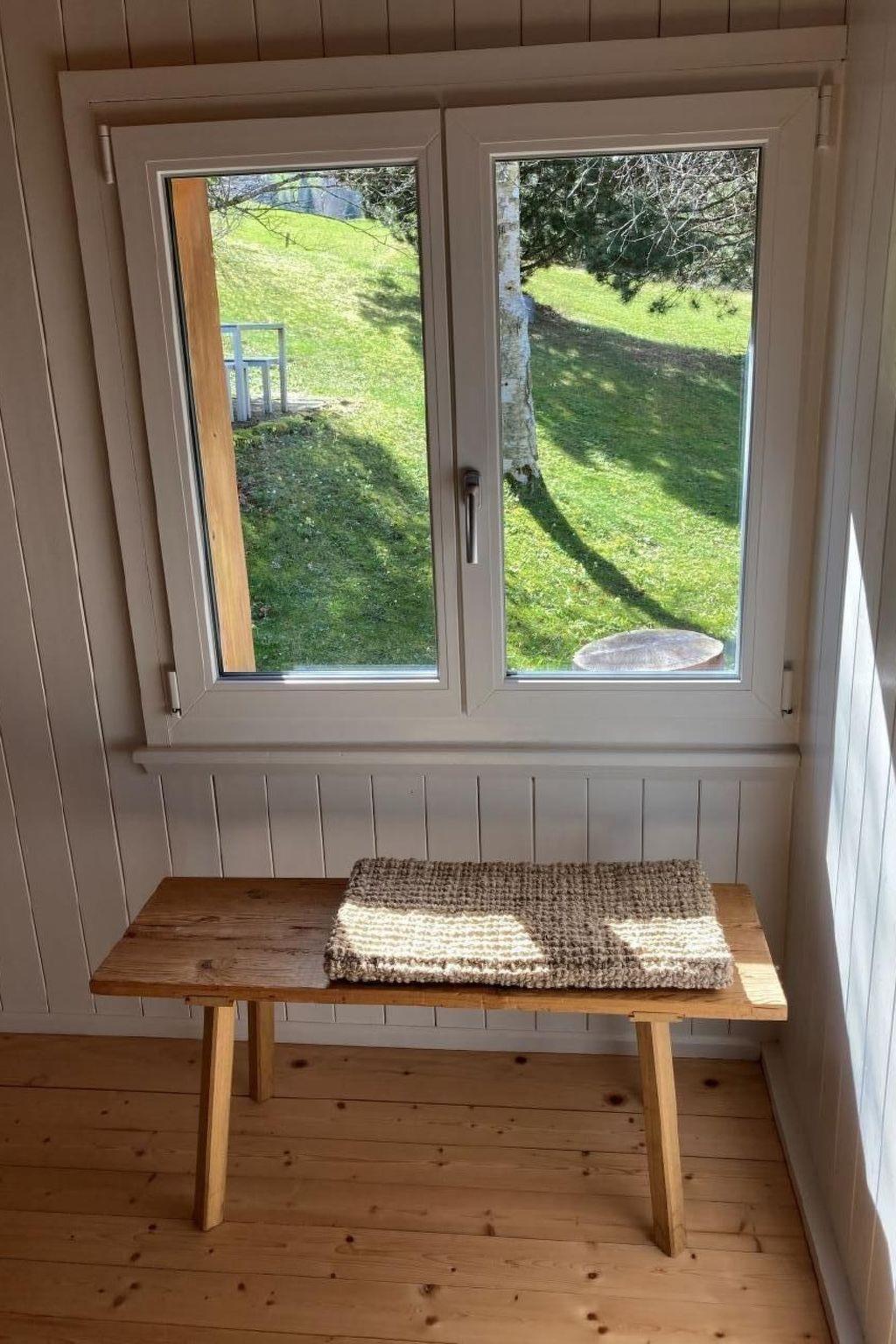 Im Garten lädt der schattige Sitzplatz mit einem grossen Tisch und zwei Bänken zum Verweilen ein. Zwei «Butterfly Sessel» und ein mobiler kleiner runder Gartentisch mit zwei Klappstühlen können rund ums Haus platziert werden. Neben dem Hauseingang steht eine grosse Bank. Abends geniesst man wunderschöne Sonnenuntergänge. Tagsüber, bei guter Sicht, sieht man bis nach Süddeutschland.