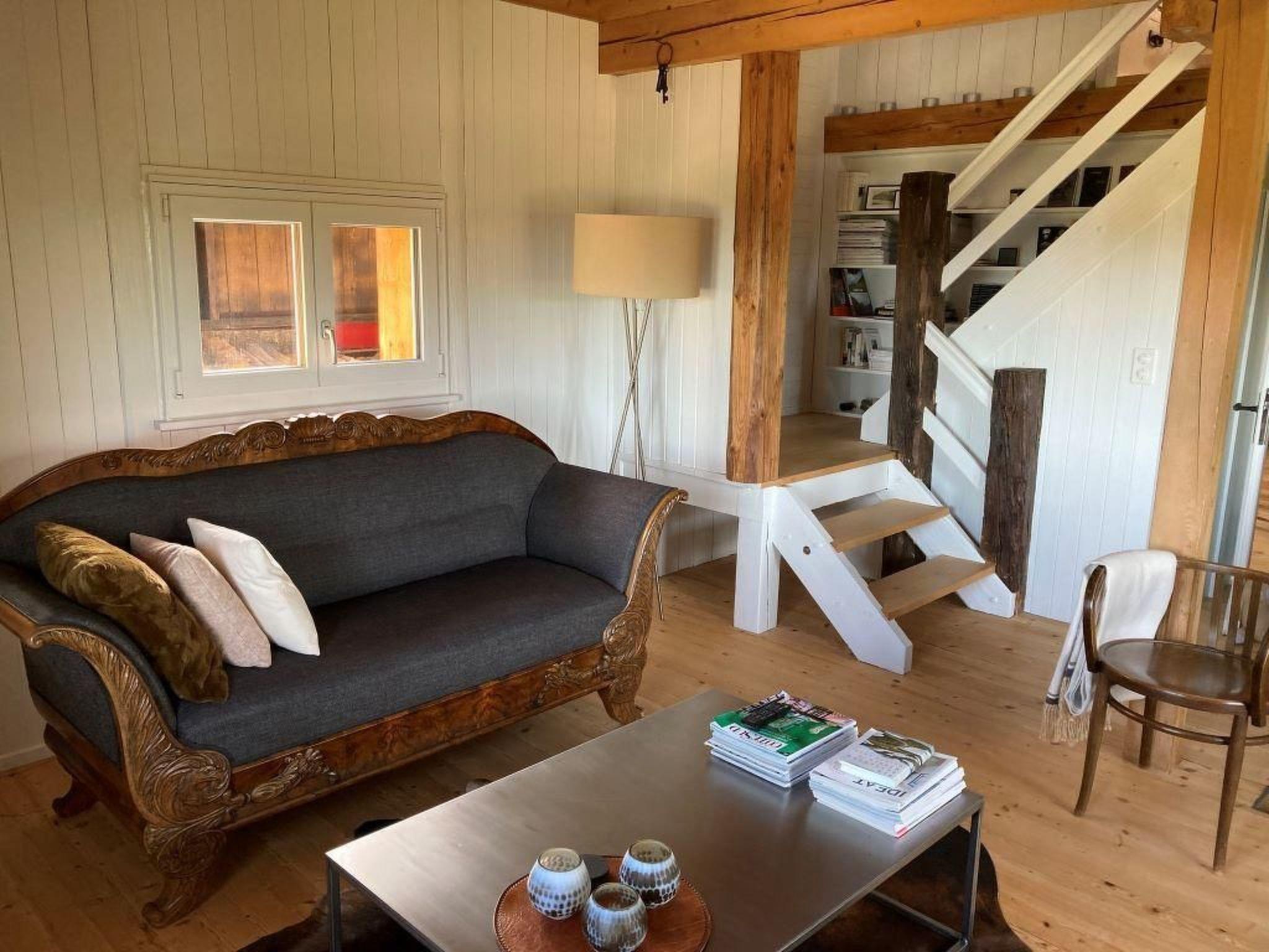 Im Parterre befindet sich der Hauseingang mit einem kleinen Entrée und einer Garderobe. Von hier aus geht es rechts ins Badezimmer und gerade aus in einen grossen Essraum. Angrenzend befindet sich die offene, gut ausgestattete Küche. Durch eine Tür geht es weiter ins Wohnzimmer, mit verschiedenen Sitzgelegenheiten und dem grossen Holzofen. Das Wohnzimmer ist ein lichtdurchfluteter Raum, gegen 3m hoch. Eine kleine Treppe führt ins 1. OG. Hier befindet sich das geräumige Schlafzimmer mit einem 200x200cm grossen Boxspring Bett und ein grosses, zur Treppe hin offenes Fernseh- und Lesezimmer, mit einem gemütlichen Ecksofa. Es gibt viel Platz, um Kleider und Persönliches zu verstauen. Das Schlafzimmer hat zwei Dachfenster, die mittels Storen verdunkelt werden können.