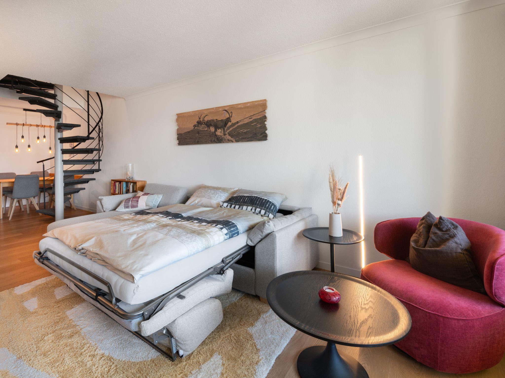 Die gemütliche 2.5-Zimmerwohnung verfügt über 1 Schlafzimmer für 2 Personen und 1 Badezimmer mit Badewanne/Dusche kombiniert und WC. Die Wohnung hat eine voll ausgestattete Kochnische (2 Kochplatten, Geschirrspüler, Nespresso Kaffeemaschine, Mikrowelle, Backofen) und ein gemütlicher Ess- und Wohnbereich mit Sofabett (Tag/Nacht) für 2 weitere Personen, Kabel-TV/Radio. Balkon mit wunderbarer Panoramasicht auf die umliegende Bergwelt. Gratis Wireless LAN und 1 Tiefgaragenparkplatz sind im Mietpreis inbegriffen. Haustiere sind willkommen, Rauchen im Haus ist nicht erlaubt. Die Ferienwohnung ist direkt mit einem 4-Sterne-Hotel verbunden und die Hoteleinrichtungen wie Hallenbad, Bio-Sauna, Finnische-Sauna, Dampfbad und mehreren Fitnesseinrichtungen können kostenfrei genutzt werden.
