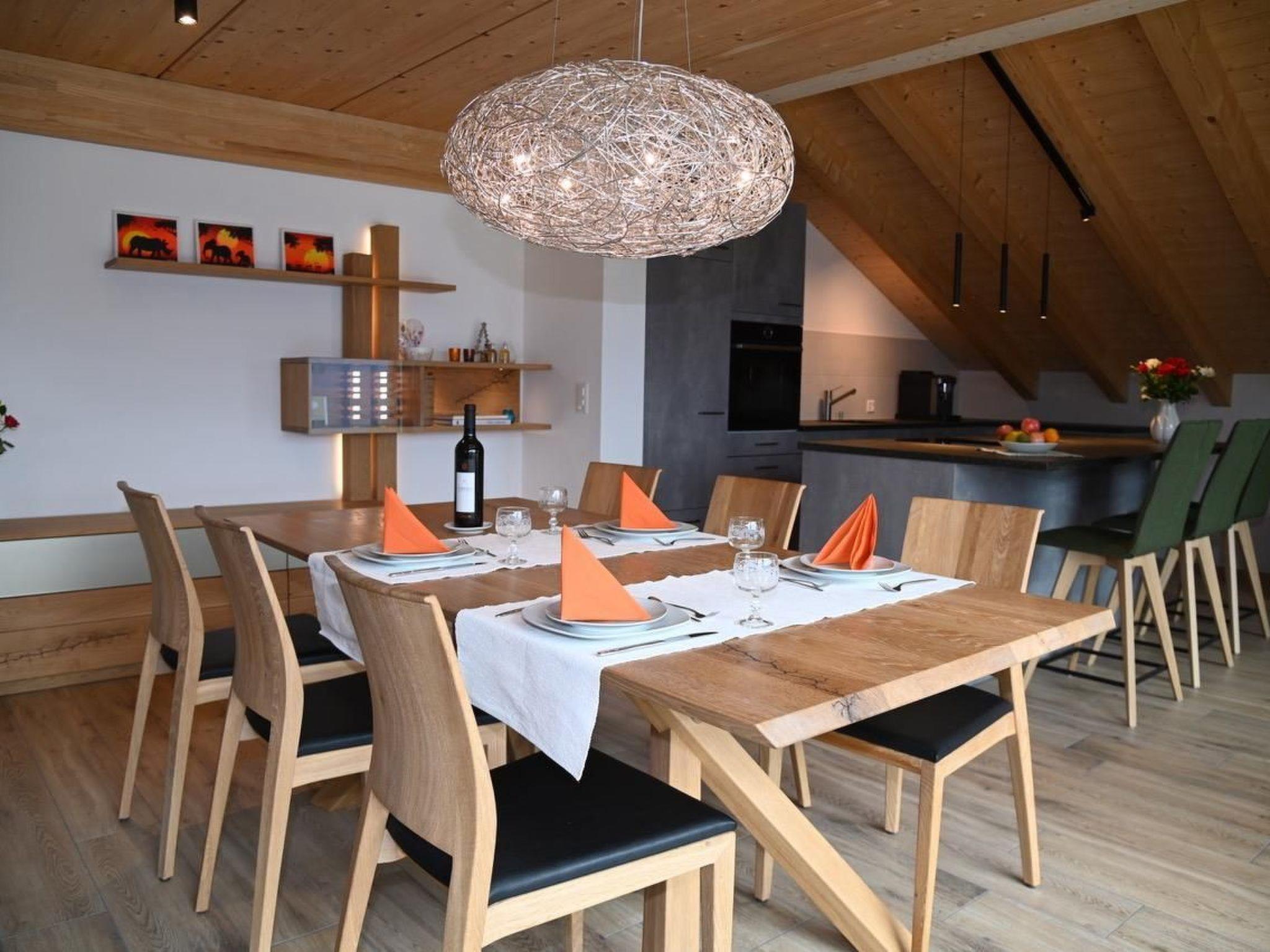 Moderne und stilvoll eingerichtete 3.5 Zimmer Wohnung (ca. 100 m2) mit zwei grossen Balkons, erbaut im Jahre 2019. Luxuriöse, offene Wohn-Küche mit Granitabdeckung, Backofen, Kochinsel mit Glaskeramik Kochfeld (Induction) , Dunstabzug, Geschirrspüler, Kühlschrank mit Gefrierfach, Toaster, Kaffeemaschine, Fondue Set, Raclette Grill usw. Wohnzimmer mit Polstergruppe, Salontisch, Kabel-TV, Flachbildschirm 107cm, Internetanschluss (gratis W-LAN), und massivem Esstisch. 2 Schlafzimmer mit Doppelbetten, 2 Badezimmer, eines davon mit Dusche/Lavabo/Aquaclean WC, Spiegelschrank; das andere mit Dusche/Badewanne, Lavabo, WC, Spiegelschrank Waschmaschine und Wäsche Trockner. Entree, Küche, Bad und Wohnbereich mit Keramik-Plattenboden und Bodenheizung. Die Unterkunft verfügt über alles Erdenkliche, damit Gäste die Ferien in vollen Zügen geniessen können. Die wunderschöne und unverbaubare Berg- und Seesicht auf das UNESCO Weltnaturerbe mit Eiger, Mönch und Jungfrau bewundern Sie vom grossen Südbalkon aus (44m2) wo die bequemen Balkonmöbel zum Verweilen einladen. Die Abendsonne scheint auf den zweiten Balkon (105 m2) im Westen und bietet herrliche Aussicht auf den Thuner See, Richtung Niesen und den Eingang zum Kandertal. Für Kleinkinder nicht geeignet. Nichtraucher Wohnung; Keine Haustiere. Zur Wohnung gehört eine Garage (4.75 x 3.86 m), welche kostenlos benützt werden kann. Die Bushaltestelle (bei den Kirchen) ist nur ca. 100 m von der Wohnung entfernt und mit der Gästekarte kann der Bus kostenlos benützt werden. In knapp 20 Minuten ist man in Interlaken und am Thuner- oder Brienzersee.