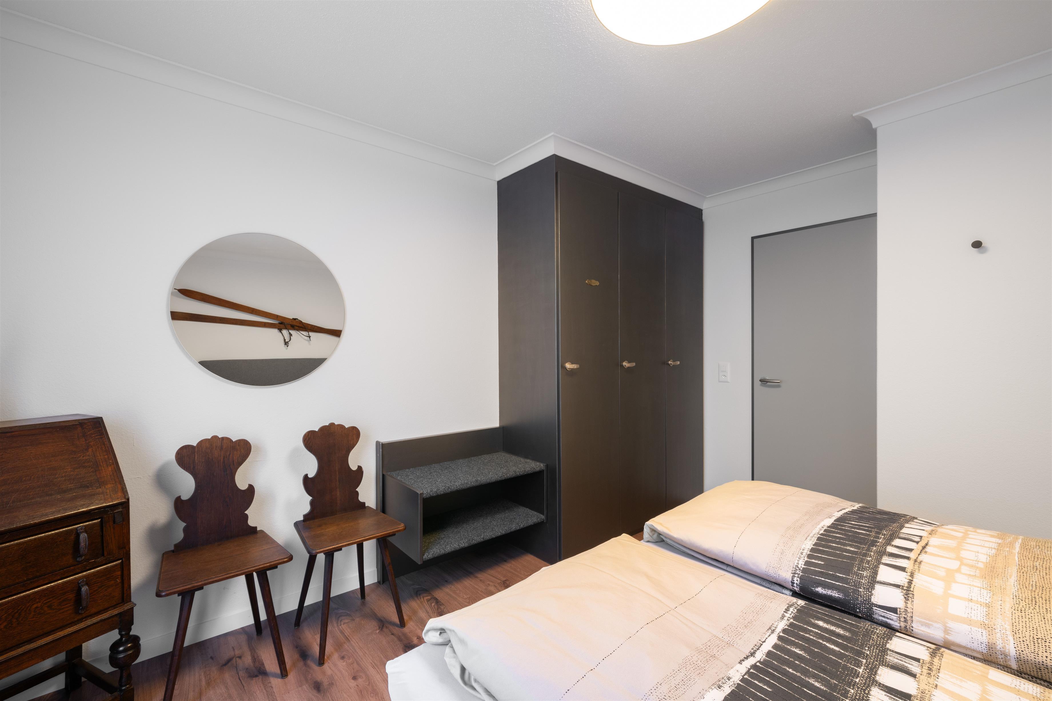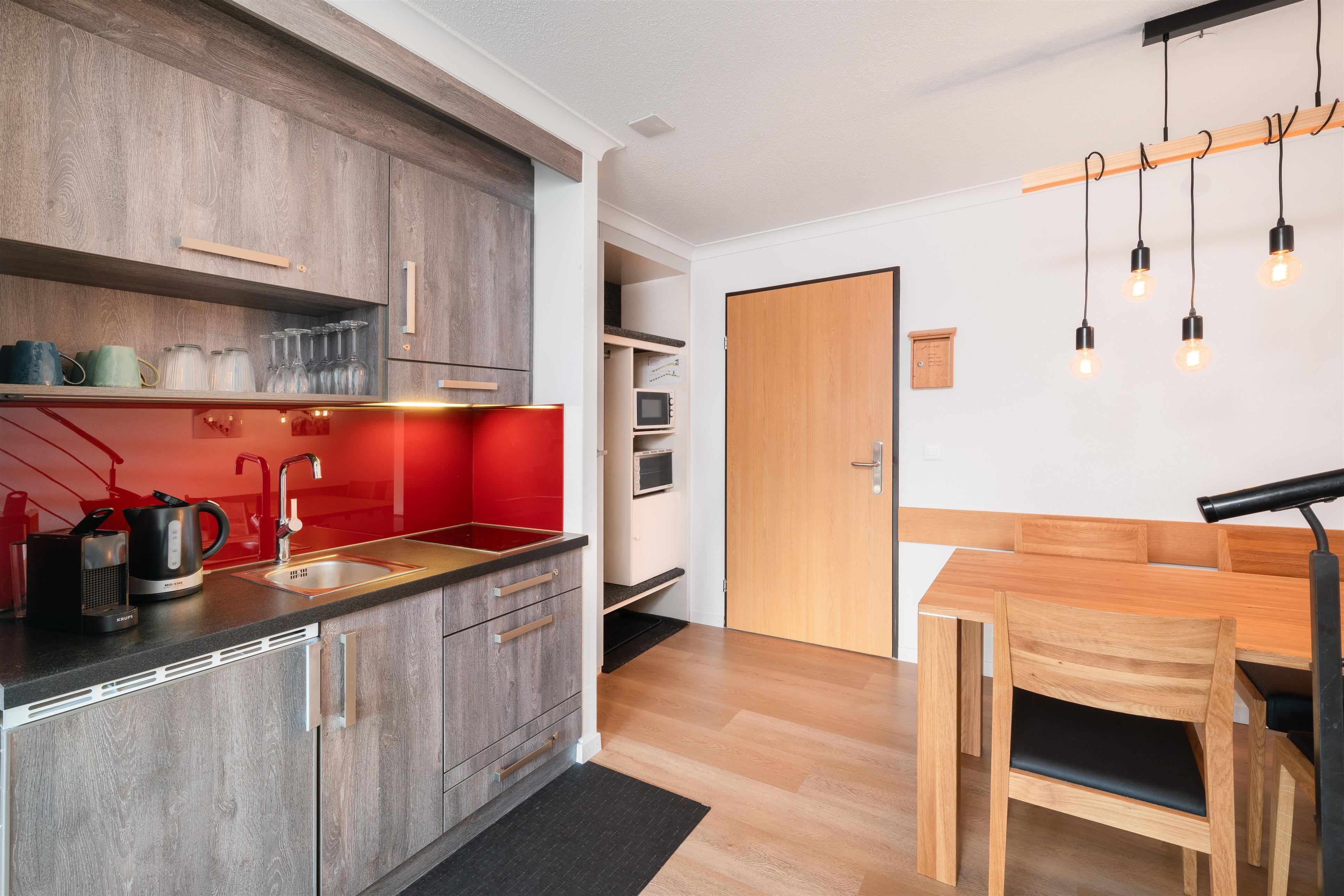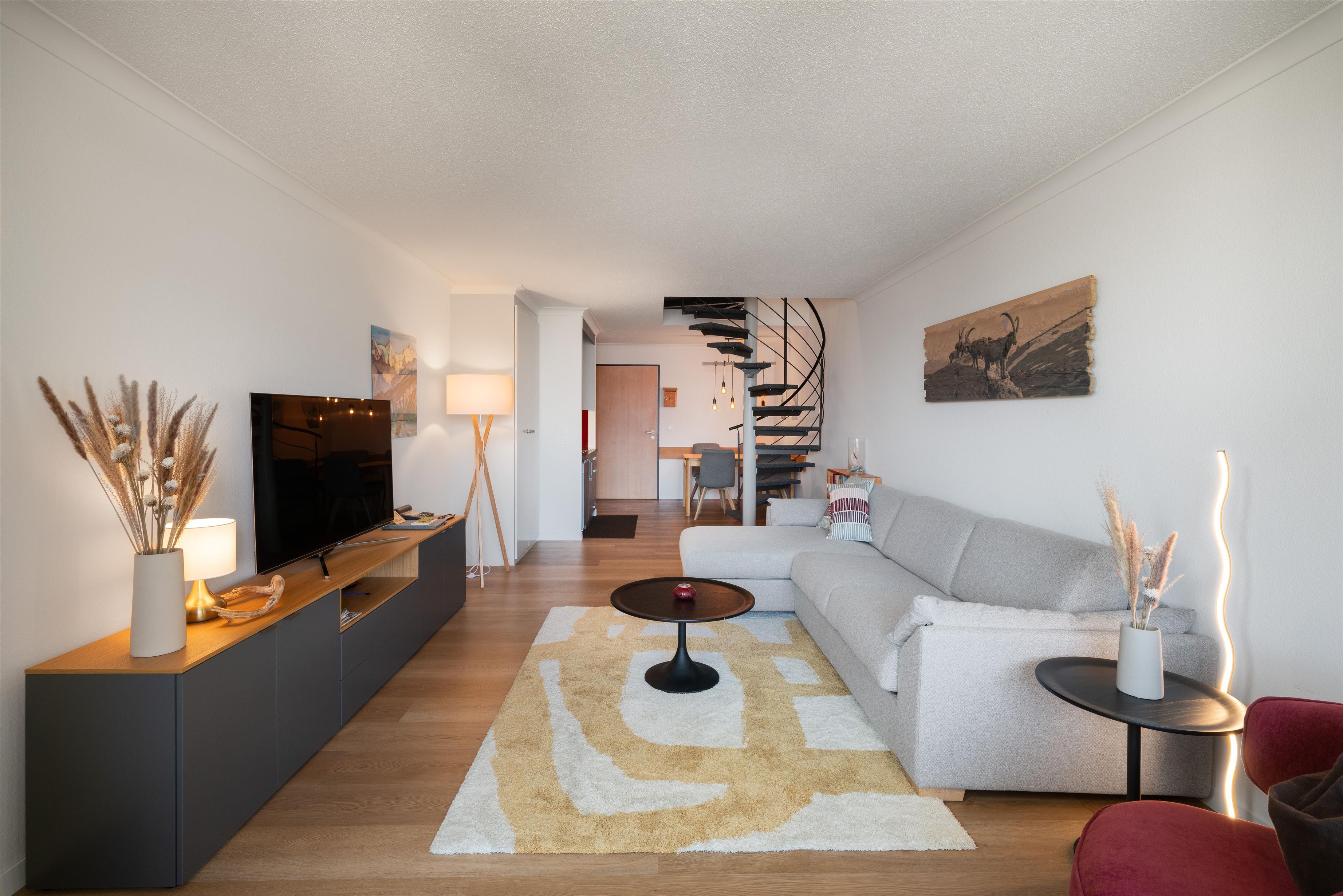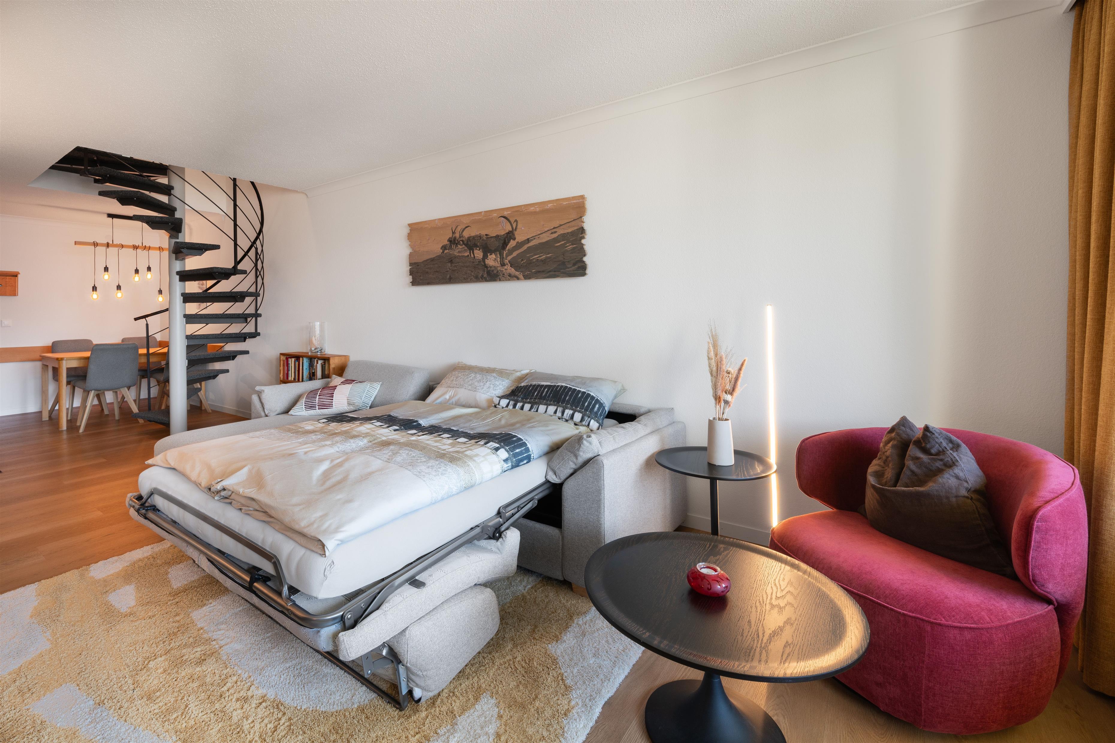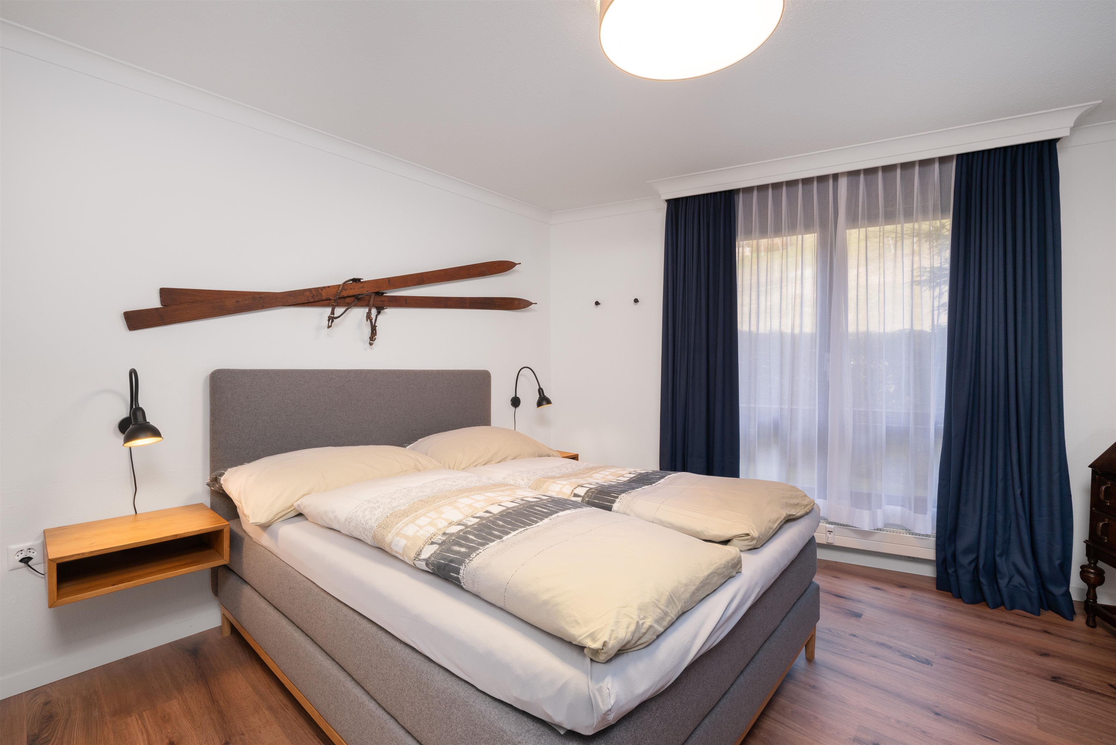 Die gemütliche 2.5-Zimmerwohnung verfügt über 1 Schlafzimmer für 2 Personen und 1 Badezimmer mit Badewanne/Dusche kombiniert und WC. Die Wohnung hat eine voll ausgestattete Kochnische (2 Kochplatten, Geschirrspüler, Nespresso Kaffeemaschine, Mikrowelle, Backofen) und ein gemütlicher Ess- und Wohnbereich mit Sofabett (Tag/Nacht) für 2 weitere Personen, Kabel-TV/Radio. Balkon mit wunderbarer Panoramasicht auf die umliegende Bergwelt. Gratis Wireless LAN und 1 Tiefgaragenparkplatz sind im Mietpreis inbegriffen. Haustiere sind willkommen, Rauchen im Haus ist nicht erlaubt. Die Ferienwohnung ist direkt mit einem 4-Sterne-Hotel verbunden und die Hoteleinrichtungen wie Hallenbad, Bio-Sauna, Finnische-Sauna, Dampfbad und mehreren Fitnesseinrichtungen können kostenfrei genutzt werden.