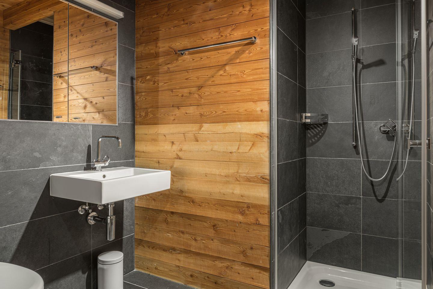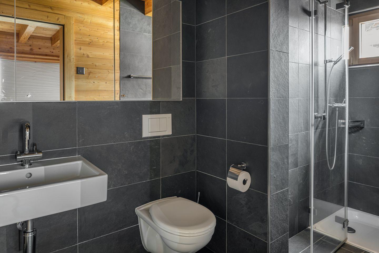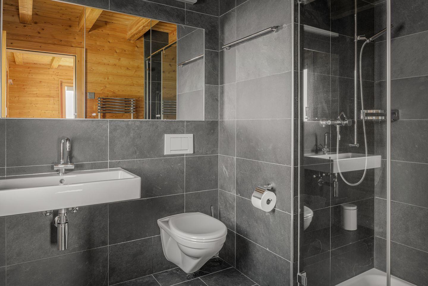 1. OG: 2 Doppelbettschlafzimmer mit eigenem Badezimmer mit Dusche/WC/ Lavabo, 1 Schlafzimmer mit 2 Einzelbetten, Badezimmer mit Dusche/WC/Lavabo. Mit Schiebtüre abschliessbares Fernsehzimmer mit Ausziehsofa für 2 Personen, Zugang zur Terrasse und Abstellraum mit Waschmaschine und Trockner.