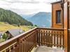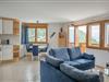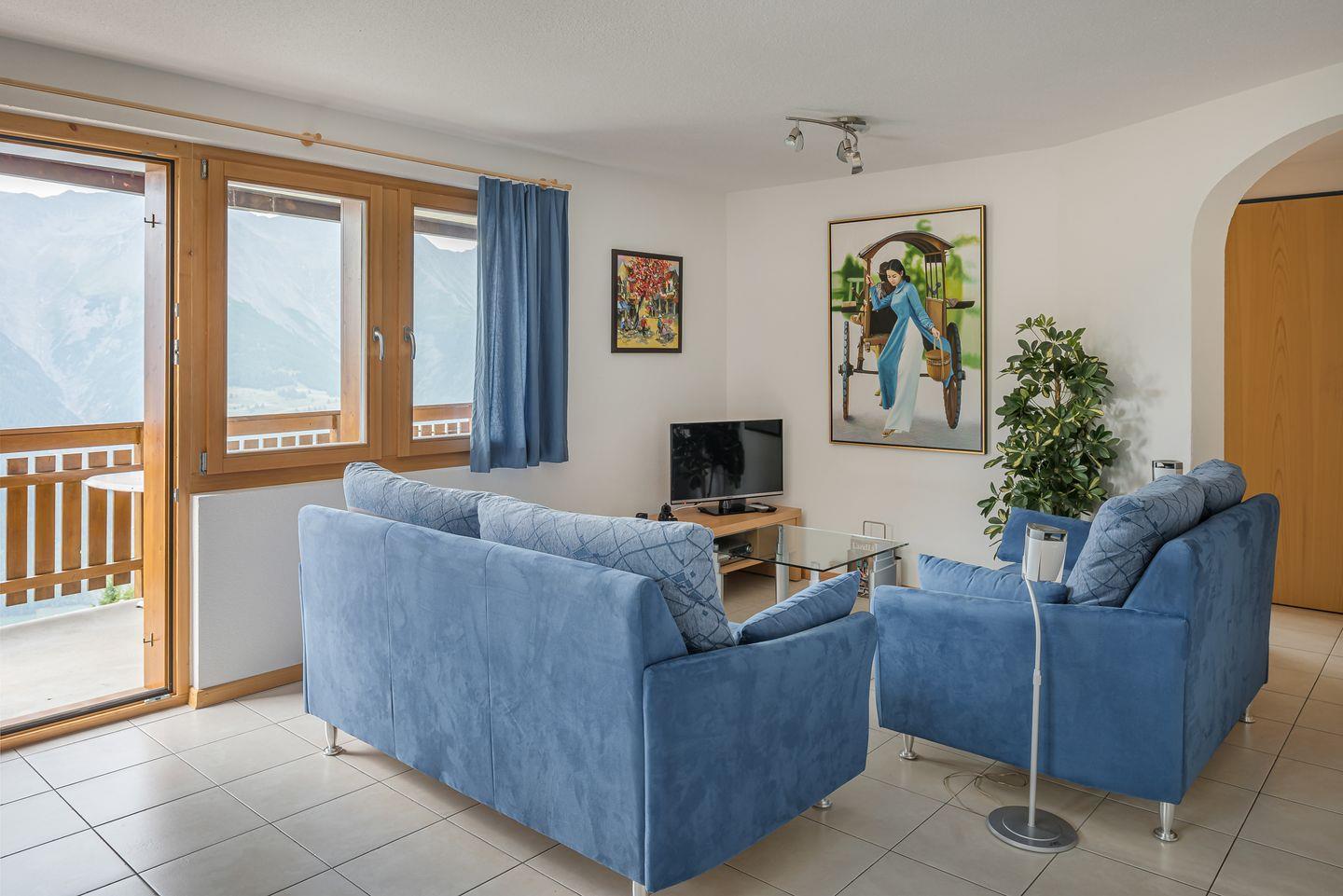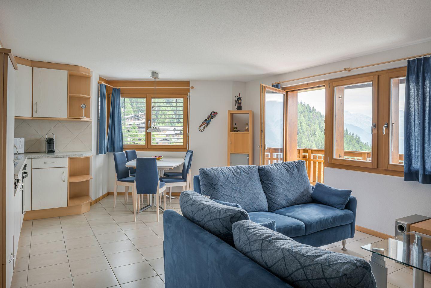 Wohn- und Essbereich mit Panoramafenster und Südbalkon mit freier Aussicht auf die gegenüberliegenden Berge bis hin zu den Walliser Alpen.