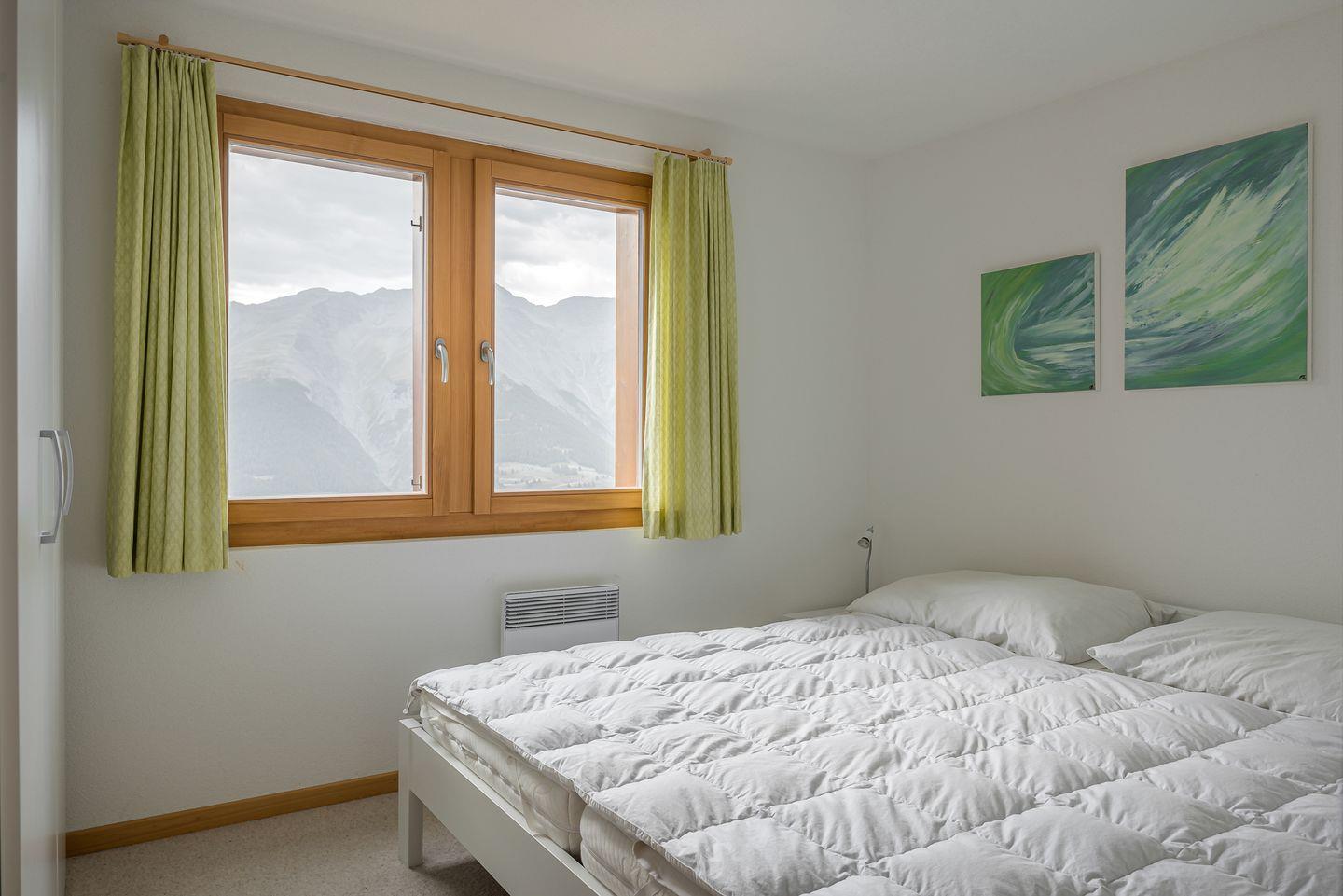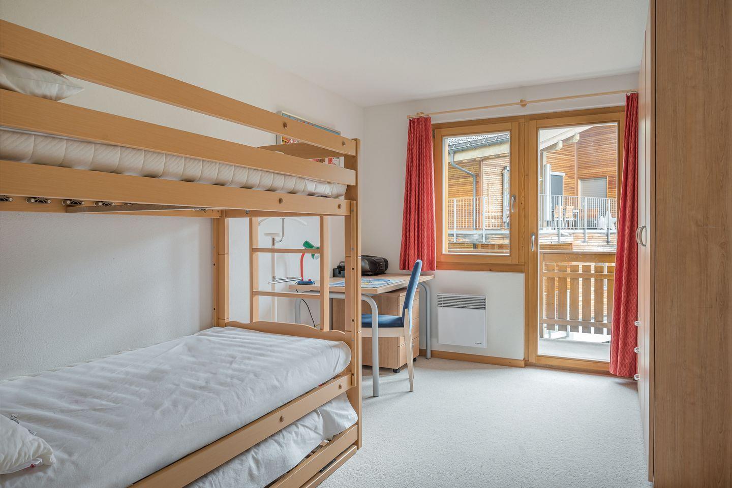 Doppelbettzimmer mit Blick auf die Walliser Bergwelt und Dreibettzimmer mit Hochbett und Unterschiebebett mit Ostbalkon und Blick auf das