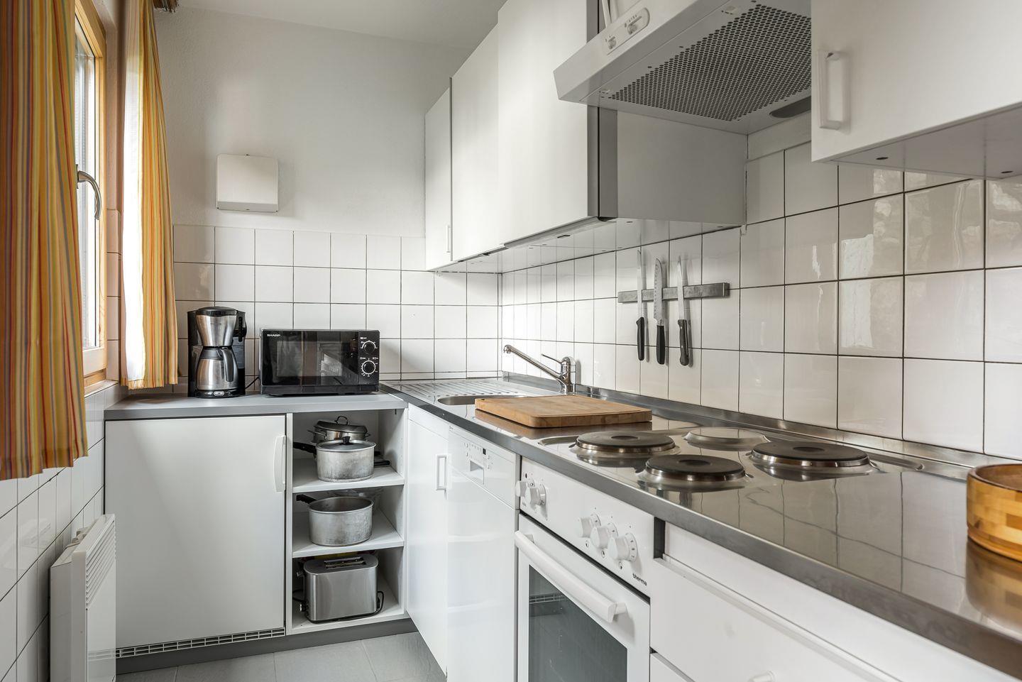 Die Wohnung verfügt über ein schönes Wohn- und Esszimmer mit Blick aufs Matterhorn und ausreichend Platz für gemütliche Abende oder Schlecht-Wetter-Tage. Von hier aus führt ein kleiner Flur in zwei geräumige Schlafzimmer, wobei eines mit großem Doppelbett und eines mit zwei Einzelbetten ausgestattet ist. Die Küche ist sehr gut ausgestattet, sodass auch Selbstversorger nicht aufs Kochvergnügen verzichten müssen. Das Bad wurde 2021 neu renoviert.
