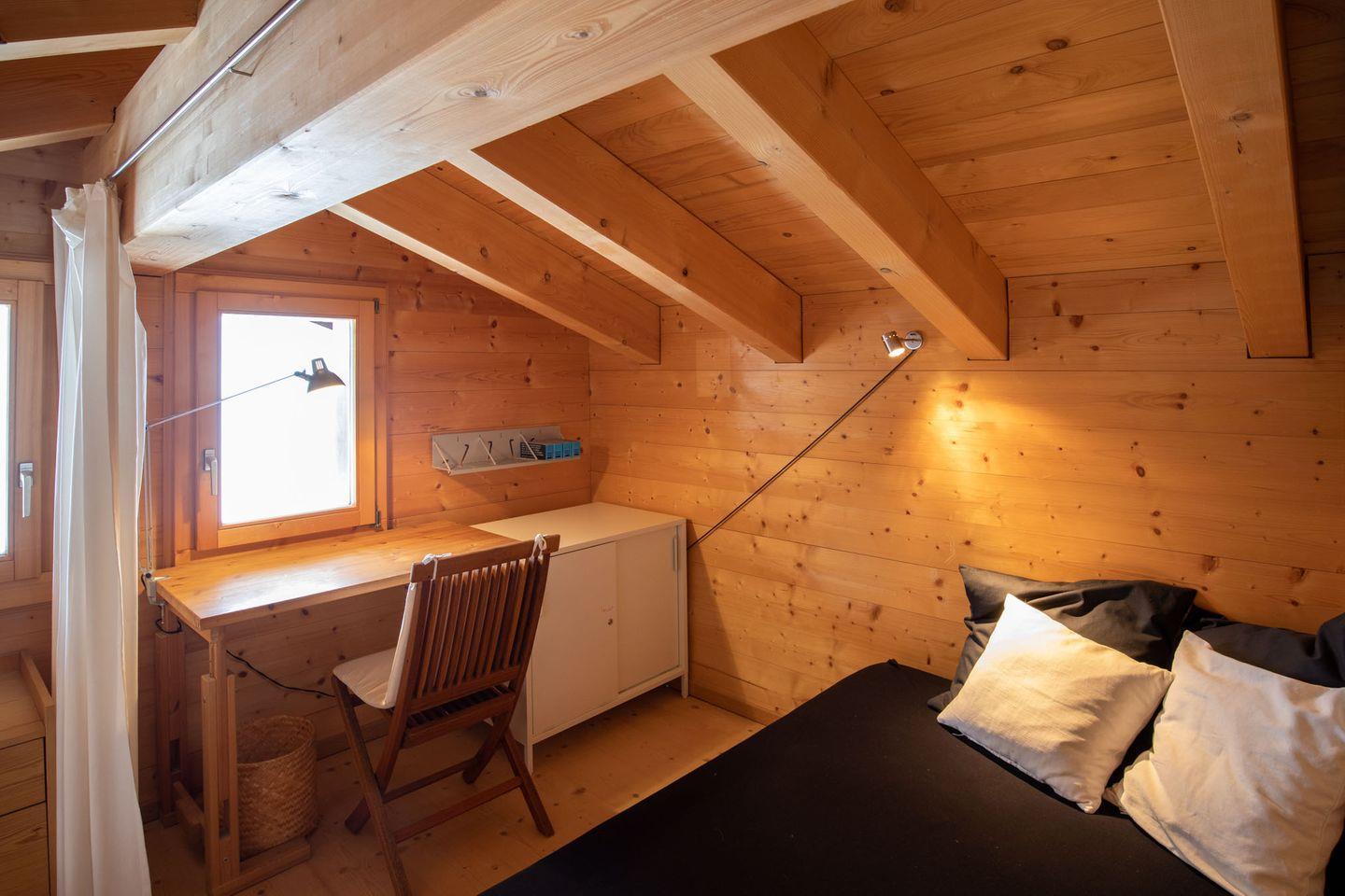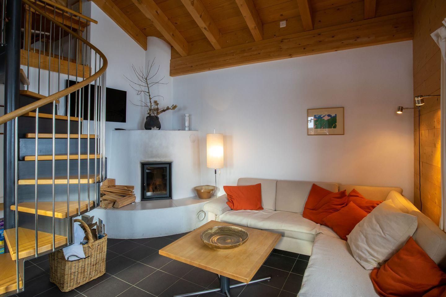 Genießen Sie zu jeder Jahreszeit Entspannung in diesem ebenso stilvollen wie gemütlichen Duplex-Apartment auf 76 m2! Das bequeme Ecksofa vor dem offenen Kamin lädt zum Entspannen und Lesen ein und bietet einen Blick auf die elegante Wendeltreppe, die zur Galerie mit Arbeitsbereich und Tagesbett führt. Dieser Wohnbereich bildet mit dem runden Holztisch und der offenen Küche das Herzstück dieses einzigartigen Architekten-Apartments. Zwei komplett in Holz gehaltene Schlafzimmer bieten gemütliche Rückzugsmöglichkeiten, jedes in unmittelbarer Nähe zu einem der beiden Badezimmer. Es sei darauf hingewiesen, dass die Schlafzimmer und das Bad auf der Galerie unter der Dachschräge eingebaut sind, was die Bewegungsfreiheit für größere Personen etwas einschränken kann.