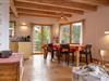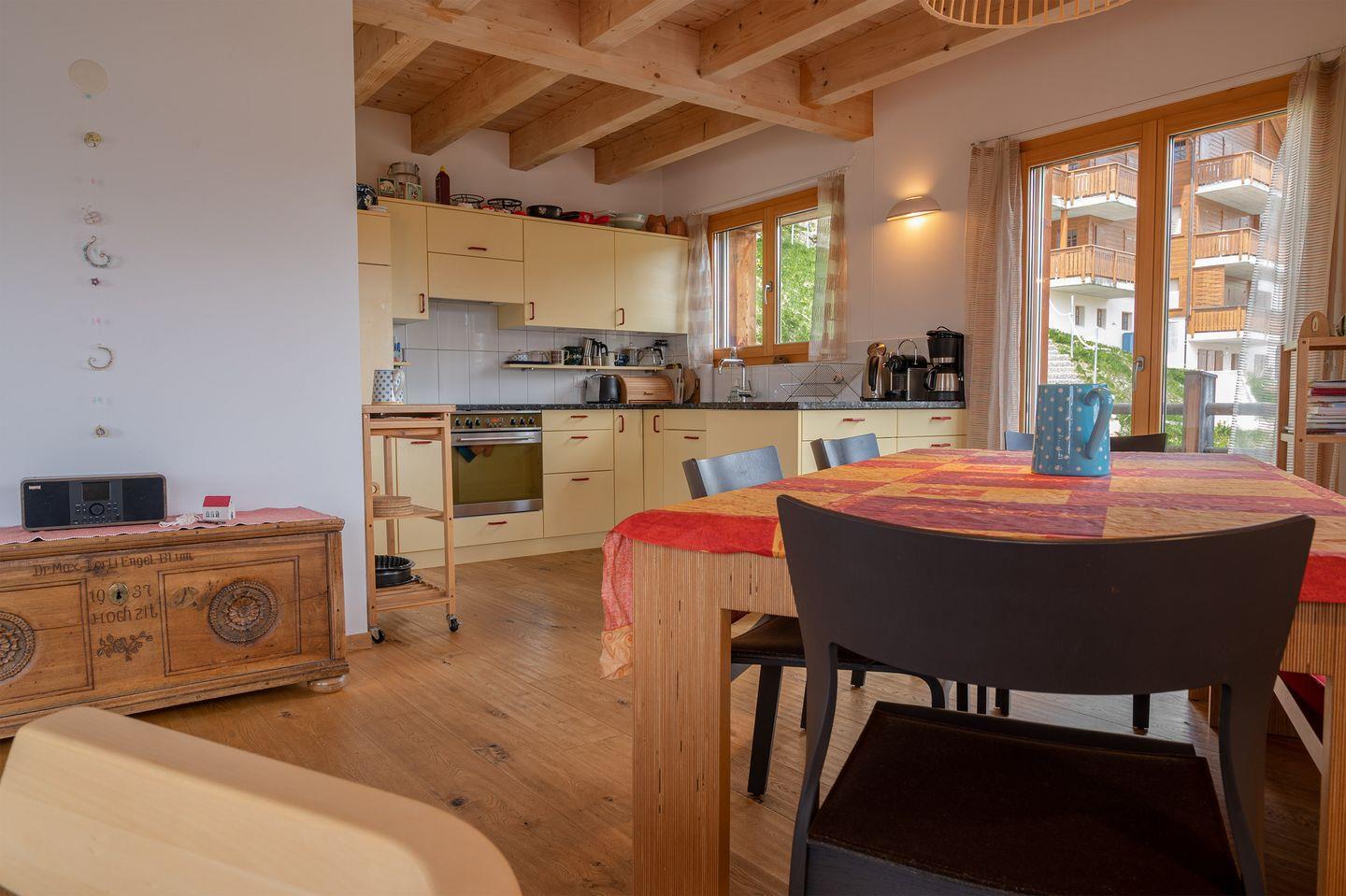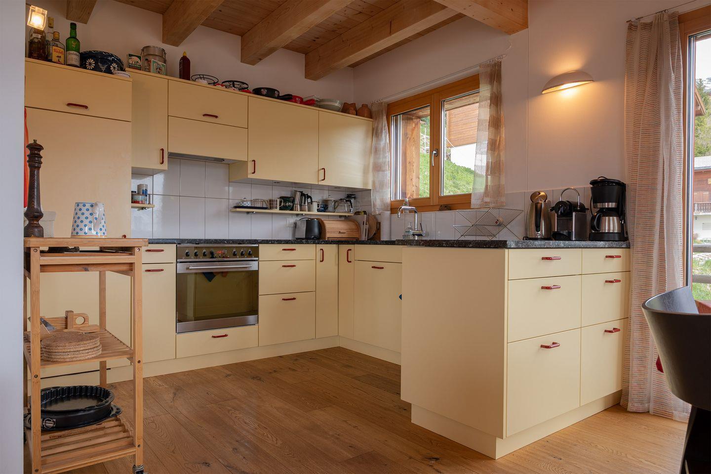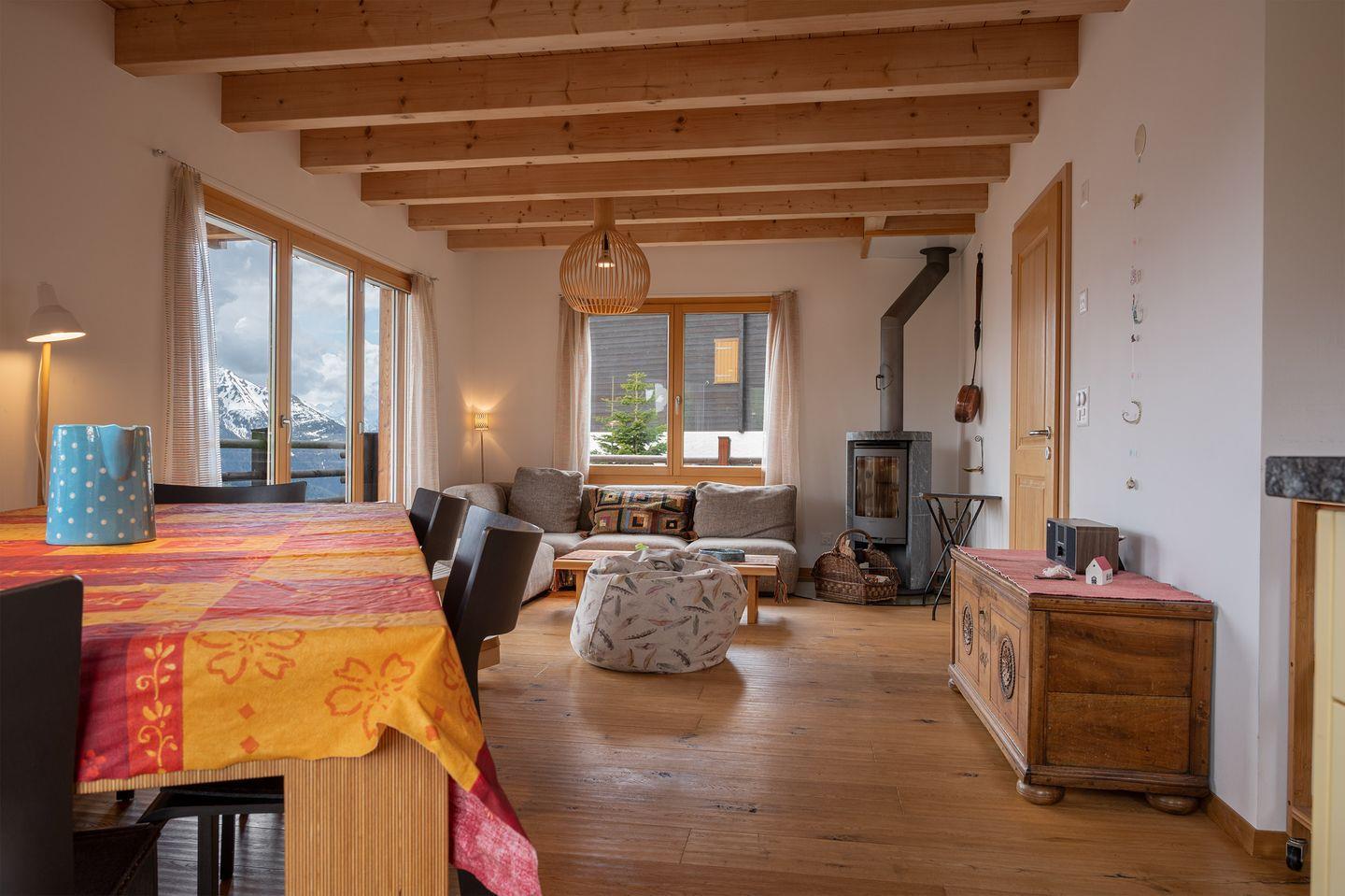 Beim Betreten des Chalets finden Sie einen Eingangsbereich, Tages WC, Wohnbereich mit offener Küche und Panorama Fenster.
