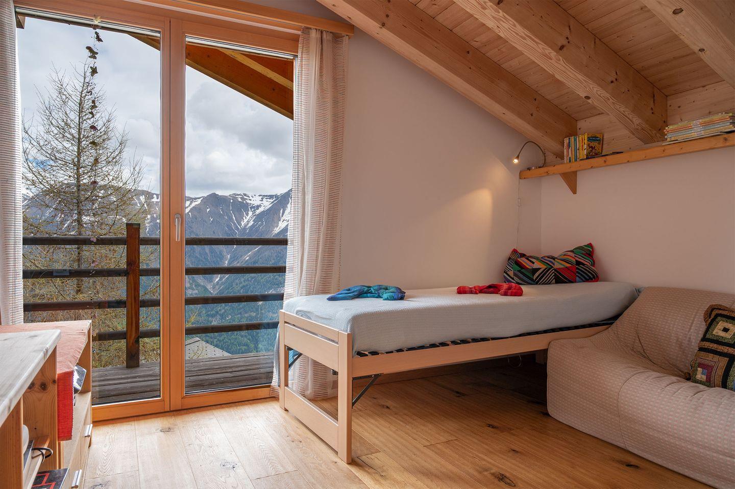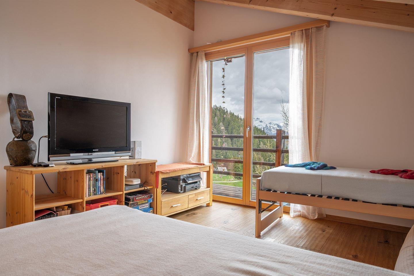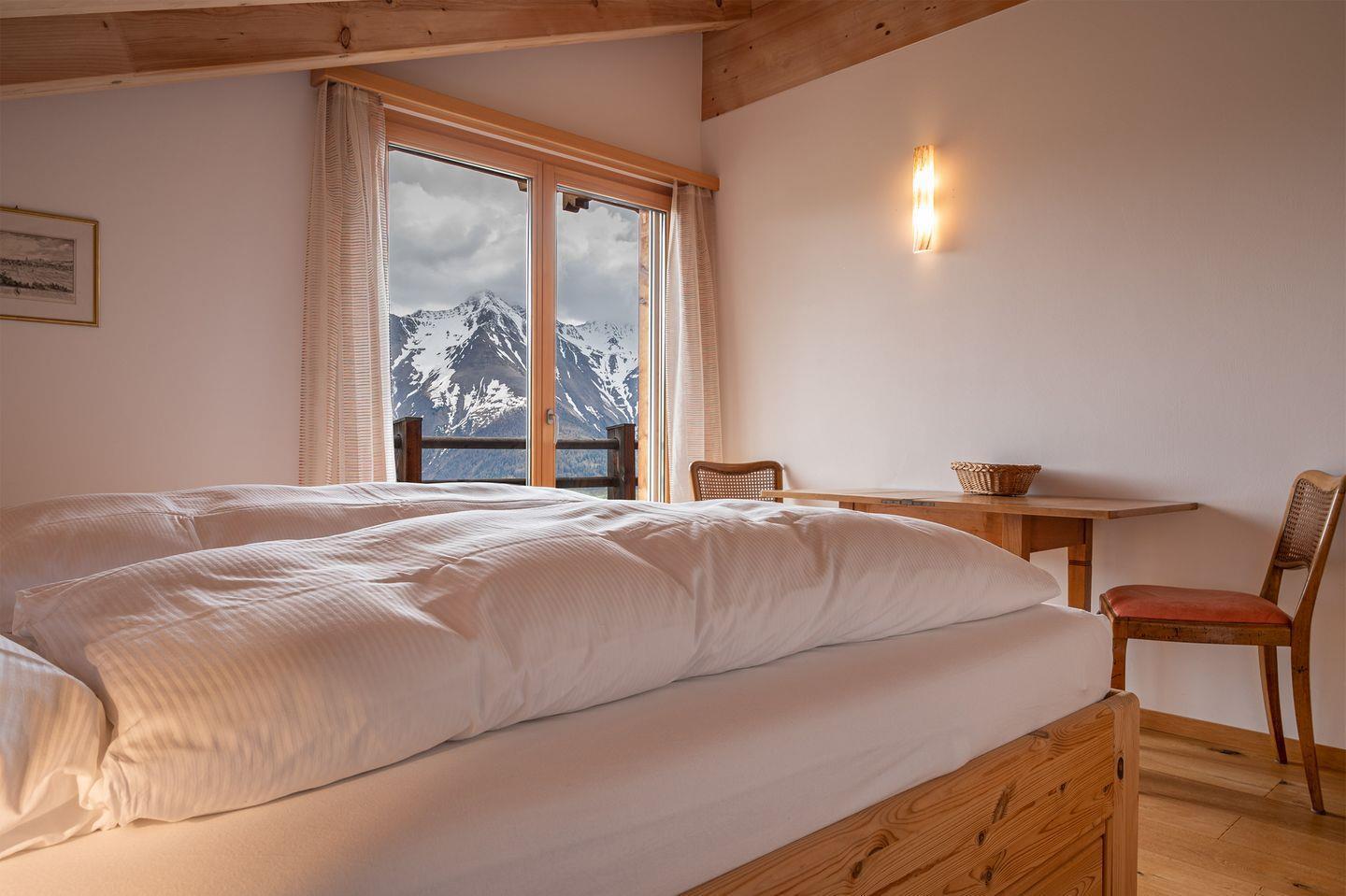 1 Großes Schlafzimmer mit Doppelbett, Blick ins Rhonetal sowie die 4000er des Wallis