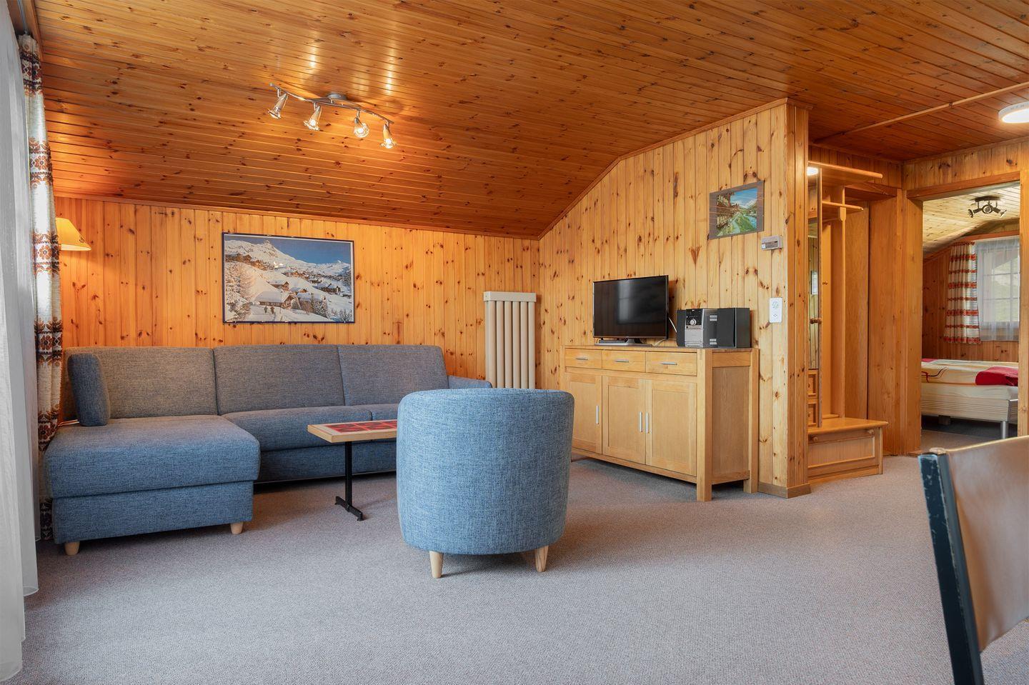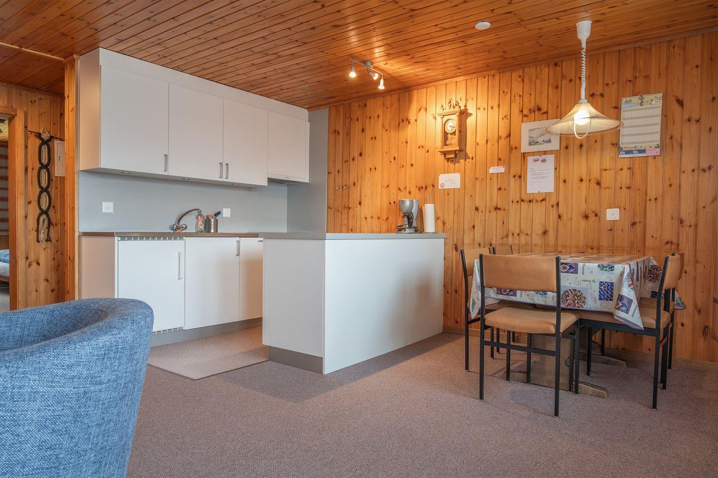 Wohn, Esszimmer mit offener Küche, 1 Doppelbettzimmer 1.60 x 2.00, ein Doppelbettzimmer mit 2 Einzelbetten, im Wohnzimmer 1 Auszugsofa / 1.40 breit geeignet für 1 Erwachsene oder 2 Kinder,1 Badezimmer mit Dusche, Lavabo und Toilette.