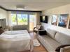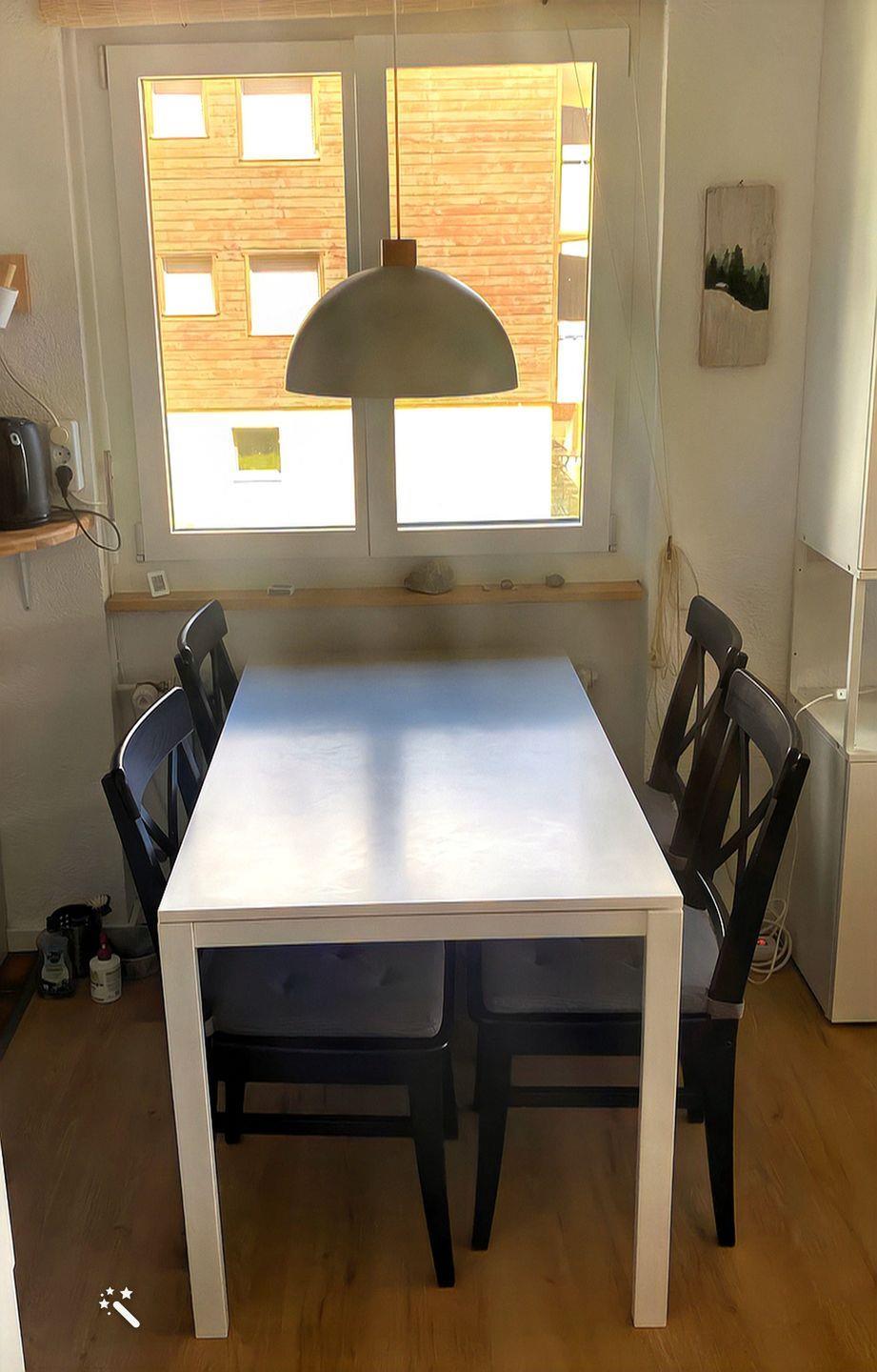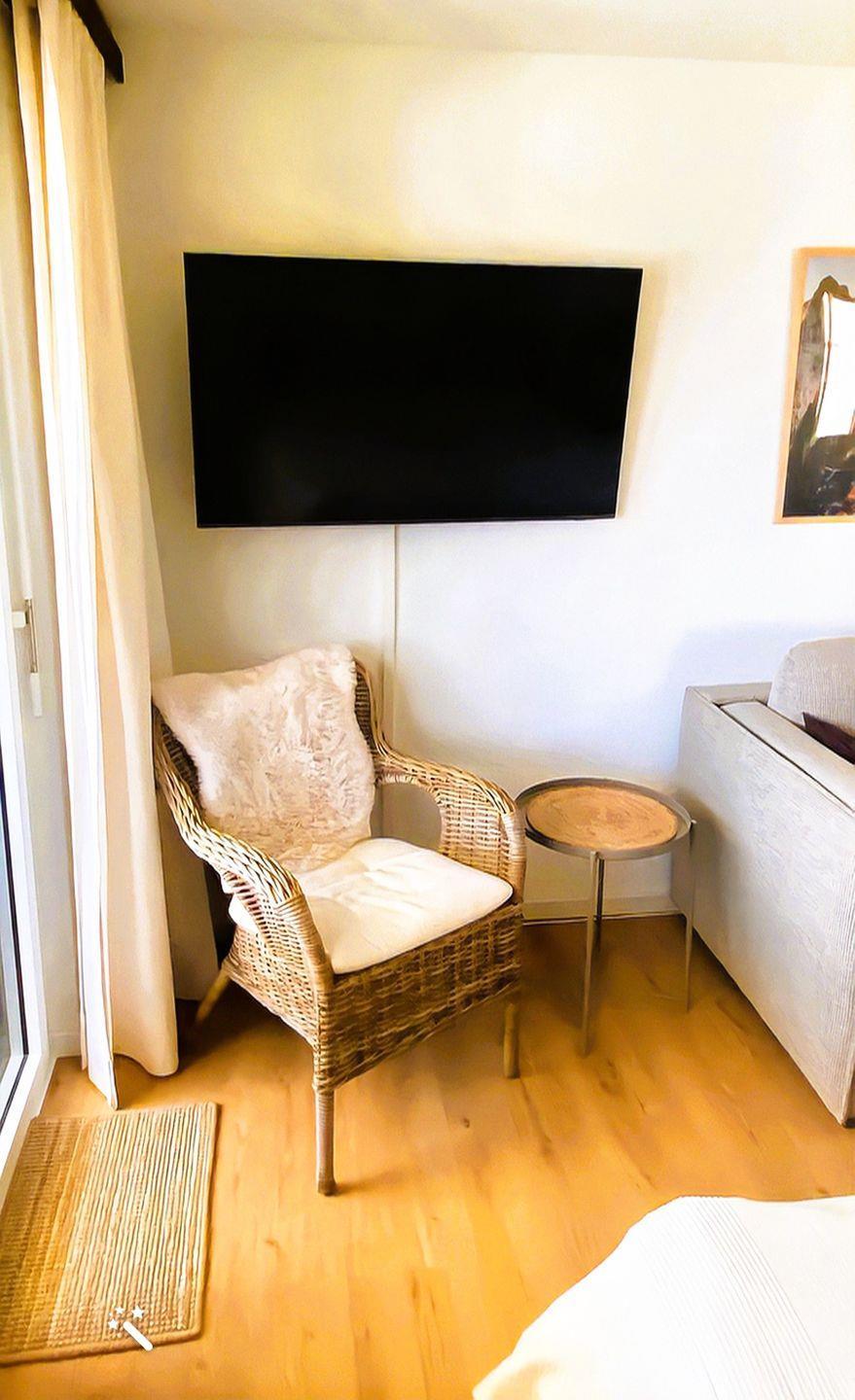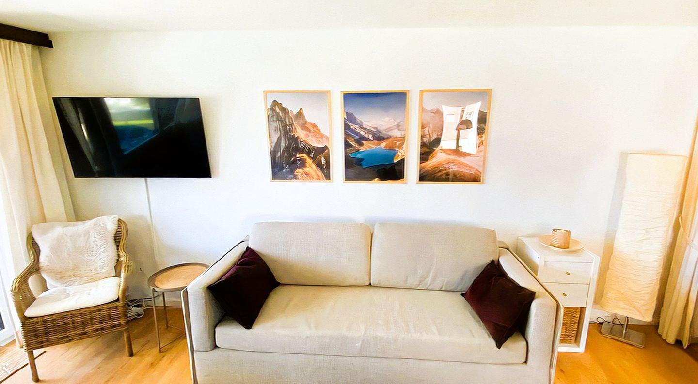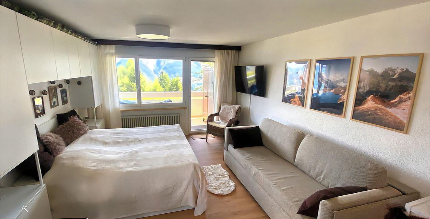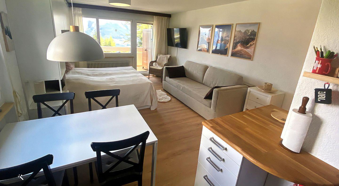 Wohnraum: Das gemütliche Studio bietet Platz für 2–3 Erwachsene. Der Wohnraum wurde 2025 grundlegend renoviert. Der offene Wohn- und Essbereich präsentiert sich hell und modern; die großzügige Fensterfront schenkt das ganze Jahr über einen fantastischen Blick auf die Berge. Der Wohnraum verfügt über ein großes Doppelbett mit viel Stauraum durch umliegende Schränke und ein Sofa mit Schlafmöglichkeit. Es ist ausgestattet mit einer hochwertigen Kaltschaummatratze in 80 × 190 cm. Ein großer Fernseher und WLAN ergänzen die moderne Ausstattung, ebenso wie Spiele und ein Fondue für gemütliche Winterabende. Der Balkon lädt jederzeit dazu ein, das Bergpanorama und die Natur zu genießen.
