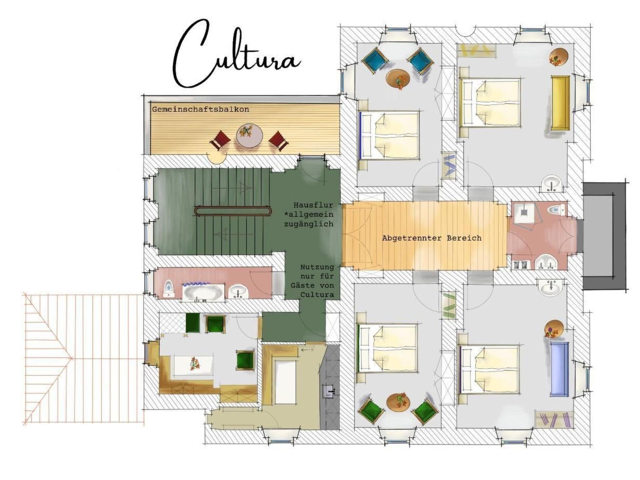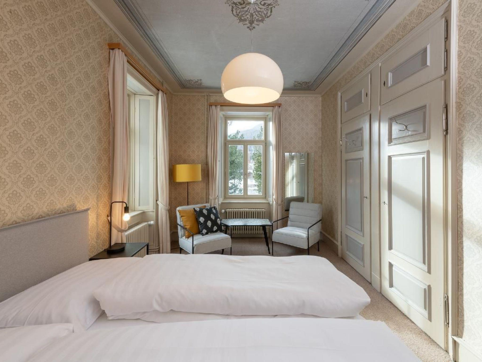 In der Innenausstattung lassen vier gemütliche Schlafzimmer mit Boxspringbetten, ein Badezimmer mit Dusche und WC sowie ein weiteres Badezimmer mit Badewanne und WC keine Wünsche offen. Die vollausgestattete Küche mit Essecke lädt zum gemeinsamen Kochen und Verweilen ein. Hinzu kommt ein bezauberndes Arvenholzzimmer mit TV, das Gemütlichkeit und Erholung verspricht. Durch den historischen Baustil der Villa ergeben sich architektonische Besonderheiten, die dem Inneren einen unvergleichlichen Charakter verleihen (Küche /Arvenholzstube und ein Badezimmer sind über den Flur erreichbar).