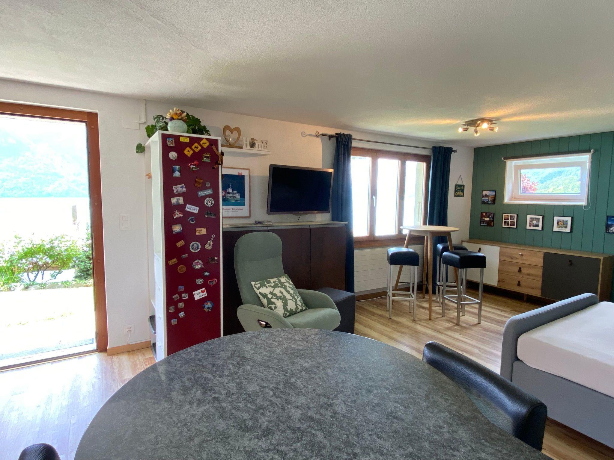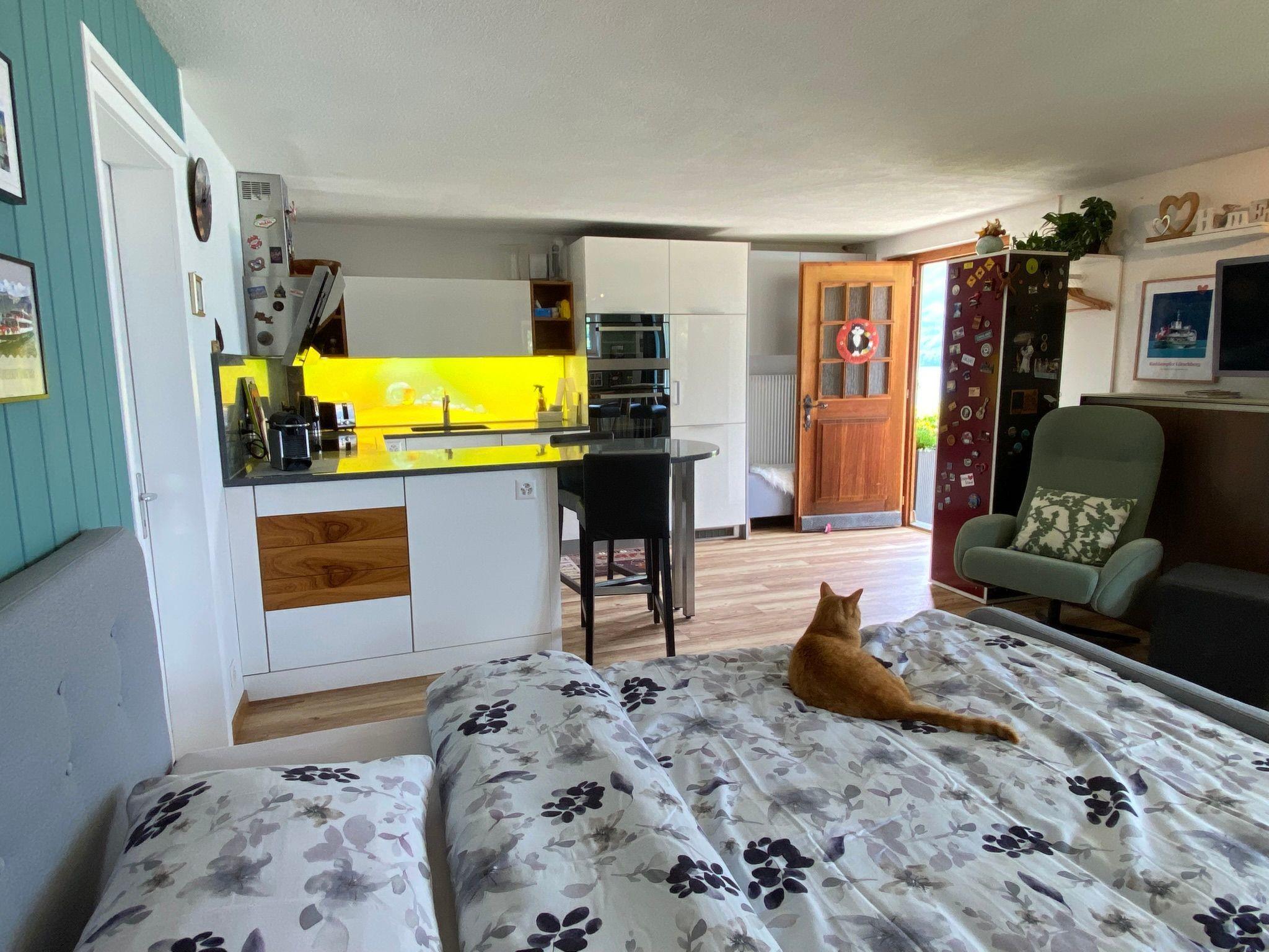 Entdecke deine perfekte Auszeit in dieser bezaubernden kleinen Ferienwohnung. Das Studio befindet sich in einem freistehenden Chalet und eignet sich hervorragend für 1 bis 2 Gäste. Die gepflegte Liegenschaft befindet sich hanglagig am Waldrand und besticht mit einer herrlicher Seesicht. Die erhöhte und ruhige Lage ermöglicht es dir, die Natur in vollen Zügen zu genießen. Das Objekt ist leider nicht Rollstuhlgängig. Deshalb müssen wir gehbehinderten Menschen von unserem Objekt abraten. Mit dem Auto ist es nicht möglich, bis ganz zur Liegenschaft zu fahren. Das Gepäck muss für die letzten 80m getragen werden. Ein einzigartiger Panoramablick über den ganzen Brienzersee und die umliegenden Berge, entschädigt dich jedoch gleich wieder für alles.
