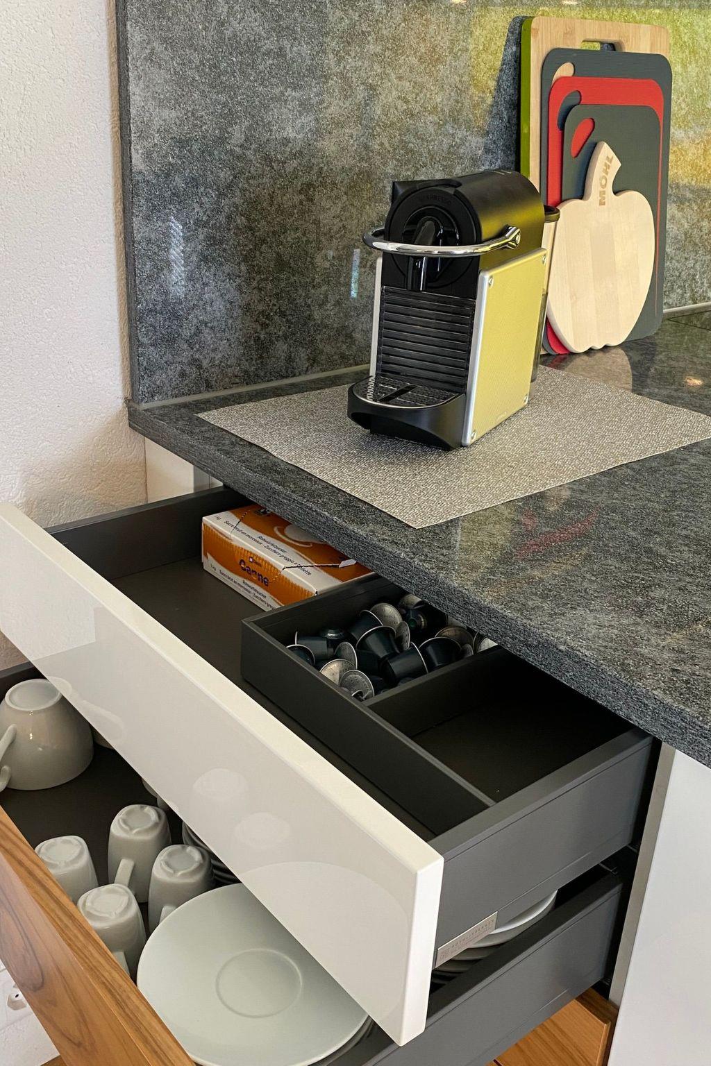 Unsere Ferienwohnung ist mit allem ausgestattet, was du für einen komfortablen Aufenthalt benötigst. Eine Kapsel-Kaffeemaschine inklusive Kaffee, verspricht unkomplizierte Kaffeemomente am Morgen, während die Spülmaschine den Abwasch erleichtert. Die Mahlzeiten lassen sich schnell und energieeffizient auf einem Induktionsherd zubereiten. Auch ein Wasserkocher, ein Toaster sowie eine voll ausgestattete Küche stehen dir zur Verfügung. In einem separaten Raum findest du zudem zur gemeinsamen Nutzung eine Waschmaschine und ein Tumbler.