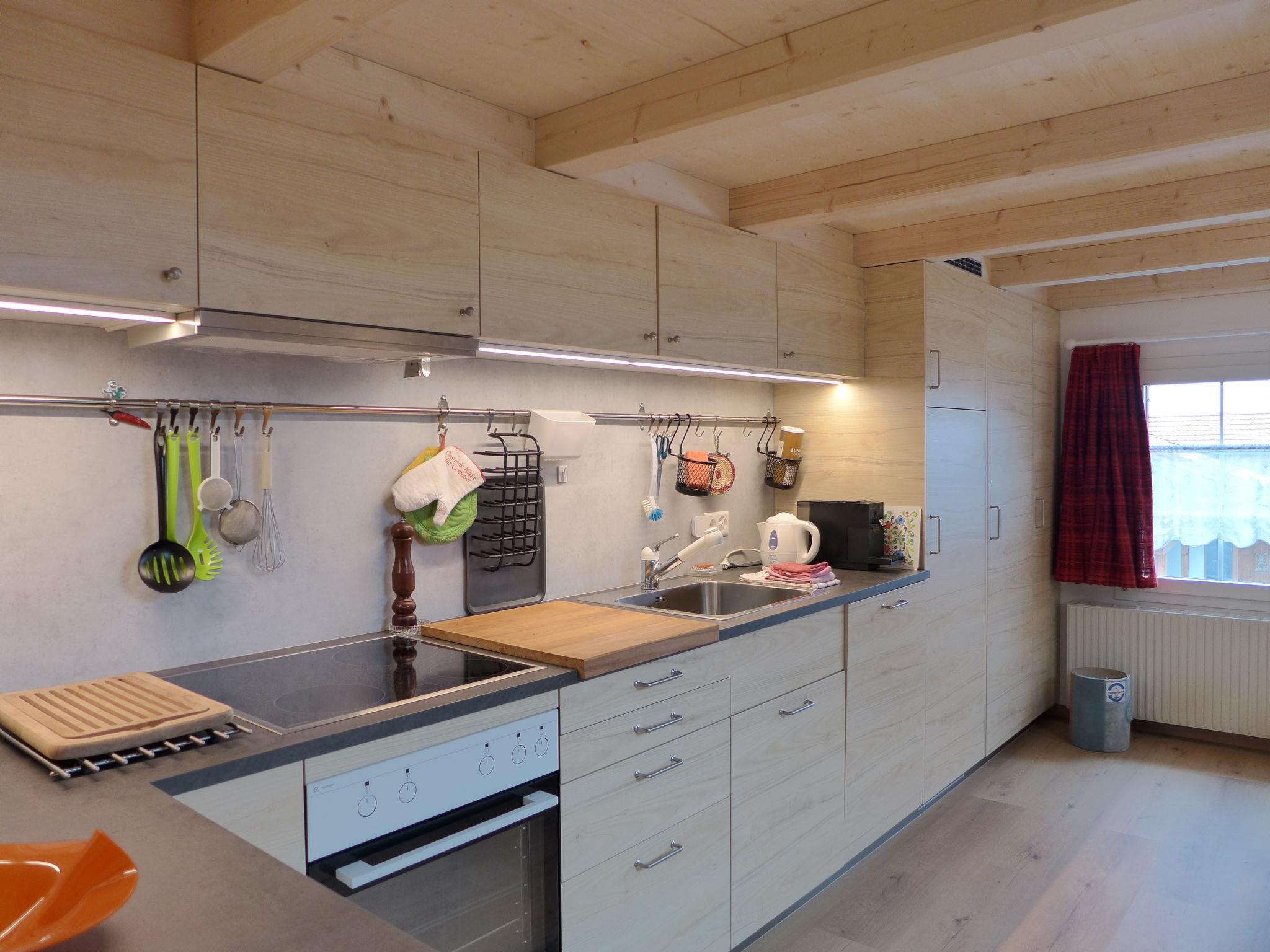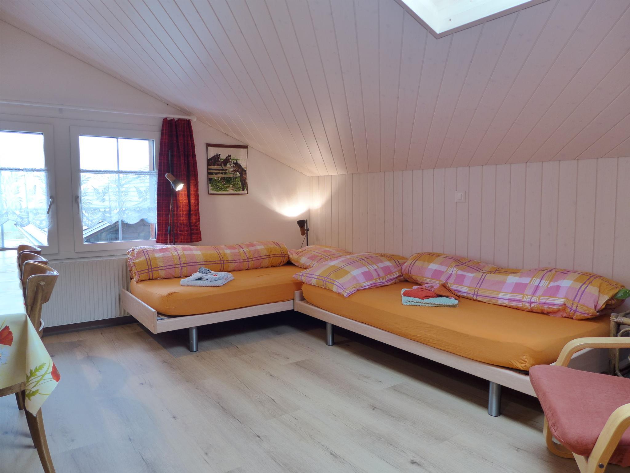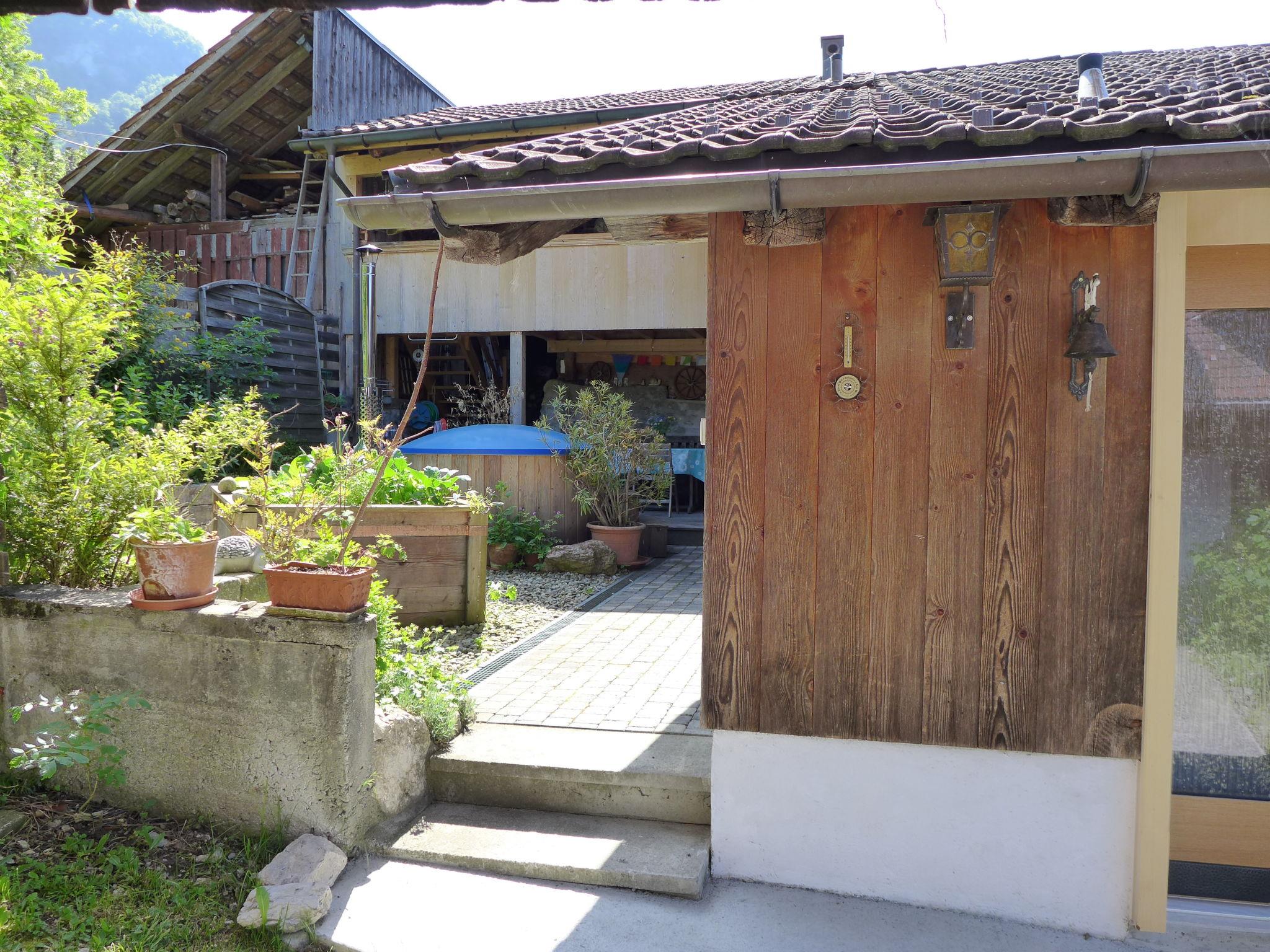 "Beim Thor Klein", 2-Zimmer-Wohnung 40 m2, im Obergeschoss. Geräumig und hell, einfach und gemütlich eingerichtet: offenes grosses Wohn-/Schlafzimmer mit 2 Betten (90 cm, Länge 200 cm), Esstisch, Flachbildschirm, Radio, Stereoanlage und DVD. 1 Zimmer mit 1 x 2 Etagenbetten (90 cm, Länge 200 cm). Offene Küche (Backofen, Geschirrspüler, 3 Glaskeramikplatten, Toaster, Wasserkocher, Mikrowelle, elektrische Kaffeemaschine, Kapseln für die Kaffeemaschine (Delizio) extra, Racletteofen, Fondue Set (Käse)). Dusche/WC. Kleine Terrasse. Balkonmöbel. Schöne Sicht auf die Berge und die Landschaft. Zur Verfügung: Babybett bis 2 Jahre (extra), Haartrockner. Internet (WLAN, gratis). Parkplatz (1 Auto). Bitte beachten: Nichtraucher-Unterkunft. Maximal 1 Haustier/Hund erlaubt.