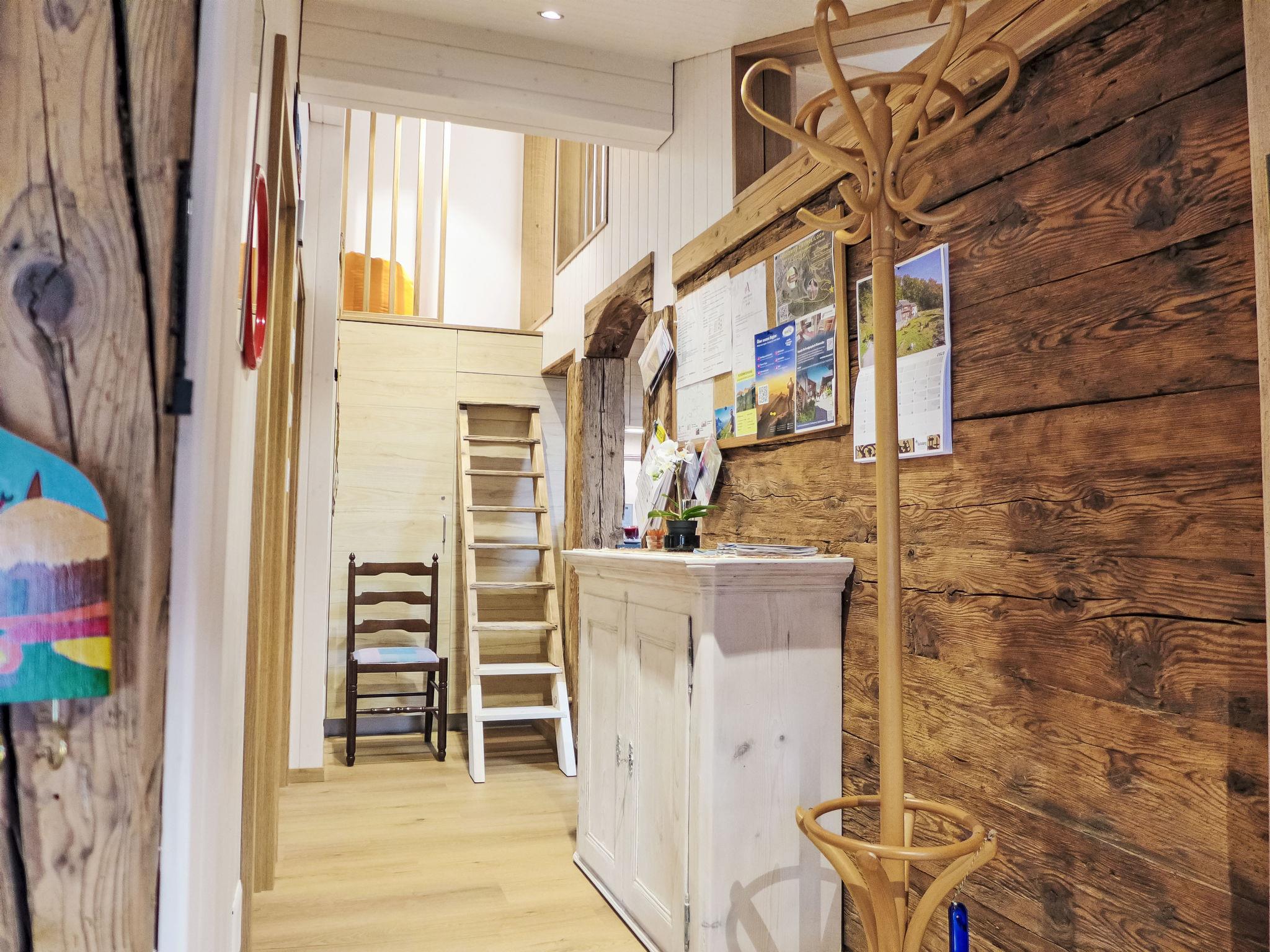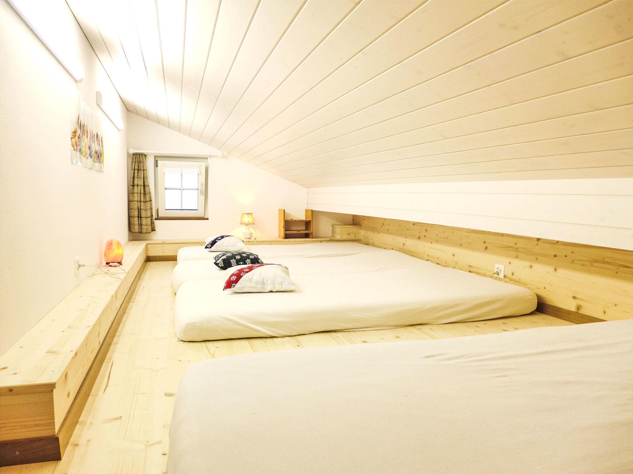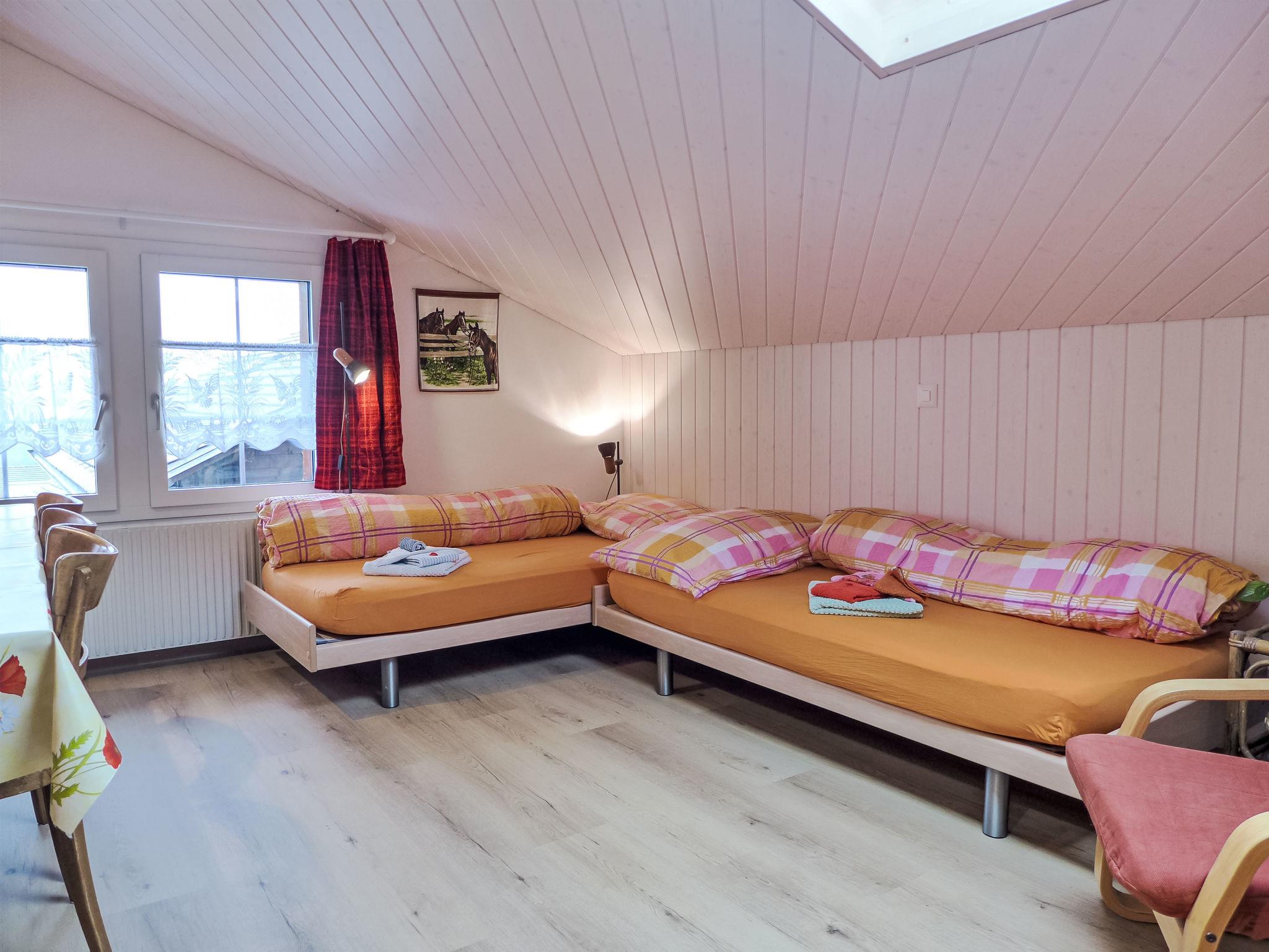 "Beim Thor Gross", 3-Zimmer-Wohnung 50 m2 auf 2 Stockwerken, im Obergeschoss. Geräumig und hell, teilweise abgeschrägt, einfach und gemütlich eingerichtet: offenes grosses Wohn-/Schlafzimmer mit 2 Betten (90 cm, Länge 200 cm), Esstisch, Flachbildschirm, Radio, Stereoanlage und DVD. 1 Zimmer mit 1 x 2 Etagenbetten (90 cm, Länge 200 cm). Offene Küche (Backofen, Geschirrspüler, 3 Glaskeramikplatten, Toaster, Wasserkocher, Mikrowelle, elektrische Kaffeemaschine, Kapseln für die Kaffeemaschine (Delizio) extra, Racletteofen, Fondue Set (Käse)). Dusche/WC. Dachgeschoss: (Leiter) 1 abgeschrägtes Zimmer mit 3 Schlafmöglichkeiten (90 cm, Länge 200 cm). Kleine Terrasse. Balkonmöbel. Schöne Sicht auf die Berge und die Landschaft. Zur Verfügung: Babybett bis 2 Jahre (extra), Haartrockner. Internet (WLAN, gratis). Parkplatz (1 Auto). Bitte beachten: Nichtraucher-Unterkunft. Maximal 1 Haustier/Hund erlaubt.