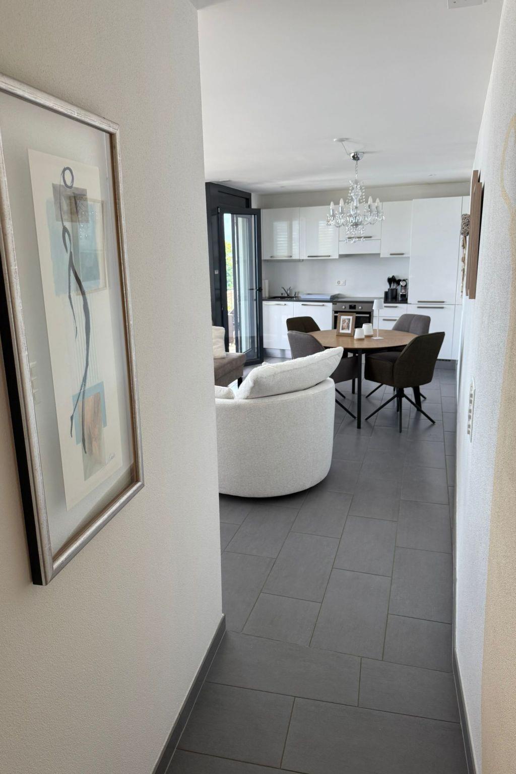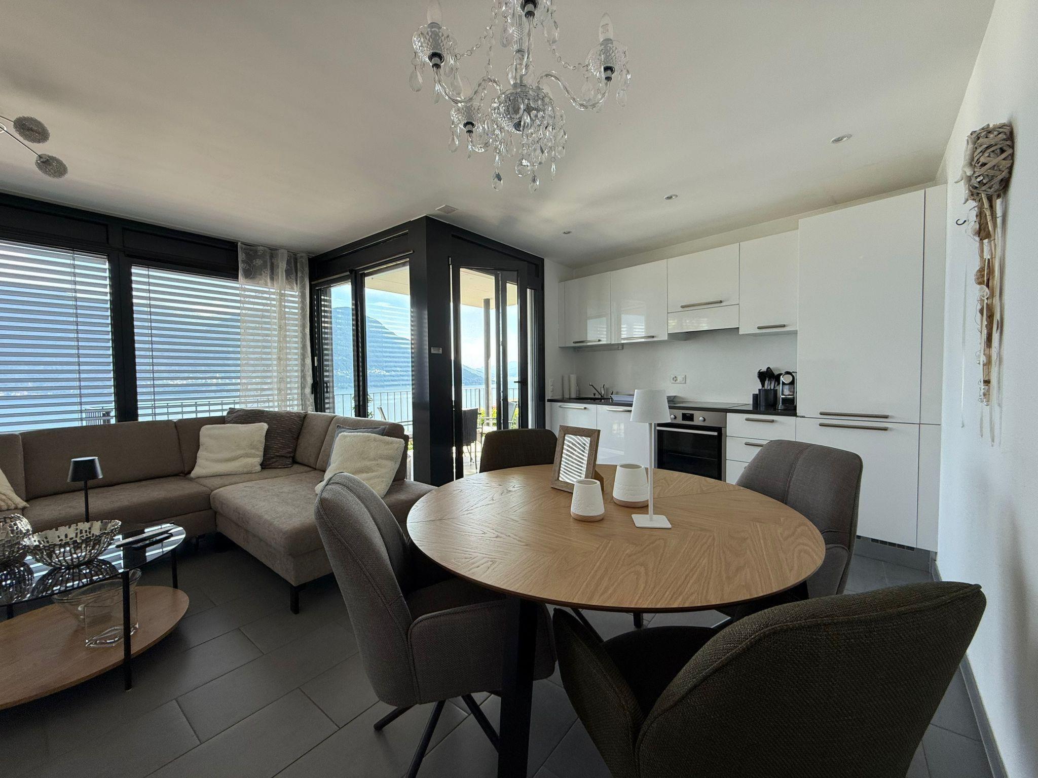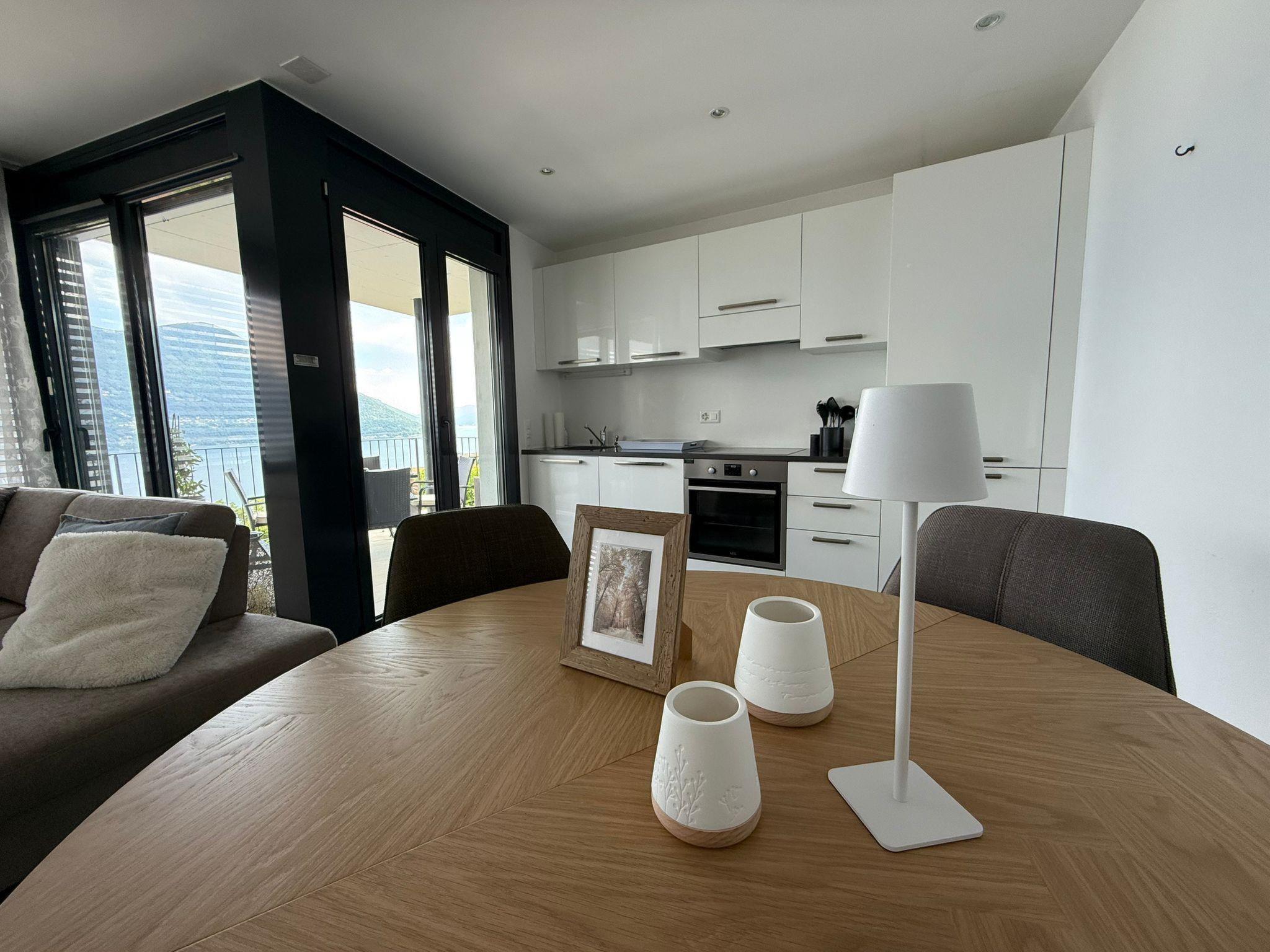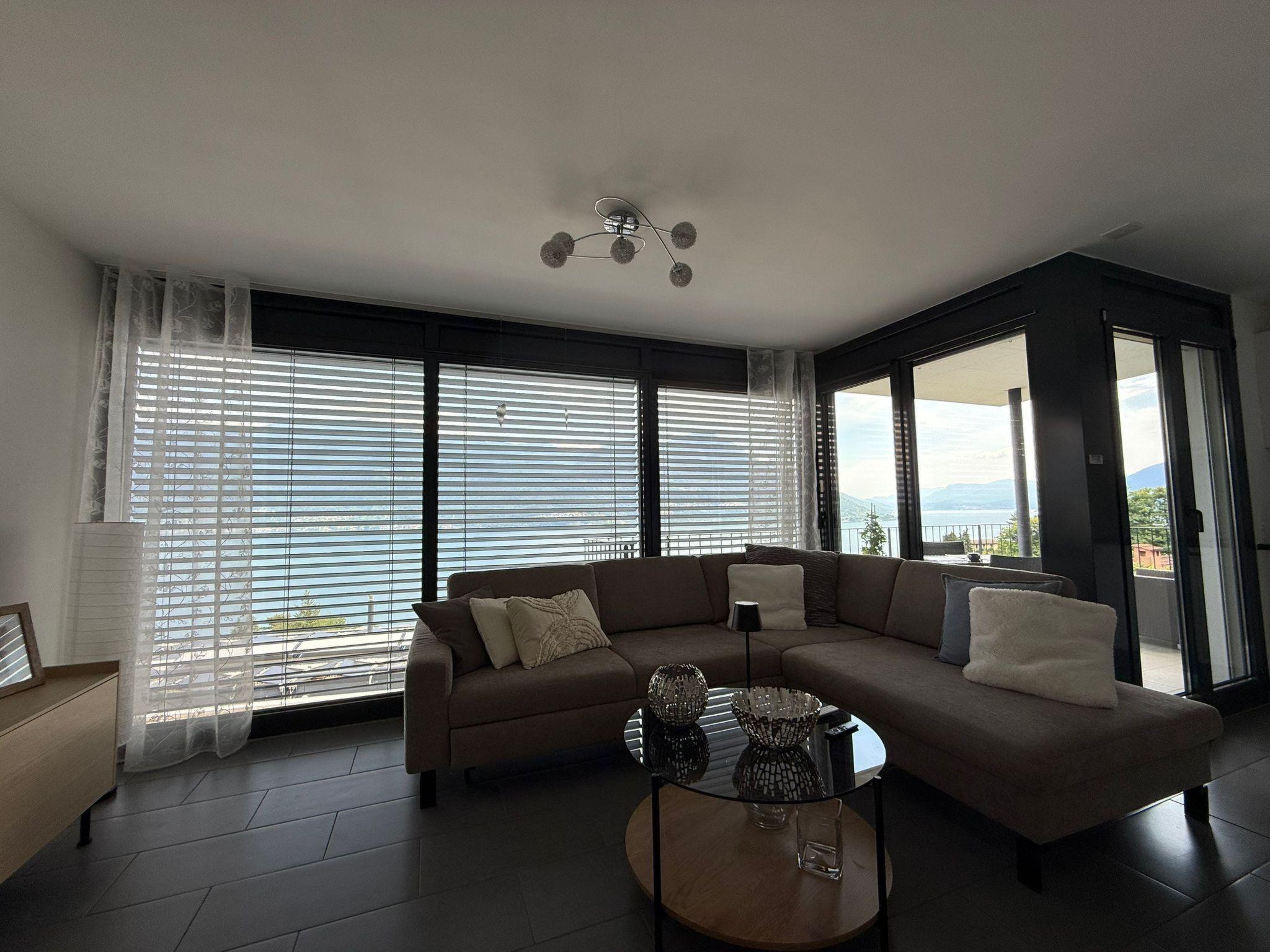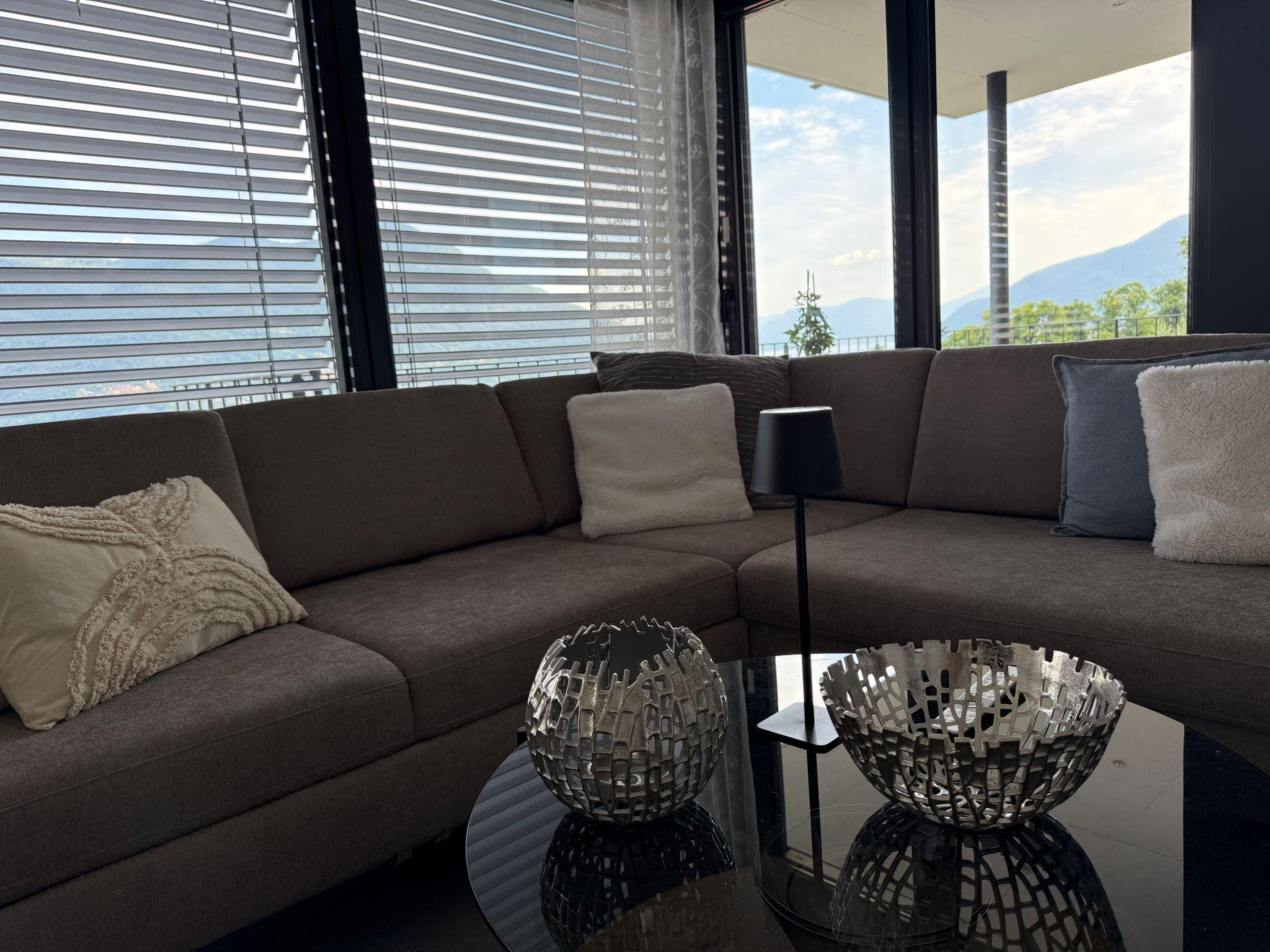 Was für eine Lage! Diese großzügige Ferienwohnung für vier Personen liegt ganz in der Nähe des Sacro Monte di Brissago, in einer ruhigen Straße, die direkt zur Wallfahrtstätte führt. Es ist ein Ort der Ruhe und der Kraft in exponierter Lage über dem Lago. Ideal für Menschen, die das Besondere suchen. Das lichtdurchflutete 3,5 Zimmer-Domizil befindet sich in der zweiten Etage eines exquisiten Anwesens mit drei Wohneinheiten. Von Ihrem persönlichen Parkplatz direkt am Haus geht es mit dem Lift nach oben. Dann trennen Sie nur noch ein paar Stufen und Sie sind da, in Ihrem ganz privaten Urlaubsrefugium, in dem Ihnen der See zu Füßen liegt. Egal, wo Sie sich in diesem elegant in Beige und Schwarz gestalteten Appartement befinden – ob Sie in der offenen Küche das Essen zubereiten, am Esstisch ein Glas Tessiner Wein genießen, den Abend in der anschließenden Sofaecke ausklingen lassen oder sich in eines der beiden Schlafzimmer zurückziehen – Sie haben immer einen atemberaubenden Blick auf den See und das gegenüberliegende Bergpanorama. Große bodentiefe Fenster gewähren Ihnen einmalige Ausblicke – aus jeder Perspektive. Und was gibt es Schöneres, als am nächsten Morgen auf der lichtdurchfluteten Terrasse in bequemen Rattan-Stühlen den Tag zu begrüßen. Der dazugehörige Espresso, Cappuccino oder Latte Macchiato ist schnell zubereitet, denn zur modernen, gut ausgestatteten Küche inklusive Spülmaschine gehört eine Nespresso-Kaffeemaschine. Im Anschluss ist es höchste Zeit, die Langschläfer zu wecken. Noch ein Abstecher in eines der beiden Badezimmer mit Lavabo und Dusche, und es kann losgehen, um die kulturellen und landschaftlichen Sehenswürdigkeiten von Brissago zu entdecken. Mit dem Auto sind Sie in knapp fünf Minuten im Zentrum. Oder Sie wählen den wunderschönen Spazierweg, der direkt am Haus vorbeiführt und Sie in circa 30 Minuten zum See bringt. Ob Wanderungen, sportliche Aktivitäten, Sightseeing oder einfach nur die Seele baumeln lassen – diese Wohnung bietet Ihnen beste Bedingungen, um Ihre Zeit am Lago Maggiore in vollen Zügen zu genießen.
