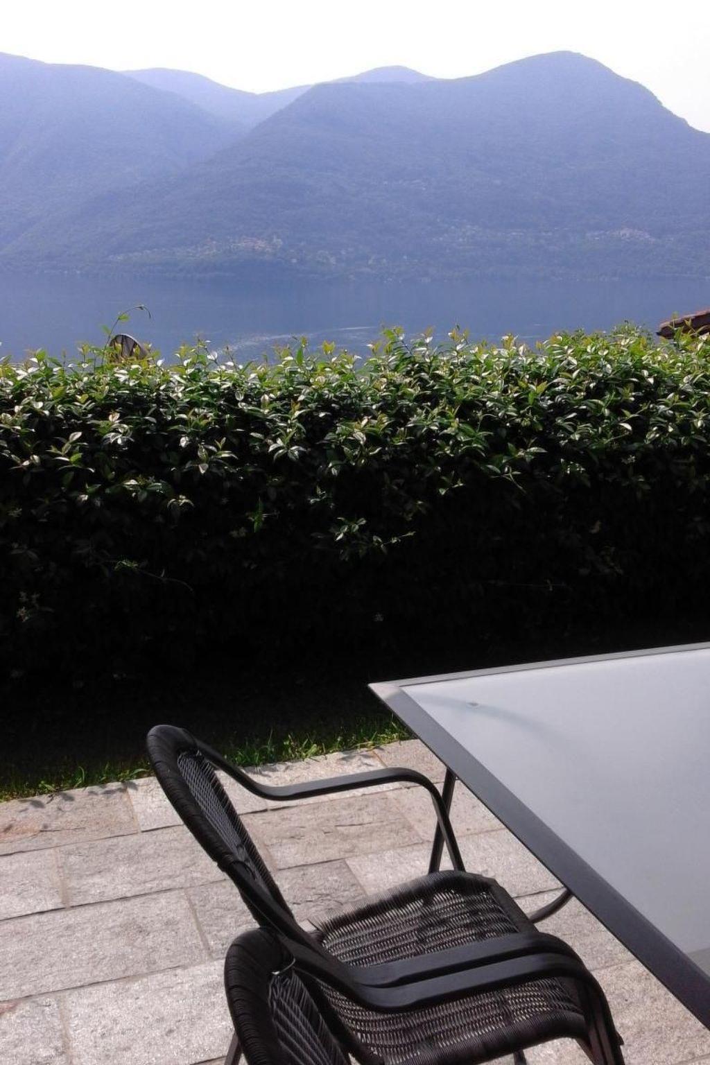 Zur Wohnung gehört eine sonnige Sitzecke mit Gartentisch und Liegestühlen sowie eine Liegewiese direkt vor der Wohnung. Hier können Sie die Ruhe und den Blick über die Dächer von Brissago und den Lago Maggiore genießen.