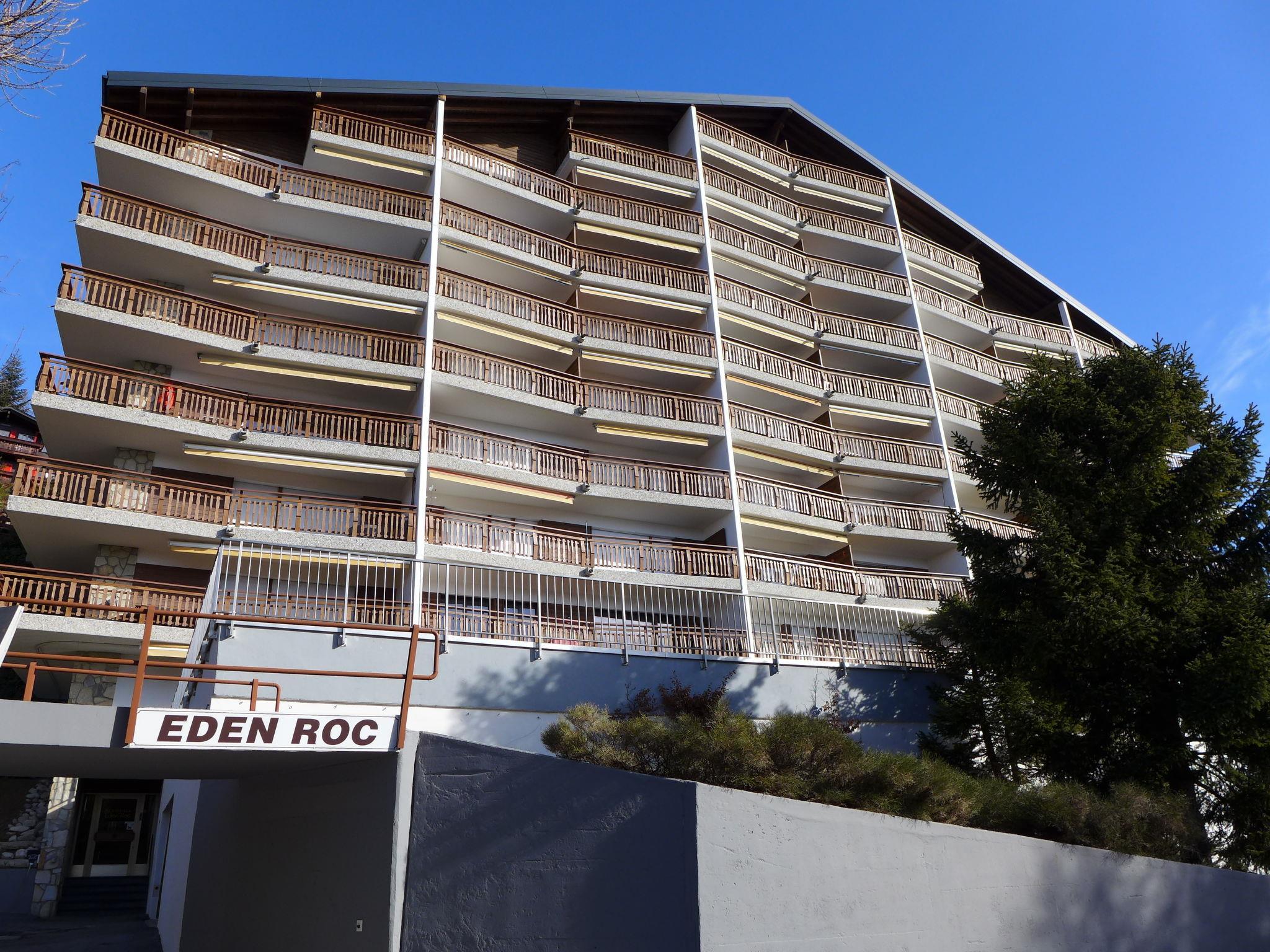 Mehrfamilienhaus "Eden Roc", auf 9 Stockwerken. Im Ort, 1.1 km vom Zentrum von Montana, ruhige, sonnige Lage, verkehrsberuhigte Zone, 50 m vom Waldrand, 950 m vom See, 600 m vom Skigebiet, in einer Sackgasse, Richtung Süden. Im Hause: Fahrstuhl, Skiraum, Zentralheizung, Waschmaschine, Wäschetrockner (zur Mitbenutzung, extra), Trockenraum. Parkplatz (beschränkte Anzahl). Einkaufsgeschäft 1 km, Supermarkt 1.2 km, Restaurant 1 km, Bäckerei 1.3 km, Zentrum zu Fuss in 5 Minuten erreichbar, Bushaltestelle "Résidence Forêt" 300 m, Bahnstation "Funiculaire Montana Gare" 2 km, Badesee "Moubra" 2.3 km. Golfplatz (18 Loch) 2.2 km, Skisportanlagen 600 m, Eisfeld 1.2 km. Bekannte Seen in der Umgebung sind gut erreichbar: Grenon 950 m, Etang Long 2.3 km. Bitte beachten: Gratis Skibus.