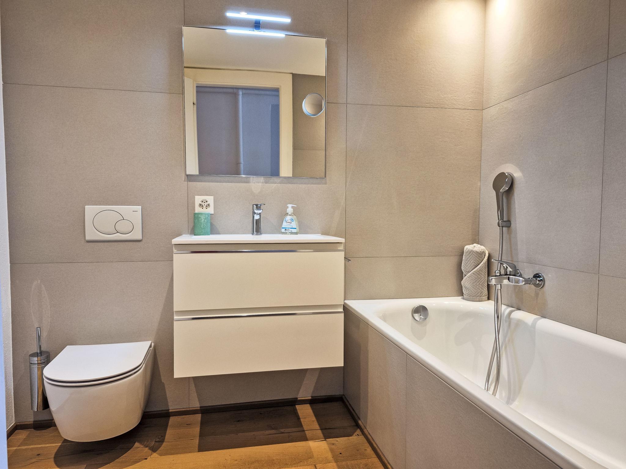 "Résidence Terrazza 1", 4-Zimmer-Wohnung 80 m2 im 1. Stock. Geräumig, teilweise renoviert, sehr komfortabel und geschmackvoll eingerichtet: grosses Wohn-/Esszimmer mit Kabel-TV. Ausgang zum Balkon. 1 Zimmer mit 1 Bett (100 cm, Länge 200 cm). Ausgang zum Balkon. 1 Zimmer mit 1 Bett (100 cm, Länge 200 cm). Ausgang zum Balkon. 1 grosses Zimmer mit 1 franz. Bett (160 cm, Länge 200 cm), Dusche/WC. Ausgang zur Terrasse, Richtung Norden. Grosse, offene Küche (Backofen, Geschirrspüler, 4 Induktionskochplatten, Wasserkocher, Tiefkühler, elektrische Kaffeemaschine, Kapseln für die Kaffeemaschine (Nespresso) extra, Racletteofen, Fondue Set (Käse)). Bad/WC. Grosser Balkon, Südostlage, kleine Terrasse, Nordlage. Balkonmöbel. Sicht auf die Landschaft. Zur Verfügung: Bügeleisen, Haartrockner. Internet (WLAN, gratis). Garage Nr. 2 (1 Auto), Höhe 230 cm, Breite 260 cm. Bitte beachten: Nichtraucher-Unterkunft. Die Wohnung verfügt außerdem über einen Keller, in dem sich ein Heimtrainer befindet.
