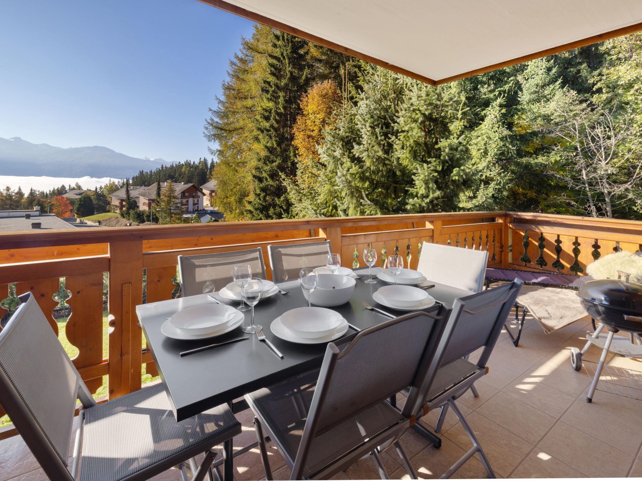 "Résidence Orana 3", 3-Zimmer-Wohnung 82 m2 im 1. Stock. Objekt geeignet für 4 Erwachsene + 2 Kinder. Komfortabel und schön eingerichtet: Wohn-/Esszimmer mit 1 Diwanbett (135 cm, Länge 190 cm), Kabel-TV, Flachbildschirm, CD, Stereoanlage, DVD, DVD Sammlung vorhanden, Heimkino und Holzofen. Ausgang zum Balkon, Richtung Süden. 1 Zimmer, Richtung Norden mit 2 Betten (90 cm, Länge 200 cm), Bad/WC. Ausgang zur Terrasse. 1 Zimmer, Richtung Norden mit 1 Doppelbett (150 cm, Länge 190 cm), Dusche/WC. Ausgang zur Terrasse. Offene Küche (Backofen, Geschirrspüler, 4 Glaskeramikplatten, Toaster, Wasserkocher, Mikrowelle, elektrische Kaffeemaschine, Kapseln für die Kaffeemaschine (Nespresso) extra, Racletteofen, Fondue Set (Chinoise, Käse)) mit Esstisch. Fussbodenheizung. Grosser Balkon, Südlage und Westlage, grosse Terrasse, Nordlage. Balkonmöbel, Gartengrill (mobil), Liegestühle (2). Sehr schöne Sicht auf die Berge. Zur Verfügung: Bügeleisen, Haartrockner. Internet (WLAN, gratis). Garage Nr. 3J & 3K (2 Autos), Höhe 210 cm, Breite 250 cm. Bitte beachten: Nichtraucher-Unterkunft. Terrasse mit Kieselsteinen im Rohzustand.