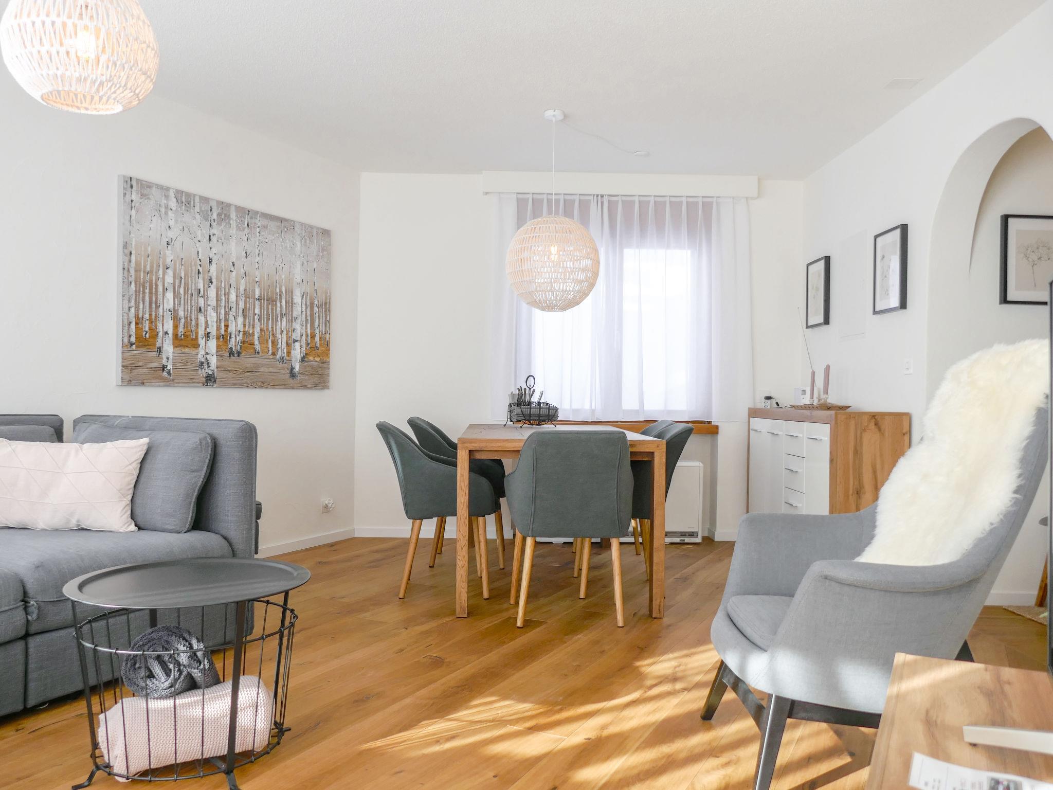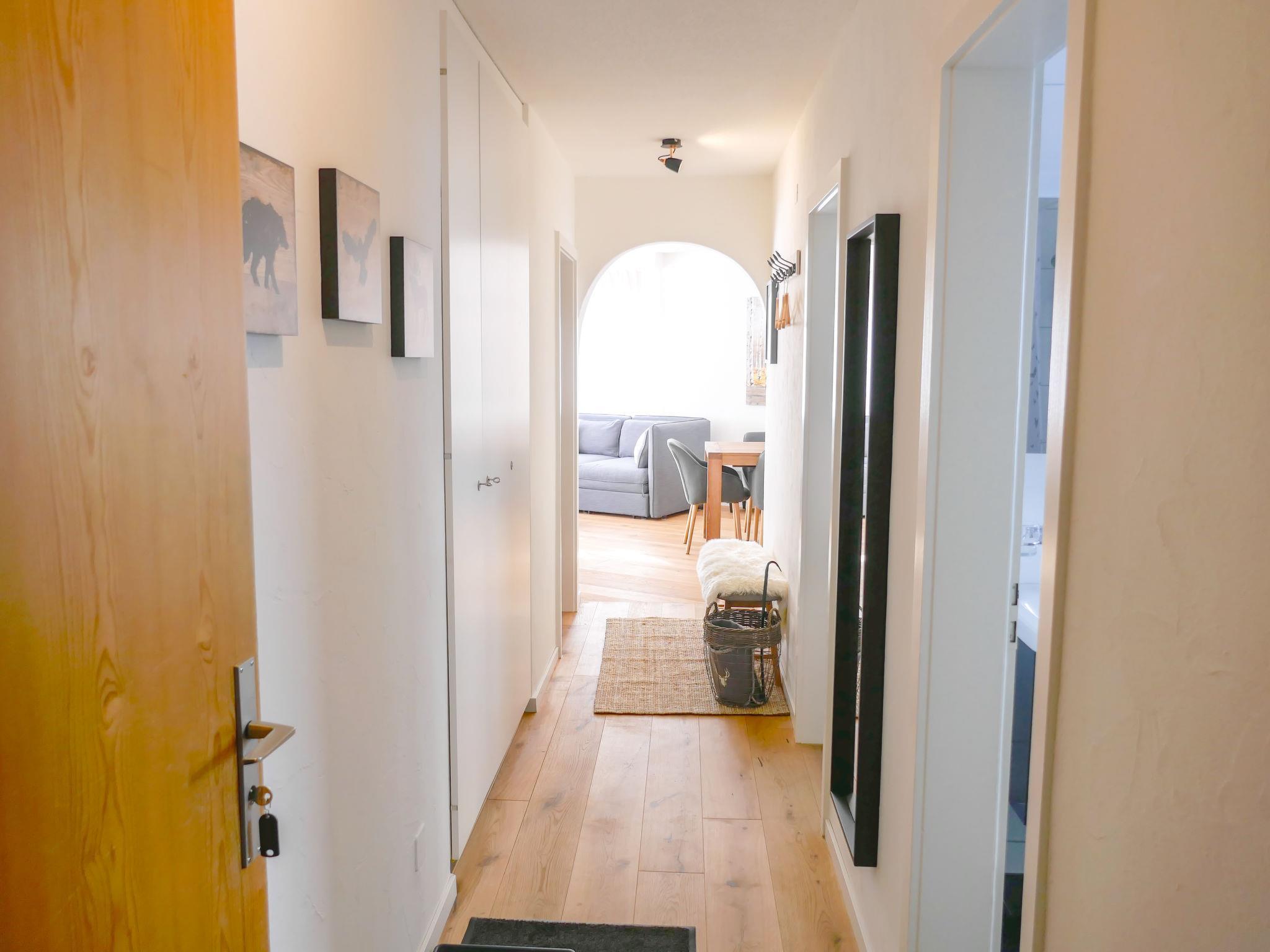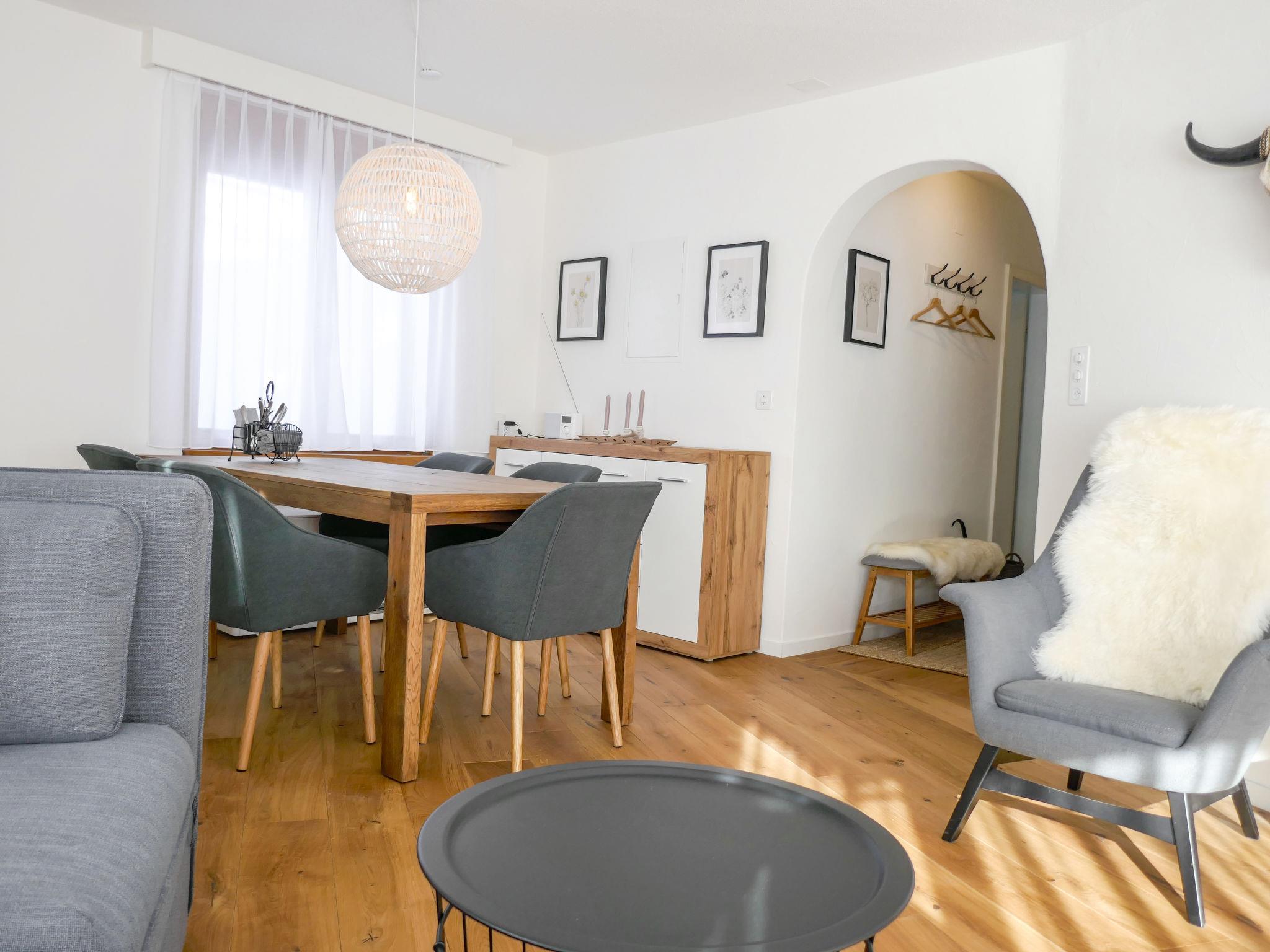 "Albertistrasse Apt. 9", 2-Zimmer-Wohnung 64 m2 im 1. Stock, Südlage. Objekt geeignet für 2 Erwachsene + 2 Kinder. Geräumig und hell, vollständig renoviert im Jahre 2018, sehr schön und geschmackvoll eingerichtet: Wohn-/Esszimmer mit 1 Diwanbett (140 cm), Esstisch, Sat-TV, Flachbildschirm und E-Heizung. Ausgang zum Balkon, Richtung Süden. 1 Zimmer mit 1 Doppelbett (2 x 90 cm). Küche (Backofen, Geschirrspüler, 4 Glaskeramikplatten, Tiefkühler, elektrische Kaffeemaschine, Kapseln für die Kaffeemaschine (Nespresso) extra, Fondue Set (Chinoise, Käse)). Bad/Dusche/WC. E-Heizung, Fussbodenheizung. Parkettboden. Balkon 8 m2, Südlage. Balkonmöbel. Sehr schöne Sicht auf die Berge, die Landschaft und die Ortschaft. Zur Verfügung: Waschmaschine (extra). Wäschetrockner (extra). Internet (WLAN, gratis). Parkplatz beim Haus. 2.5 Zimmer-Whg. 10302