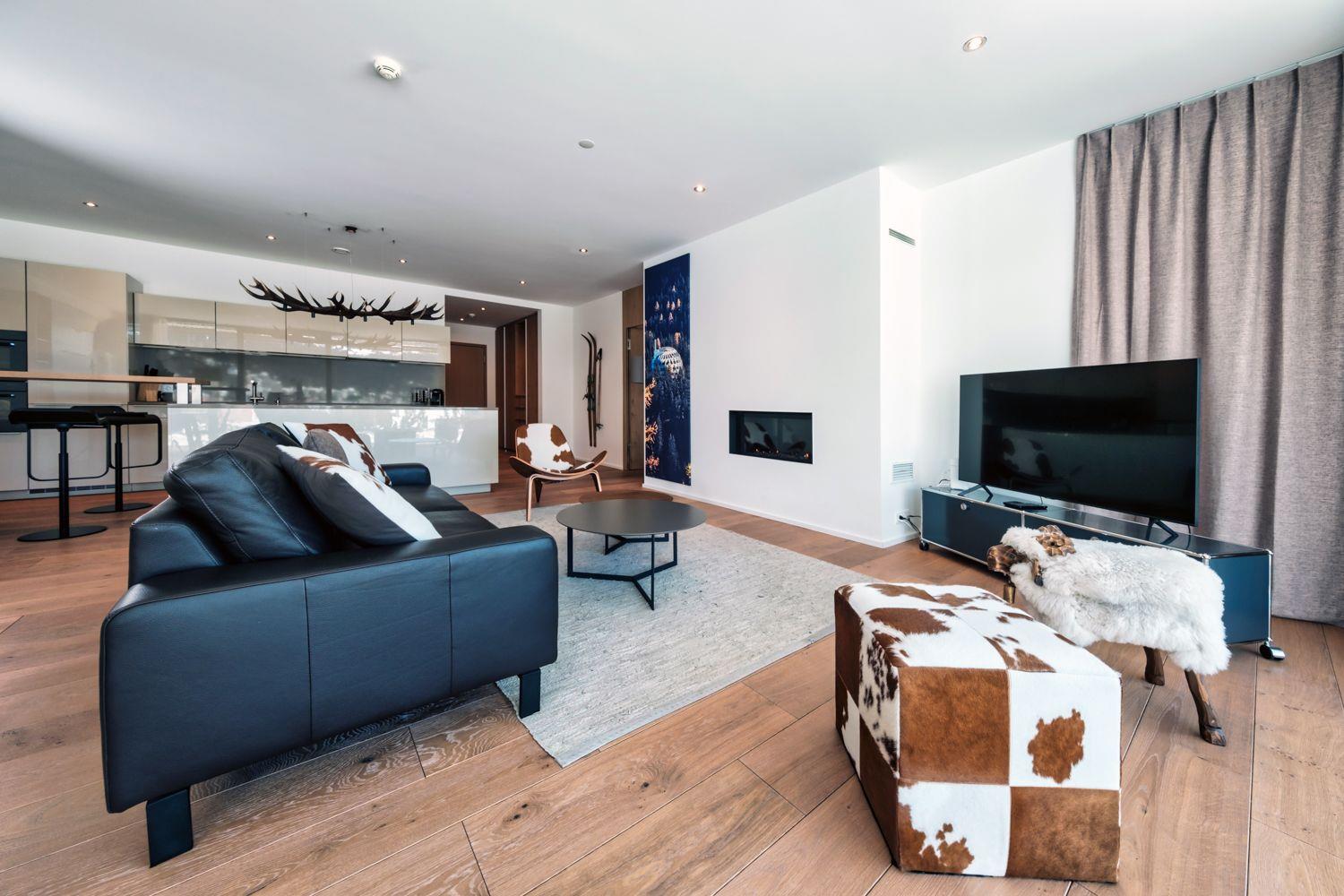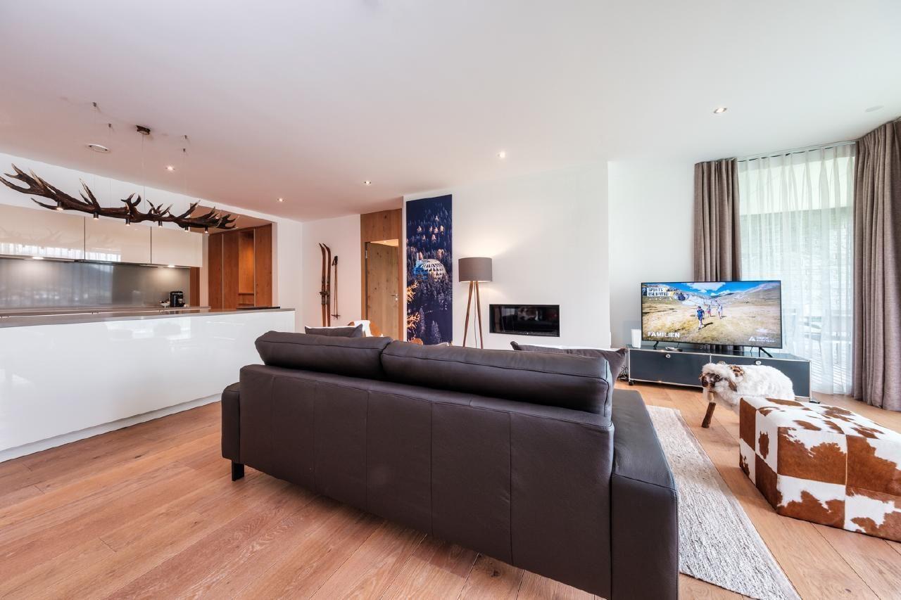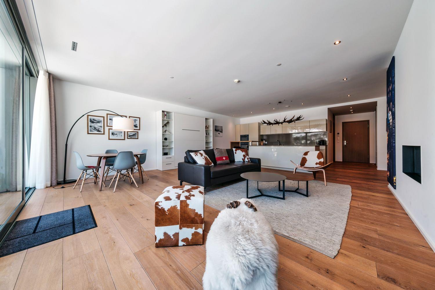 Die Innenausstattung unserer Wohnung spiegelt den Luxus und die Großzügigkeit wider, die Sie von einem 5-Sterne-Aufenthalt erwarten. Mit 115qm bietet sie ausreichend Platz für 4 Personen. Erleben Sie kulinarische Freuden in einer hochmodernen Poggenpohl Küche mit V-ZUG Geräten, von Induktionsherd bis Geschirrspüler. Das Wohn- und Esszimmer, ausgestattet mit einem Leder Sofa, Designer Lounge-Sesseln und einem Gas Kamin, bietet neben Komfort auch einen unbezahlbaren Panoramablick. Das Schlafzimmer verfügt über ein komfortables Doppelbett und einen geräumigen Kleiderschrank. Außerdem stehen zwei voll ausgestattete Bäder mit qualitativ hochwertigen Badezusätzen zur Verfügung.
