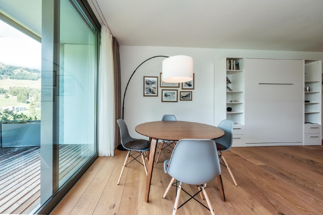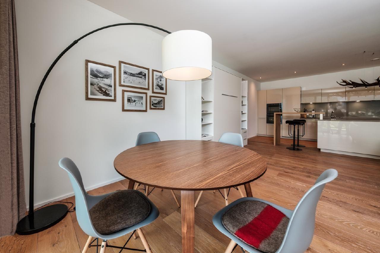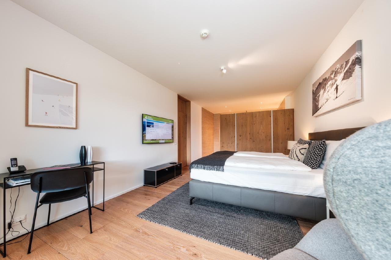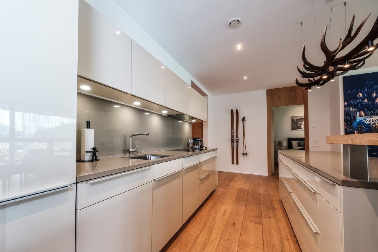 Die Innenausstattung unserer Wohnung spiegelt den Luxus und die Großzügigkeit wider, die Sie von einem 5-Sterne-Aufenthalt erwarten. Mit 115qm bietet sie ausreichend Platz für 4 Personen. Erleben Sie kulinarische Freuden in einer hochmodernen Poggenpohl Küche mit V-ZUG Geräten, von Induktionsherd bis Geschirrspüler. Das Wohn- und Esszimmer, ausgestattet mit einem Leder Sofa, Designer Lounge-Sesseln und einem Gas Kamin, bietet neben Komfort auch einen unbezahlbaren Panoramablick. Das Schlafzimmer verfügt über ein komfortables Doppelbett und einen geräumigen Kleiderschrank. Außerdem stehen zwei voll ausgestattete Bäder mit qualitativ hochwertigen Badezusätzen zur Verfügung.