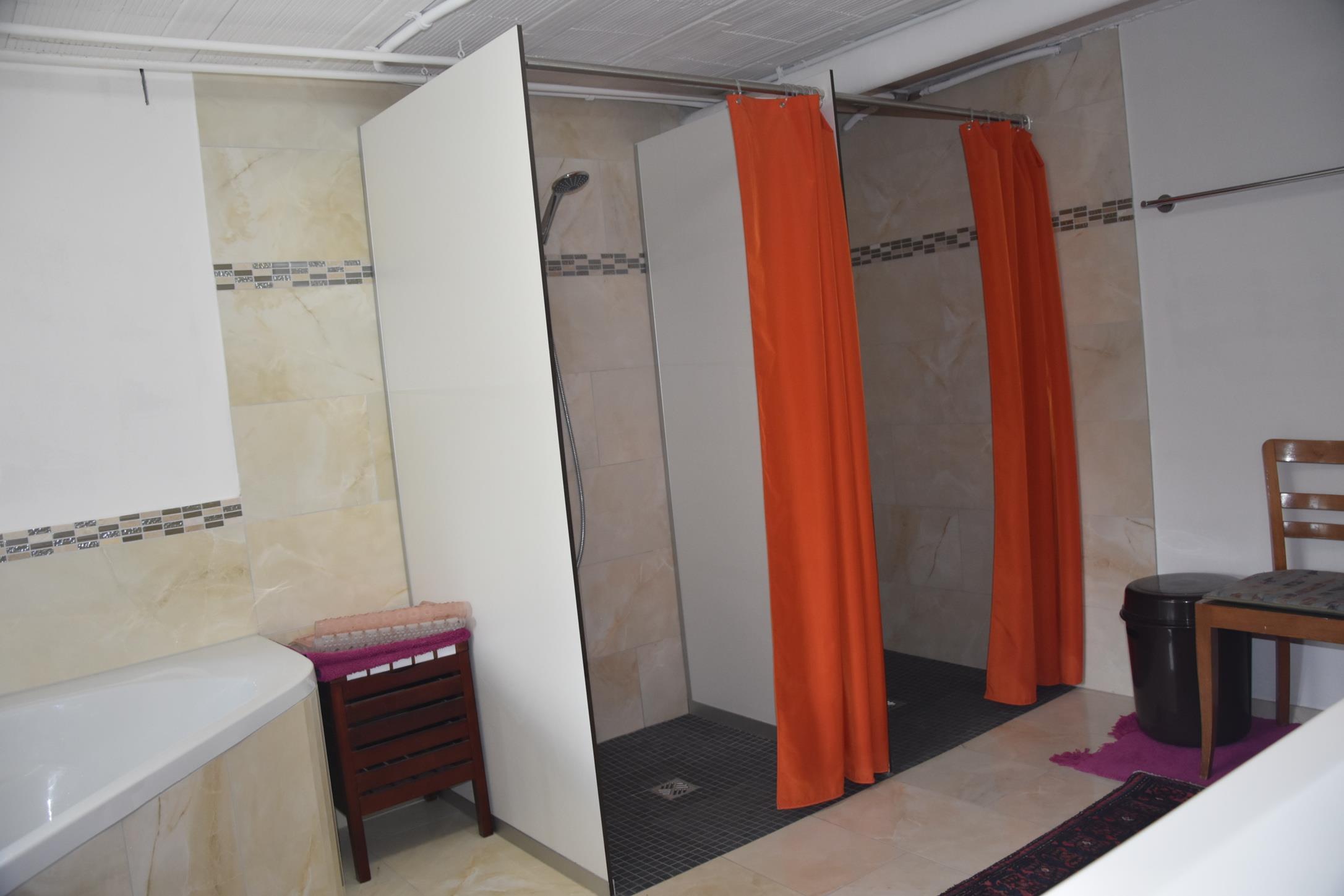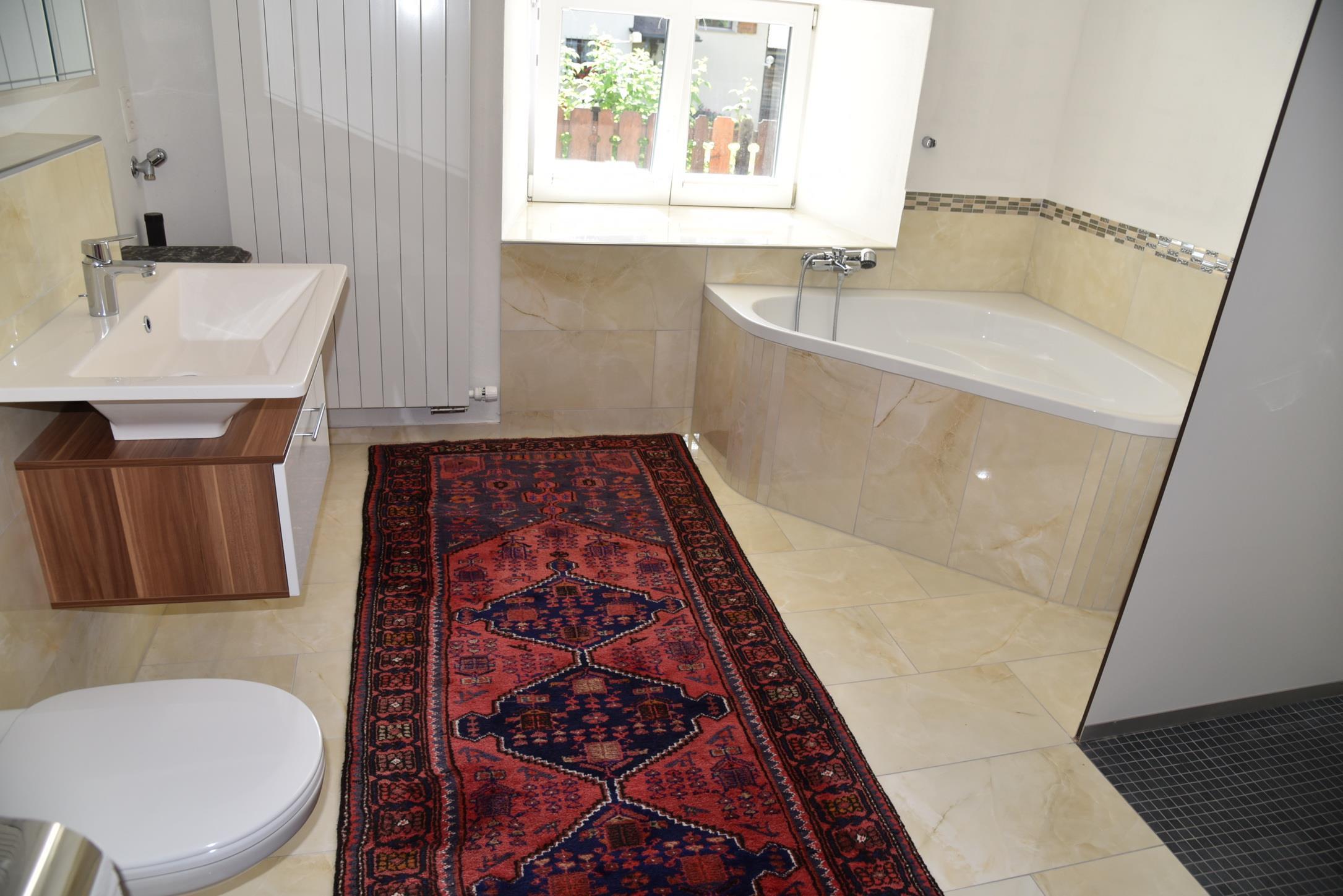 Grosses Badezimmer mit einer Eckbadewanne, 2 Duschkabinen und WC. Im 3. Obergeschoss befindet sich ein weiteres Badezimmer mit WC.