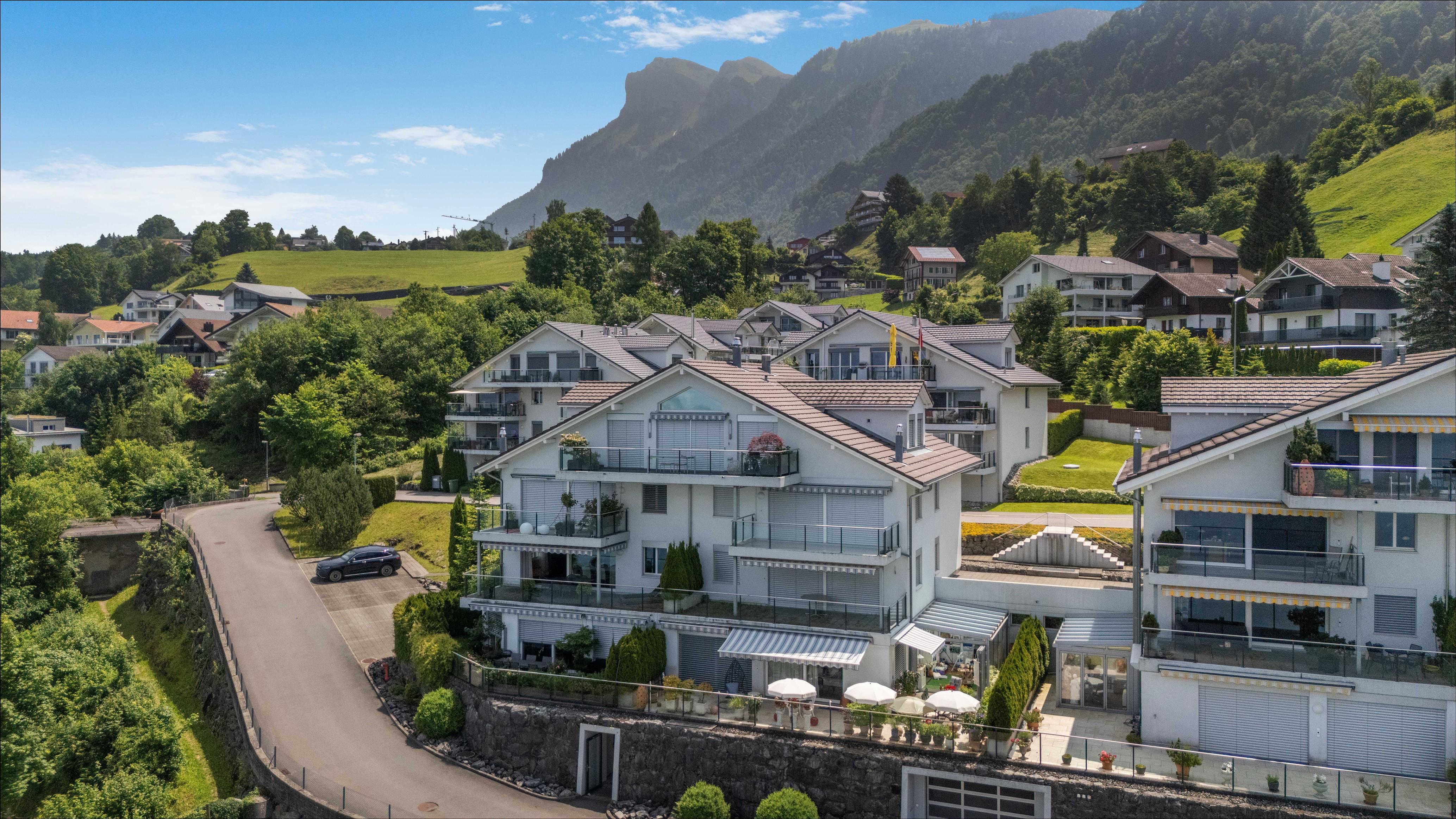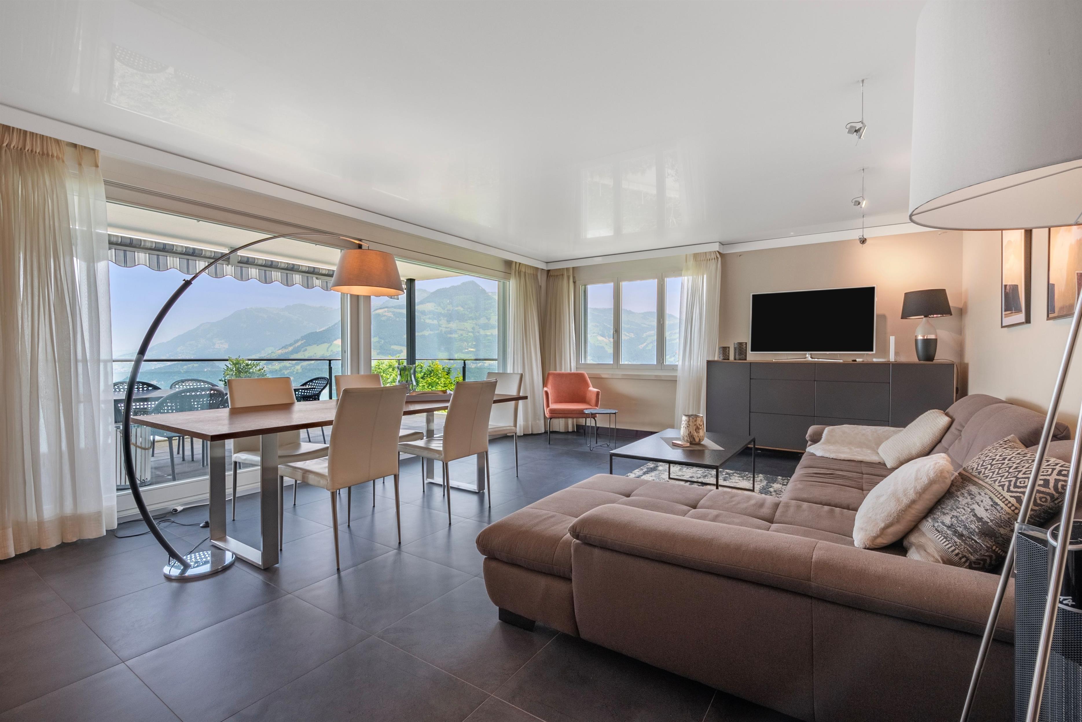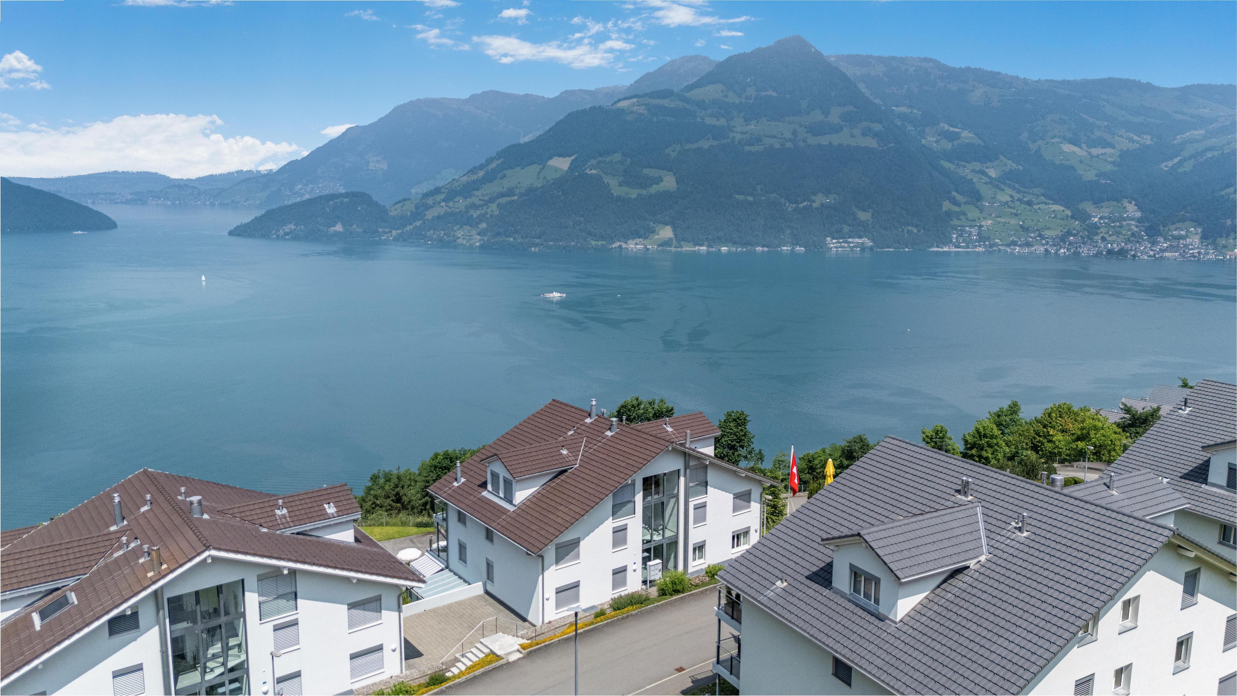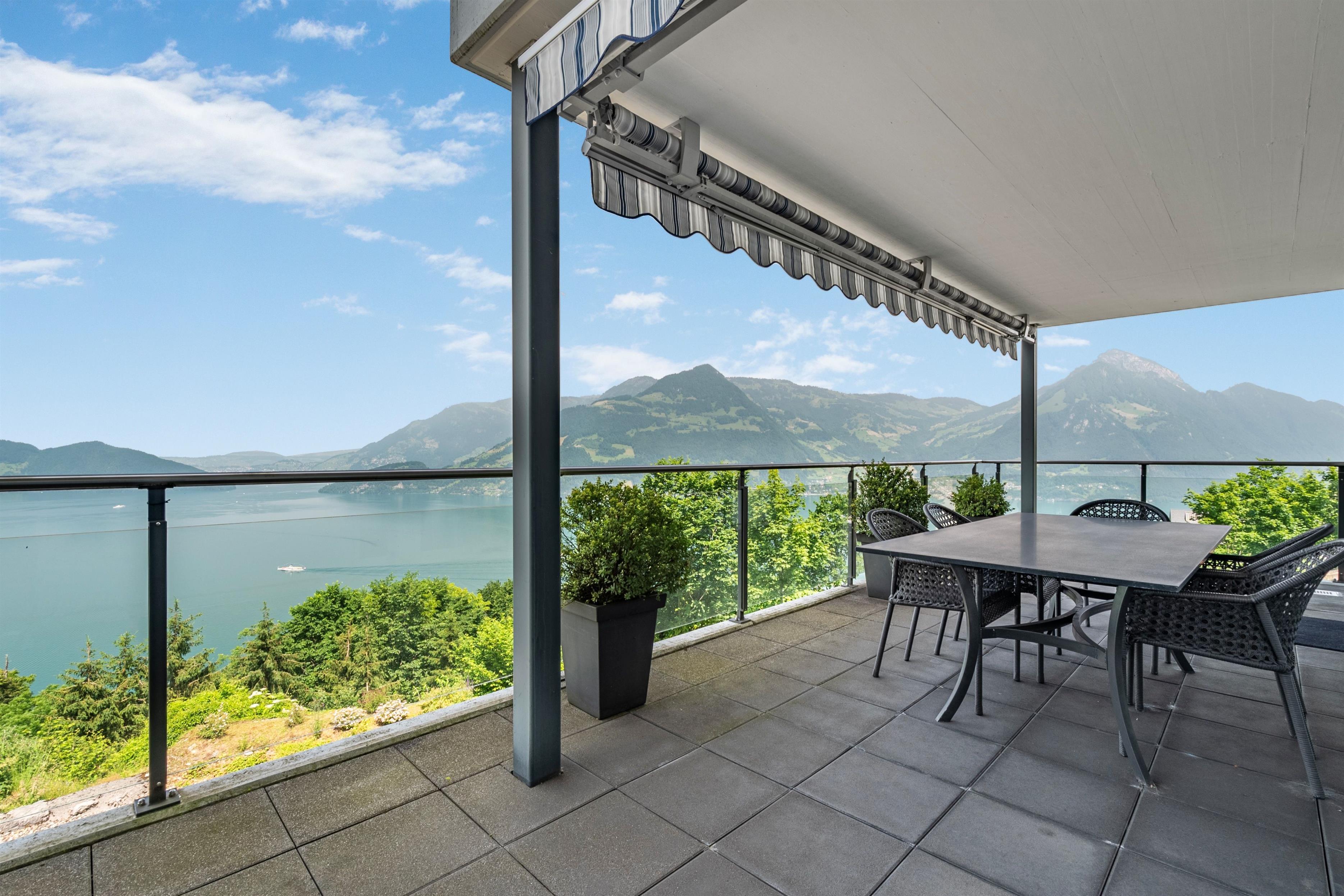 Traumhafte Aussicht über den Vierwaldstättersee in Richtung Bürgenstock (20 km entfernt) und Rigi. Emmetten liegt 25 km von Luzern und 54 km von Andermatt entfernt auf einer voralpinen Terrasse ca. 300 m über dem Vierwaldstättersee. Der Autobahnanschluss an die A2 (Gotthardroute) ist in 5 Autominuten erreichbar. Fünf Seilbahnen erschliessen die Wander- und Wintersportgebiete Emmetten, Stockhütte, Klewenalp und Niederbauen.
