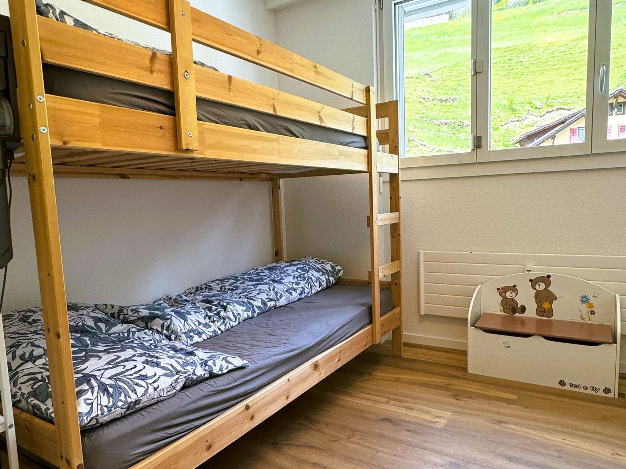 3-Zimmerwohnung im 2. Stock: Wohn/Esszimmer mit TV, 1 Schlafzimmer mit Doppelbett, 1 Kinderzimmer mit Einzelbett und 1 x 2 Kajütenbetten. Küche, Dusche/WC.