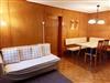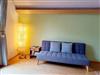 Wohn/Schlafzimmer: Tisch mit Eckbank, Doppelbett, Stockbett, Nostalgie-Kinderbett, Kleiderschrank, Sofa, Fernseher