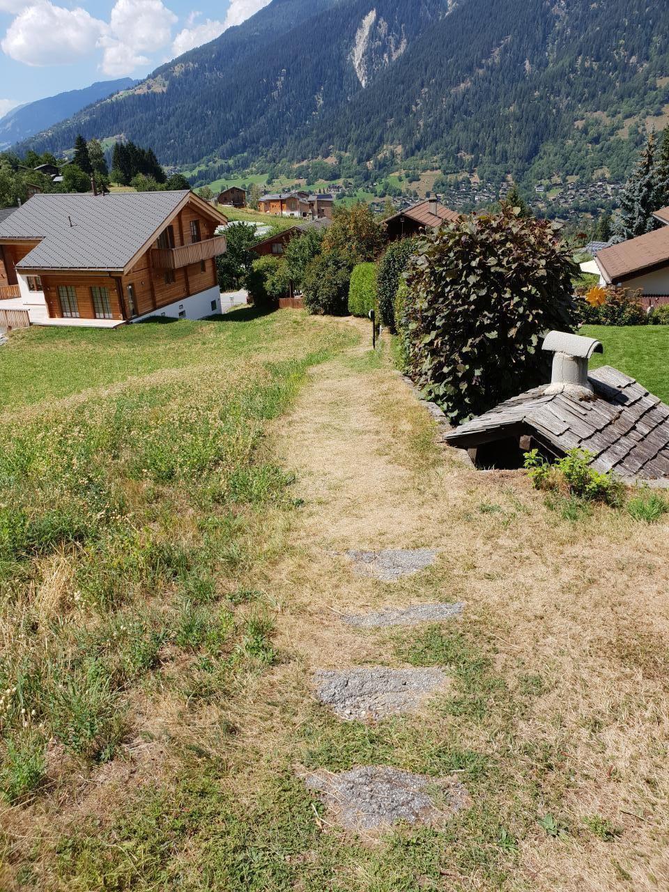 Das Haus hat keine direkte Zufahrt. Der Weg vom Parkplatz geht über ein paar Stufen und eine Treppe, danach einen ca. 60 Meter langen, bergauf führenden Fussweg zum Chalet.