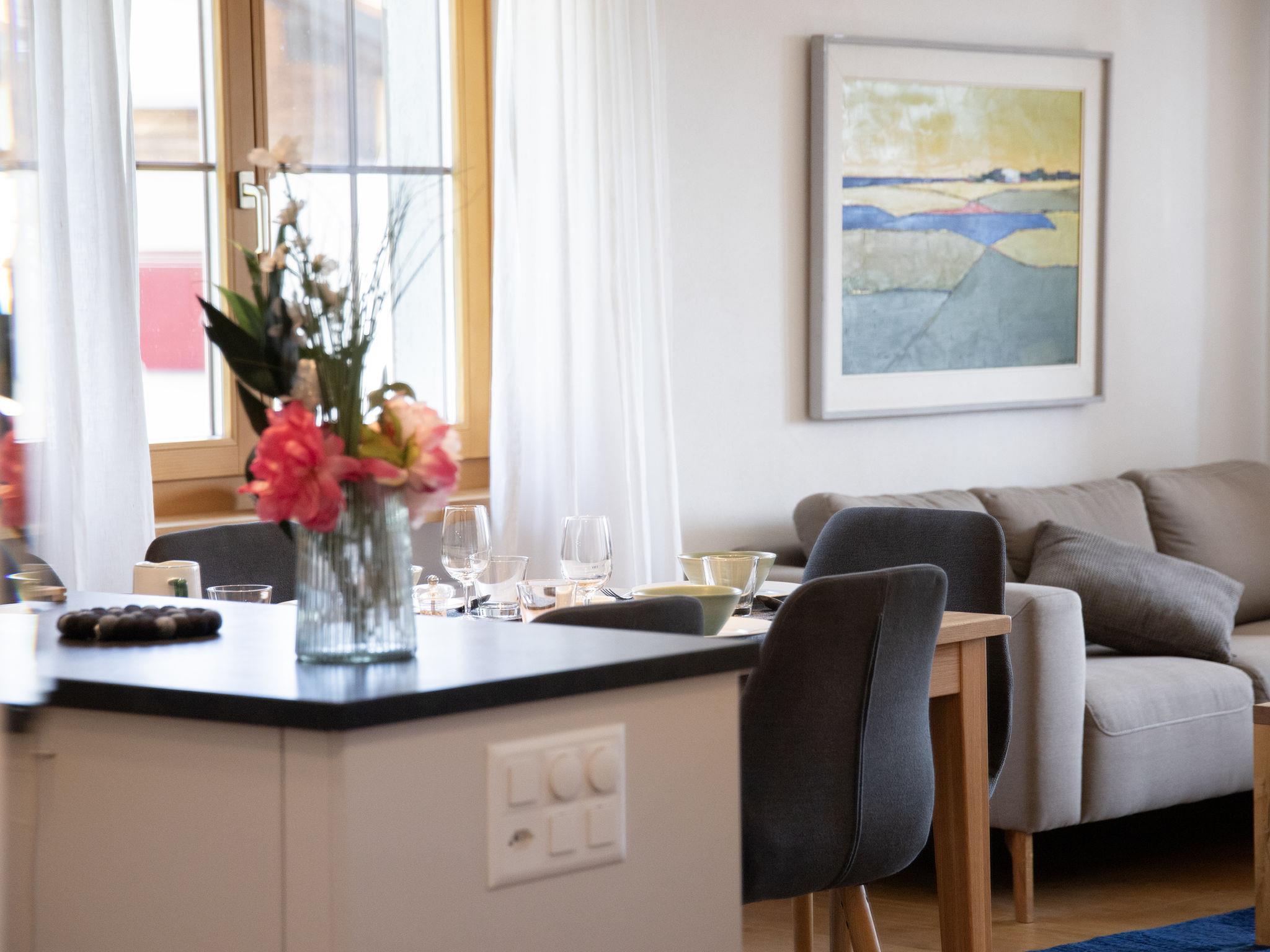 "La Siala Apt.7", 4-Zimmer-Wohnung 60 m2 im 2. Stock. Komfortabel und gemütlich eingerichtet: Wohn-/Esszimmer mit Kabel-TV (Flachbildschirm). Ausgang zum Balkon. 1 Doppelzimmer. 2 Zimmer, jedes Zimmer mit 1 Bett und 1 x 1 Etagenbetten. Offene Küche (Backofen, Geschirrspüler, 4 Glaskeramikplatten, Toaster, Wasserkocher, elektrische Kaffeemaschine, Kapseln für die Kaffeemaschine (Nespresso), Racletteofen, Fondue Set (Käse)). Bad/WC, sep. WC. Balkon 8 m2, Südlage. Balkonmöbel. Schöne Sicht auf die Berge, das Tal und die Landschaft. Zur Verfügung: Haartrockner. Internet (WLAN, gratis). Parkplatz Nr. 10, Garage beim Haus. E-Ladestation. Bitte beachten: Nichtraucher-Unterkunft.