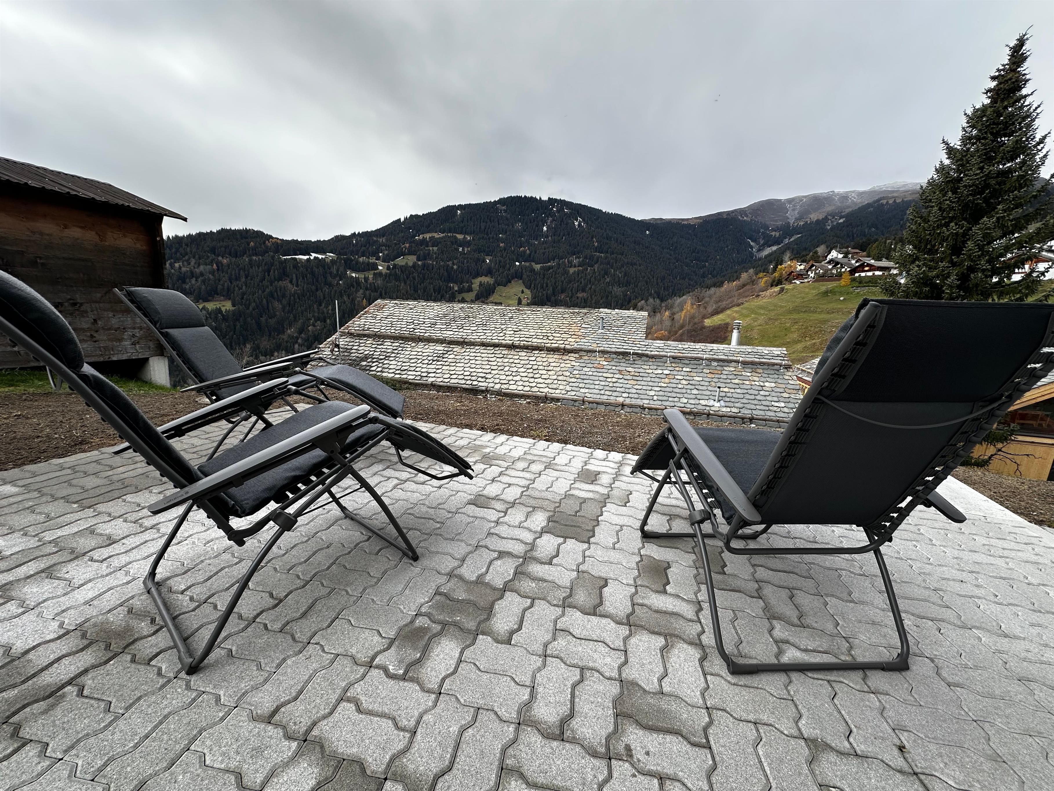 Von der Terrasse aus geniessen Sie eine herrliche Aussicht auf die Bergwelt - diese steht Ihnen zusammen mit den Gästen der Wohnung Casa Ladina 4 für Barbeques zur Verfügung.