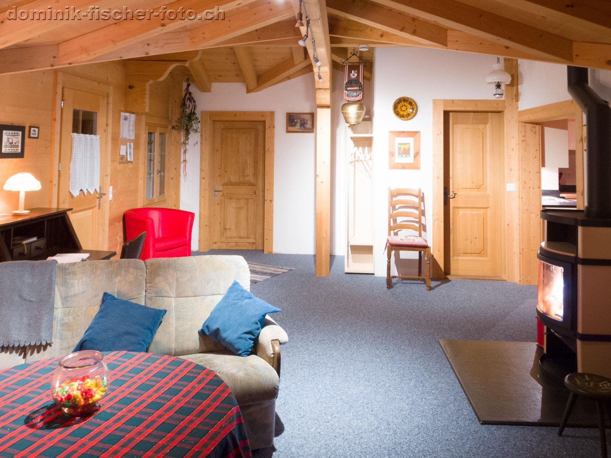 Grosses Wohnzimmer mit Sofa und Schwedenofen. Offene Küche (u.a. ausgestattet mit Backofen, Kühlschrank mit Gefrierfach, Glaskeramikherd, Wasserkocher, Kapsel-Kaffeemaschine (Nespresso), Filter-Kaffeemaschine, Fondue- und Raclette-Set) und weiteren Küchenuntensilien. 2 Doppelzimmer mit je zwei Einzelbetten (90x200cm) und (90x190cm). 1 Badezimmer mit Dusche und WC. WiFi. Wichtiger Hinweis: Bei Belegung bis 2 Personen (tieferer Preis) steht nur ein Schlafzimmer zur Verfügung. Das zweite Schlafzimmer bleibt abgeschlossen.