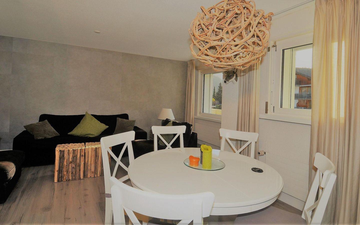 Die 3.5-Zimmerwohnung liegt im 2. Stock, ist behaglich eingerichtet und bequem mit Lift zu erreichen. Die Wohnung hat eine Fläche von 80m2. Sie ist folgendermassen ausgestattet: Wohnzimmer mit Sitzecke, Stereoanlage mit CD/DVD, TV, Radio und WiFi und Schreibtischecke. Küche mit Elektroherd, Spülmaschine, Backofen, Kühlschrank mit Gefrierfach, Kaffeemaschine, Wasserkocher. Ein Schlafzimmer mit Doppelbett und ein Schlafzimmer mit 2 Betten und ein Kajuttenbett. 2 Badezimmer, 1 Mal Badewanne / WC und Waschbecken und 1 Mal mit Dusche/ WC und Waschbecken. Die Wohnung verfügt über einen grossen Balkon. Optimale Ausgangspunkt zum Skilaufen und Wandern. Bahnhof, Seilbahn, Einkaufsmöglichkeiten und Kinderspielplatz sind zu Fuss erreichbar. Ski- und Veloraum im Erdgeschoss, Autoeinstellhalle im Untergeschoss. Platz beschränkt. Das Mehrfamilienhaus hat ein Garten/Liegewiese mit Kinderspielplatz.