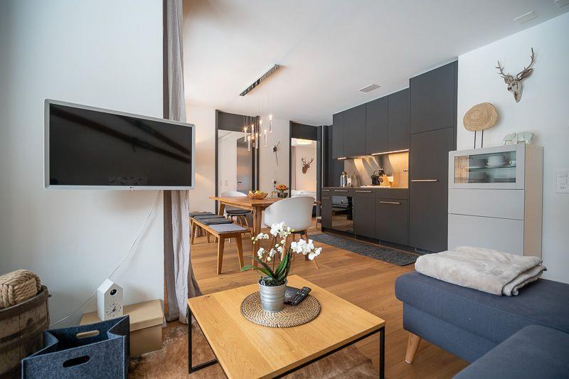 Die Wohnung besticht durch einen gemütlichen Wohnraum mit offener, voll ausgestatteter Küche. Hier finden Sie alles, was Sie für einen entspannten Aufenthalt benötigen, darunter einen Geschirrspüler, einen Herd, einen Backofen, einen Kühlschrank, eine Nespresso-Maschine sowie alle nötigen Kochutensilien. Die Küche ist perfekt, um Ihre Mahlzeiten zuzubereiten und die Zeit gemeinsam zu genießen.