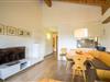 Der Wohnbereich ist mit einem gemütlichen Sofa, einem Fernseher sowie einem Esstisch mit Eckbank ausgestattet - ideal für entspannte Stunden und gesellige Runden.